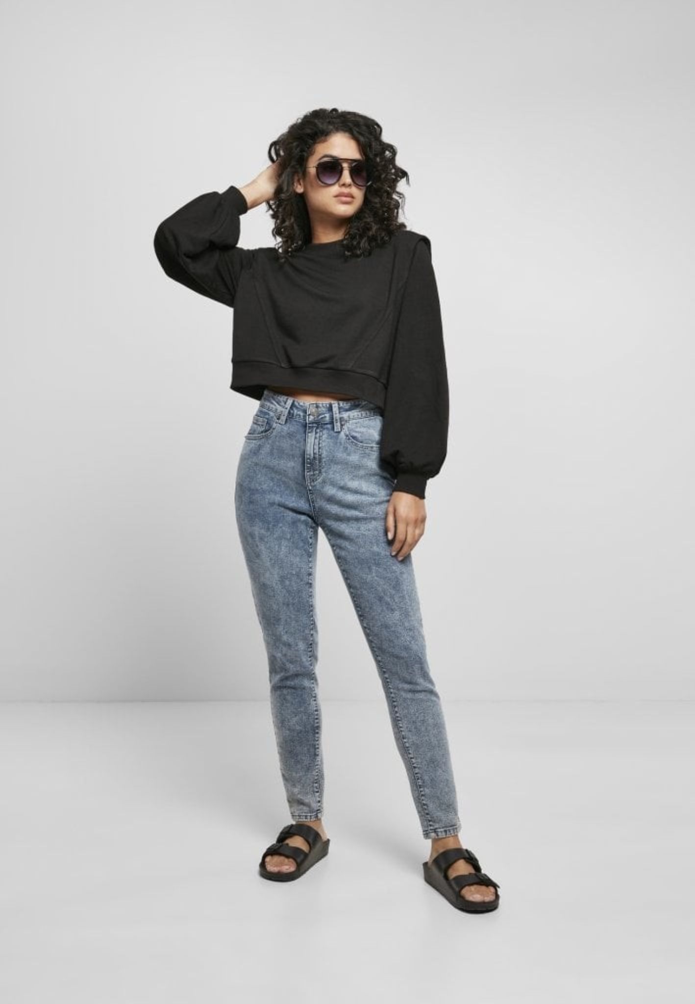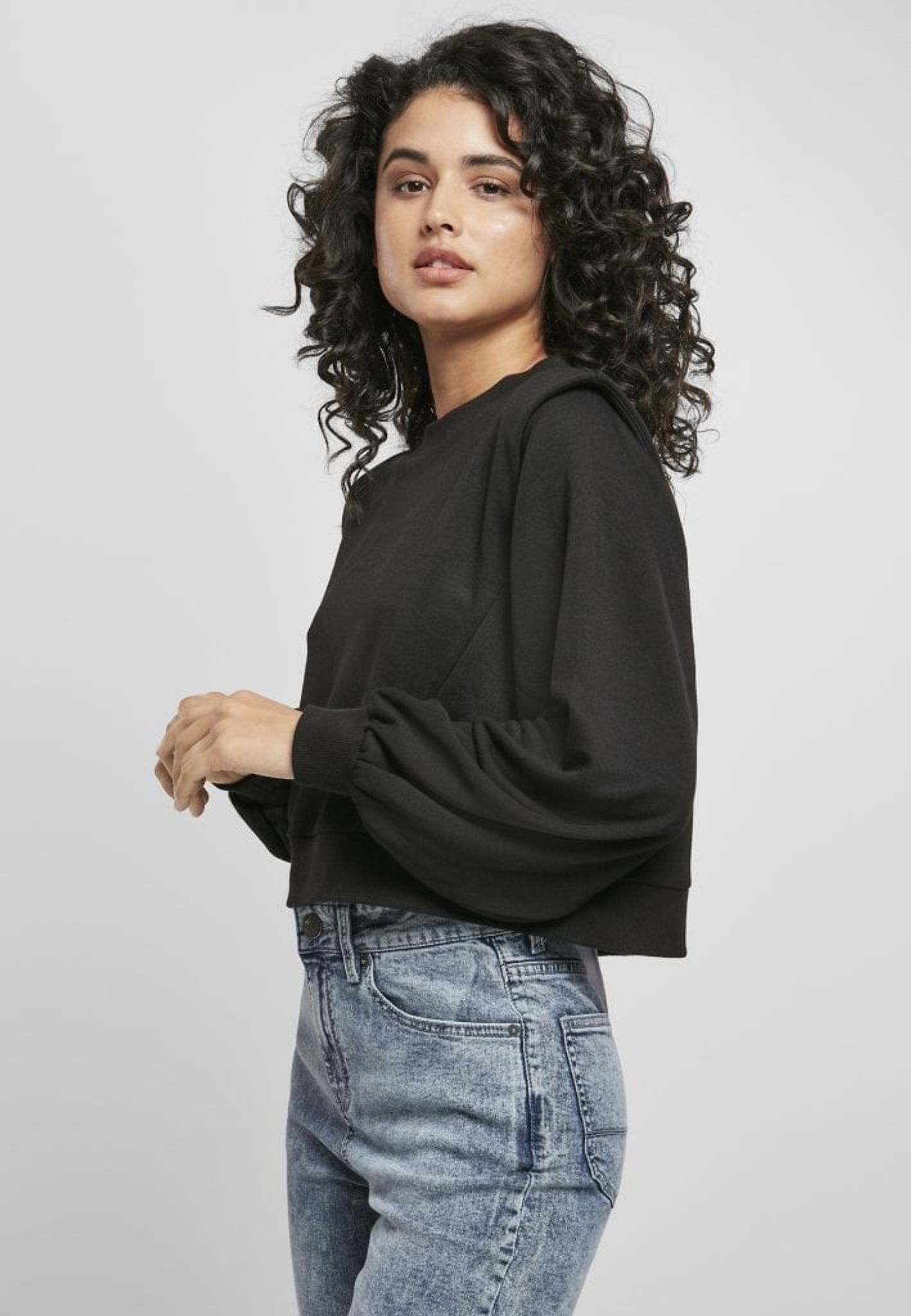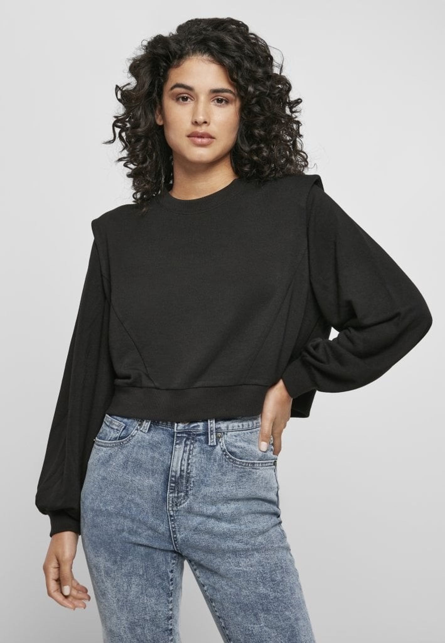 En tröja med rund hals och vida armar med axelvaddar.