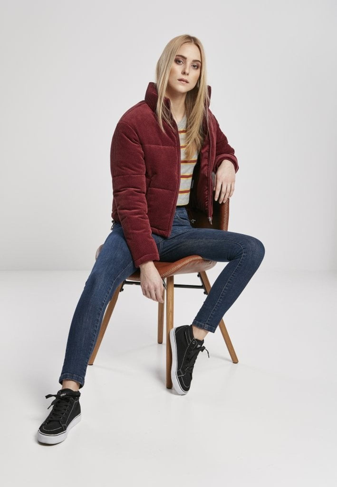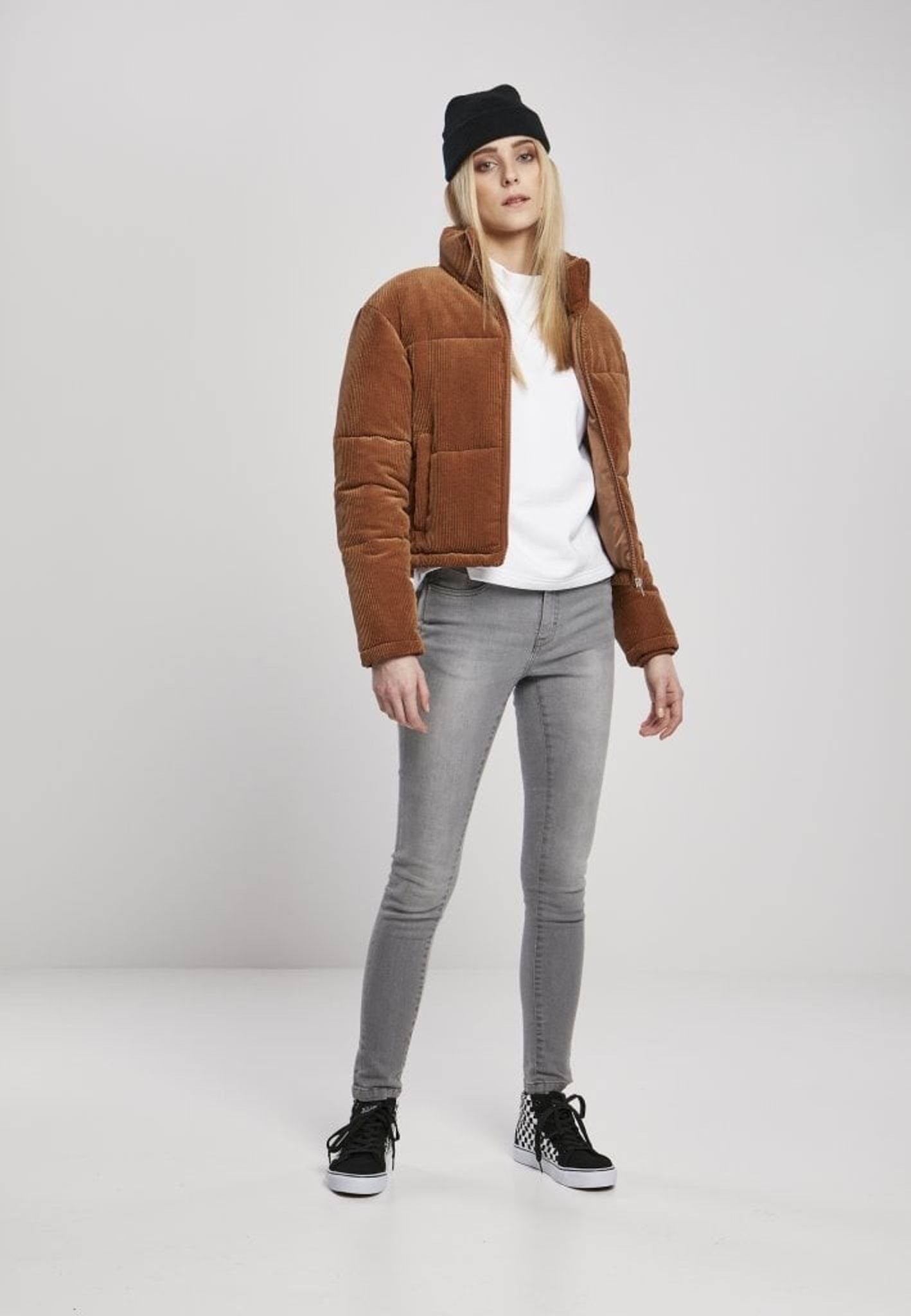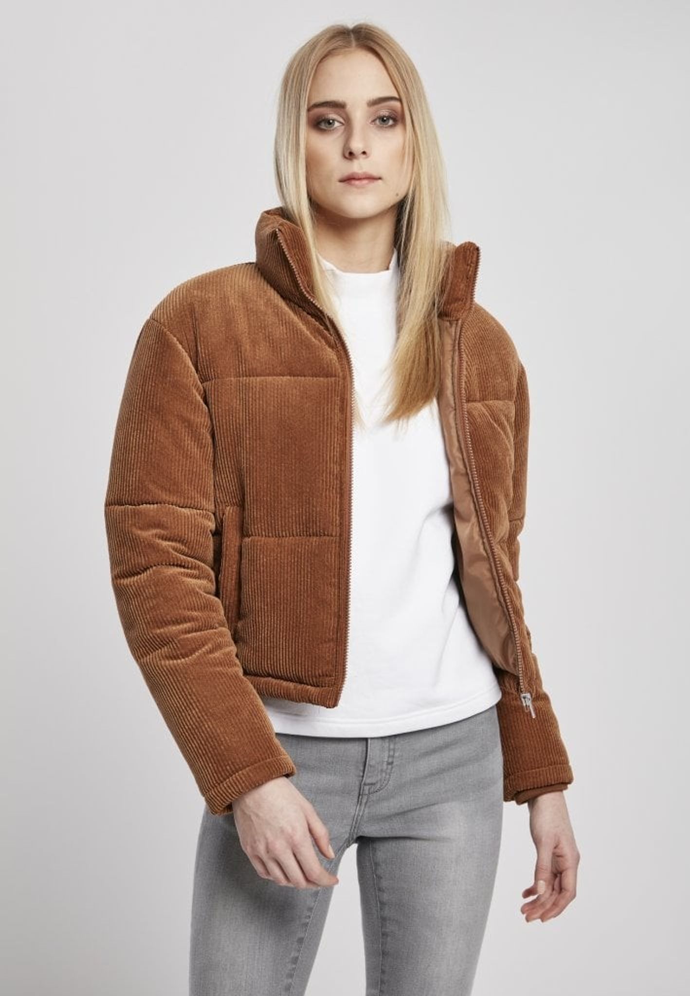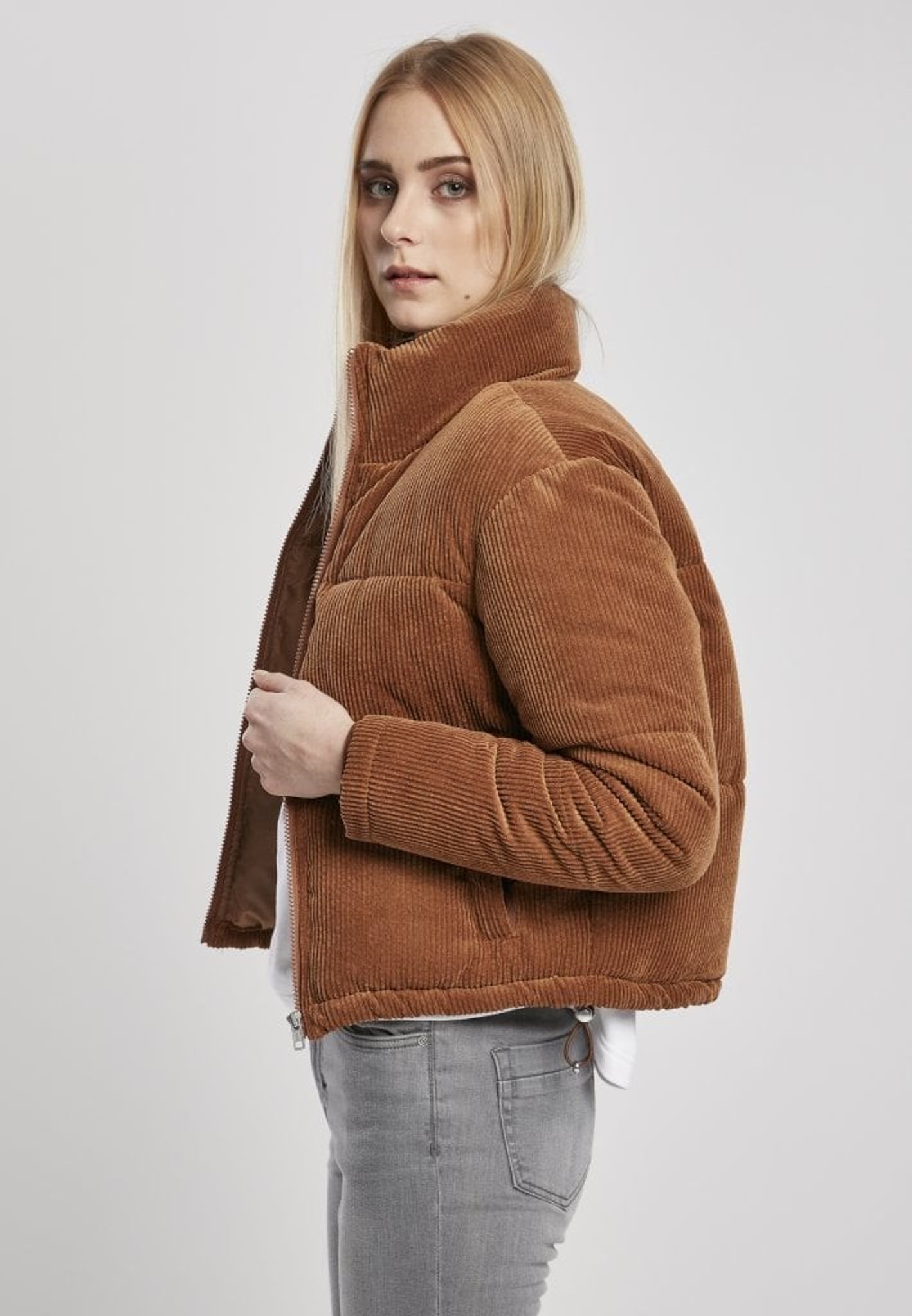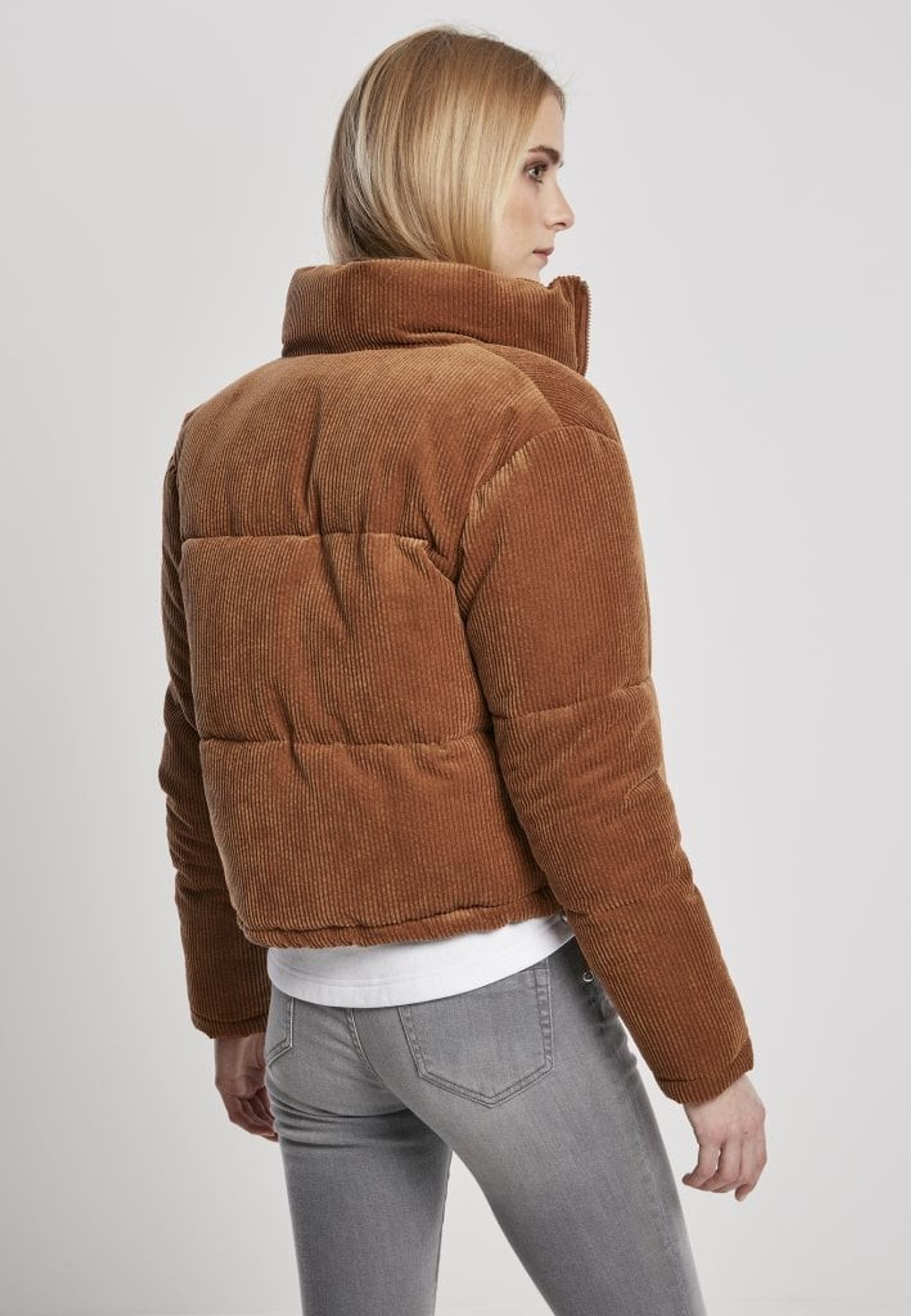 En kort vadderad jacka i manchestertyg med breda ränder.