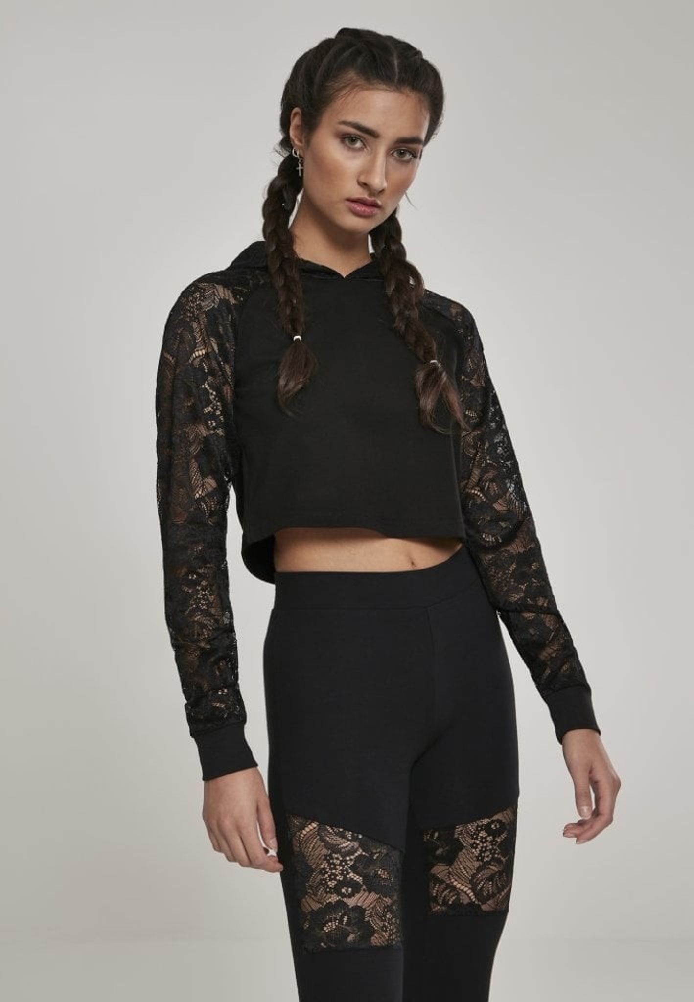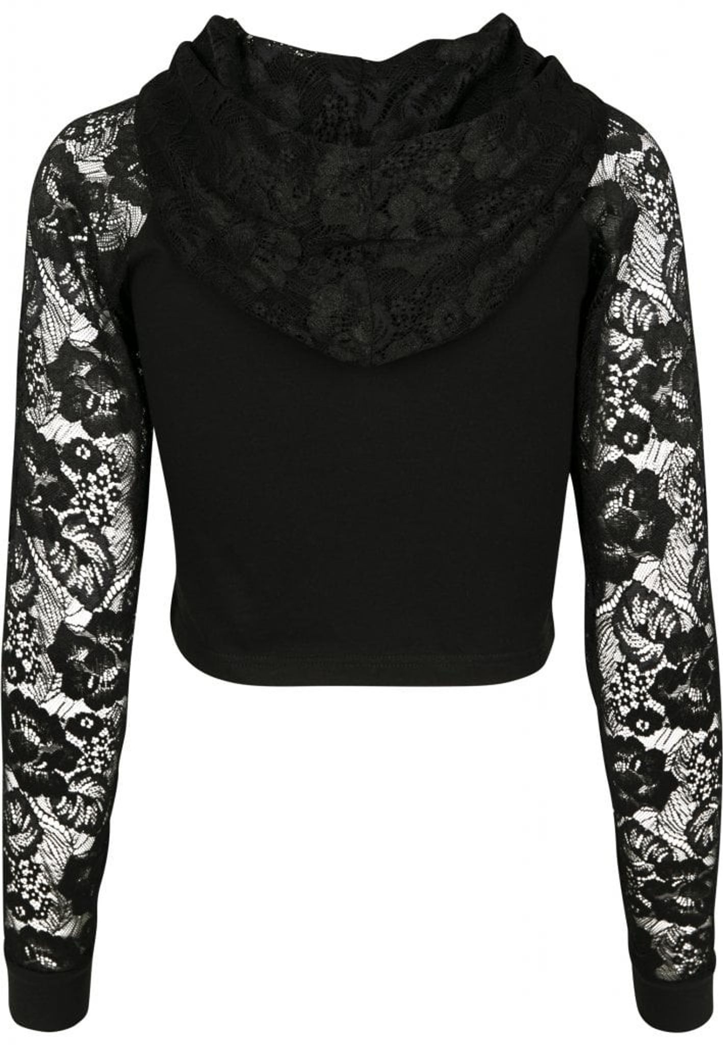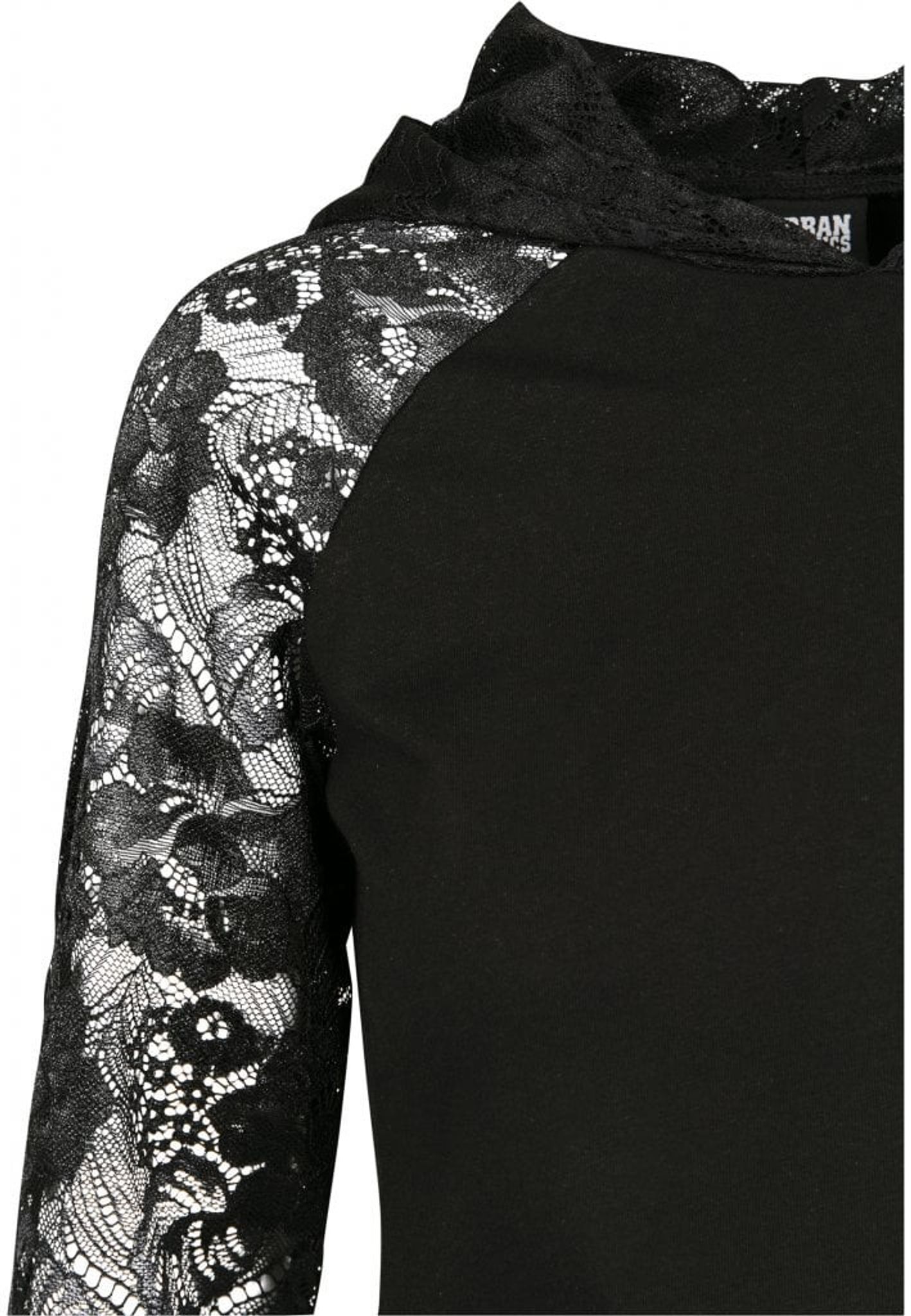En svart sportig huvtröja med raglanärm och spetstyg på armarna.