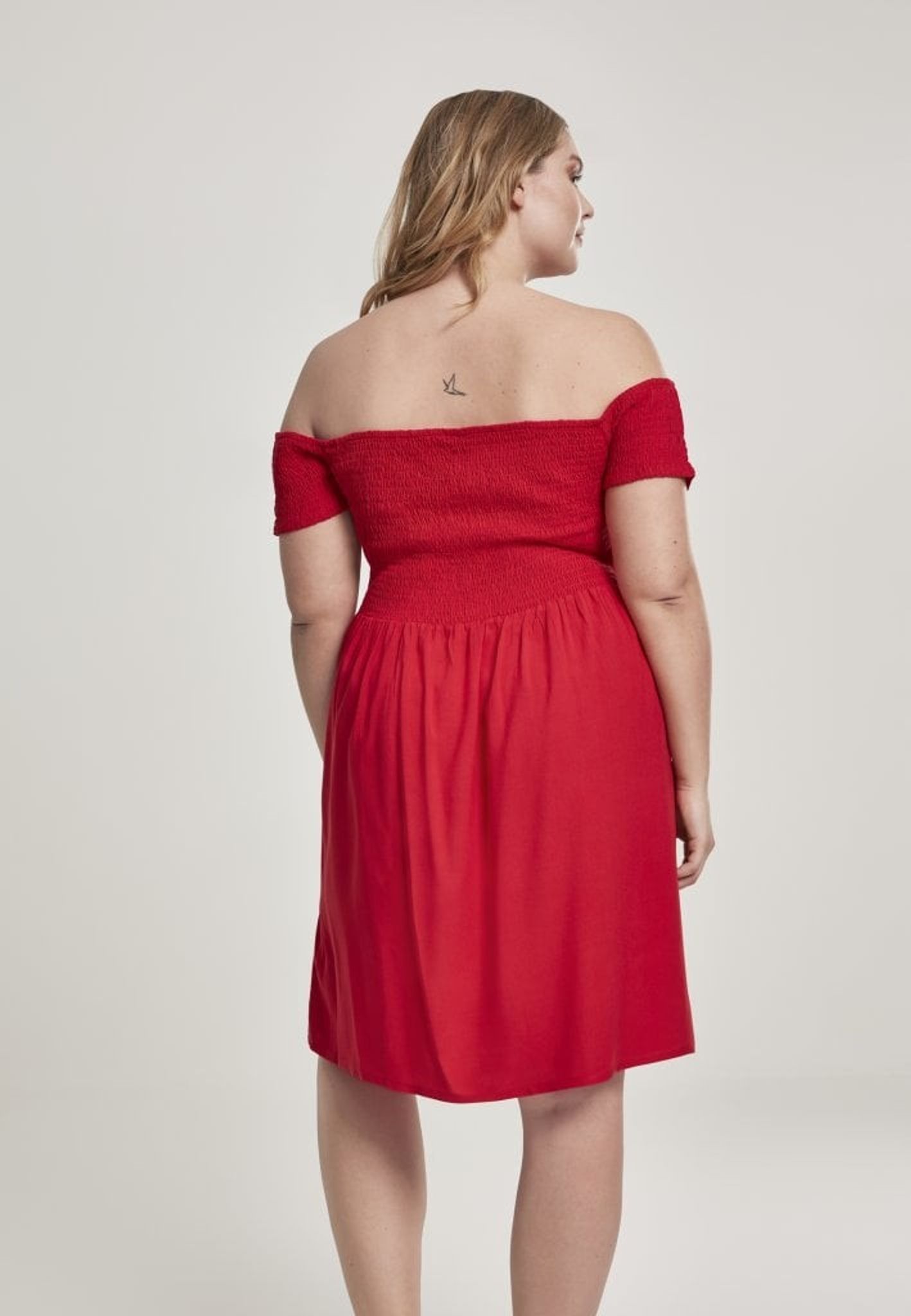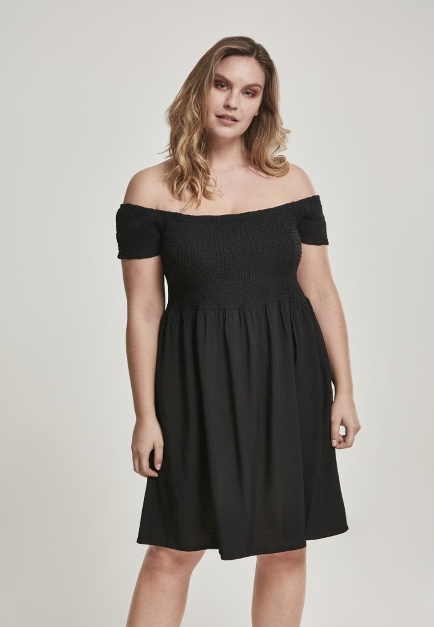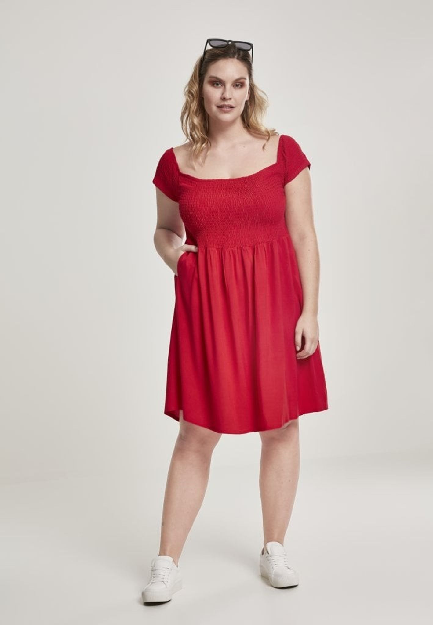 Klänningen har smock över bysten med en liten arm och kjolen är lite klockad och slutar en bit upp på låret.