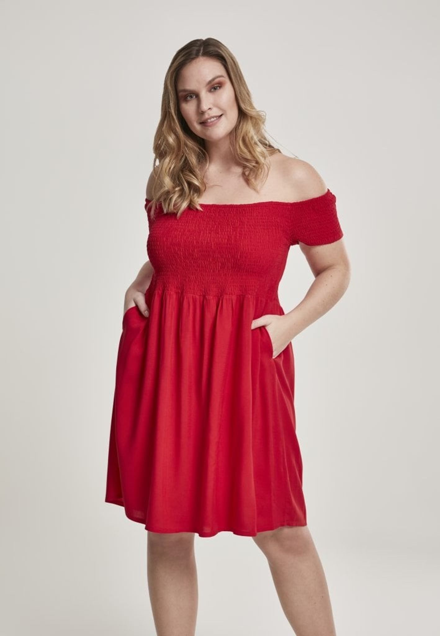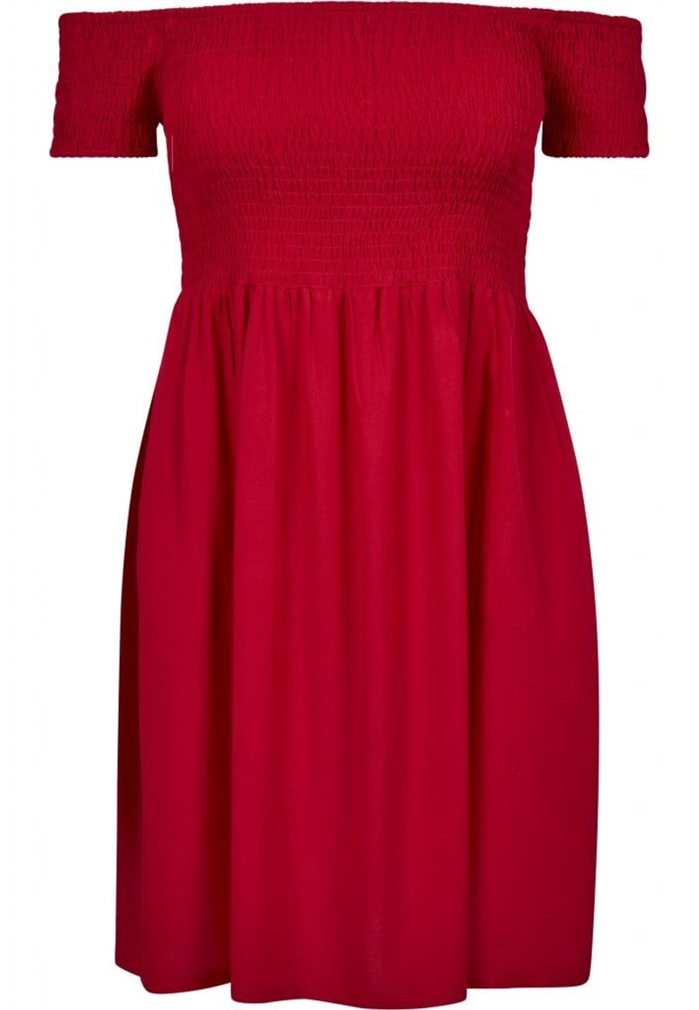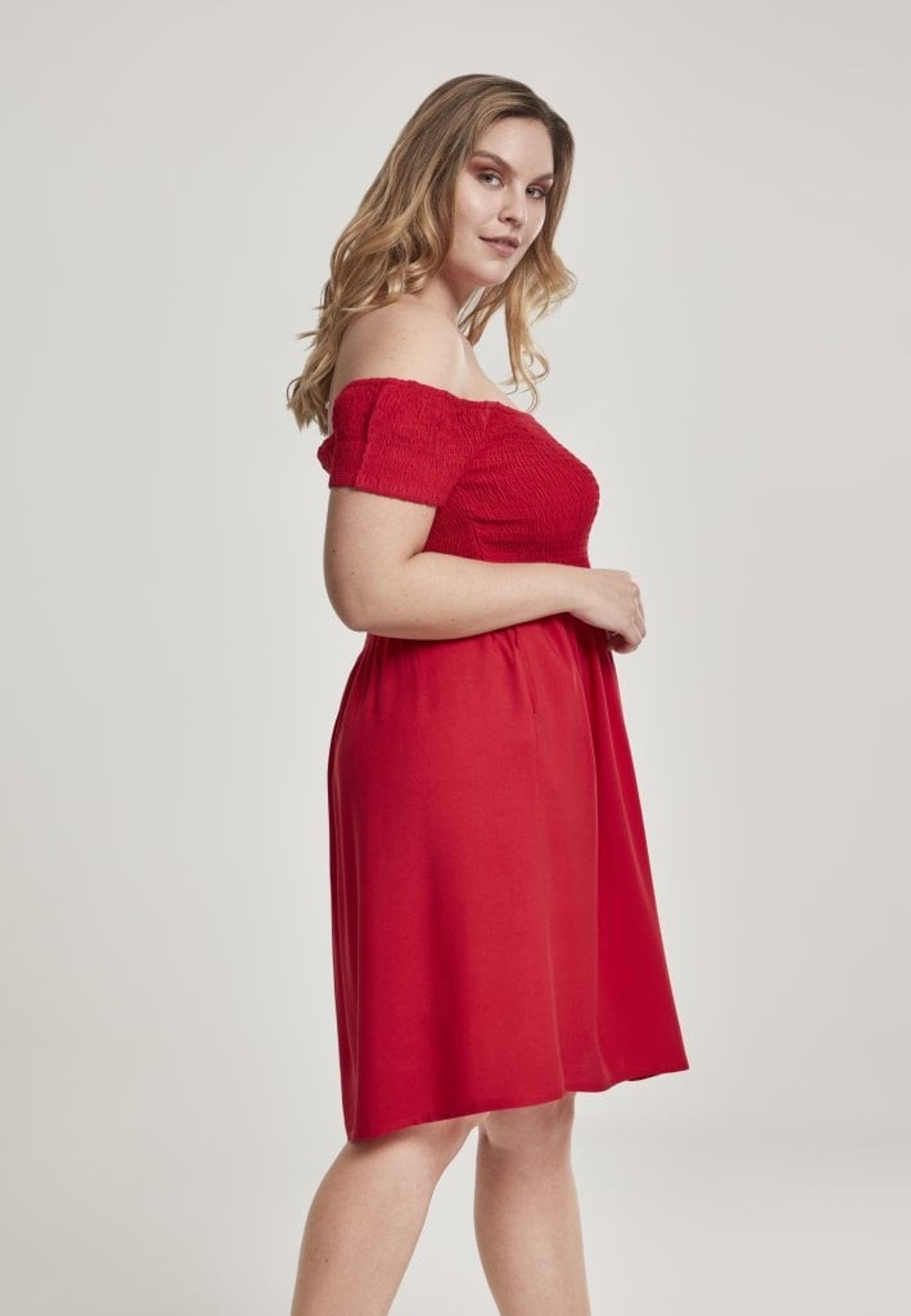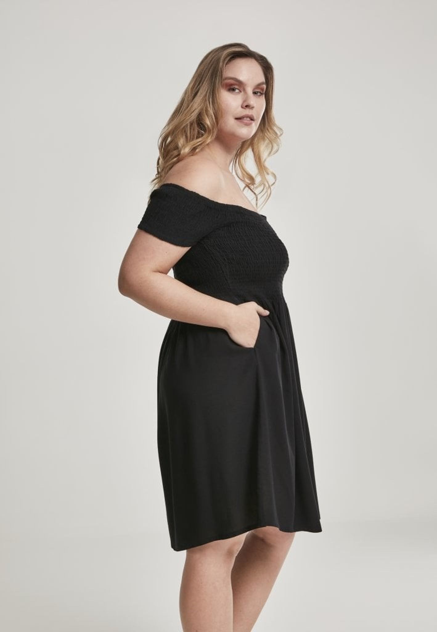 Klänningen har smock över bysten med en liten arm och kjolen är lite klockad och slutar en bit upp på låret.