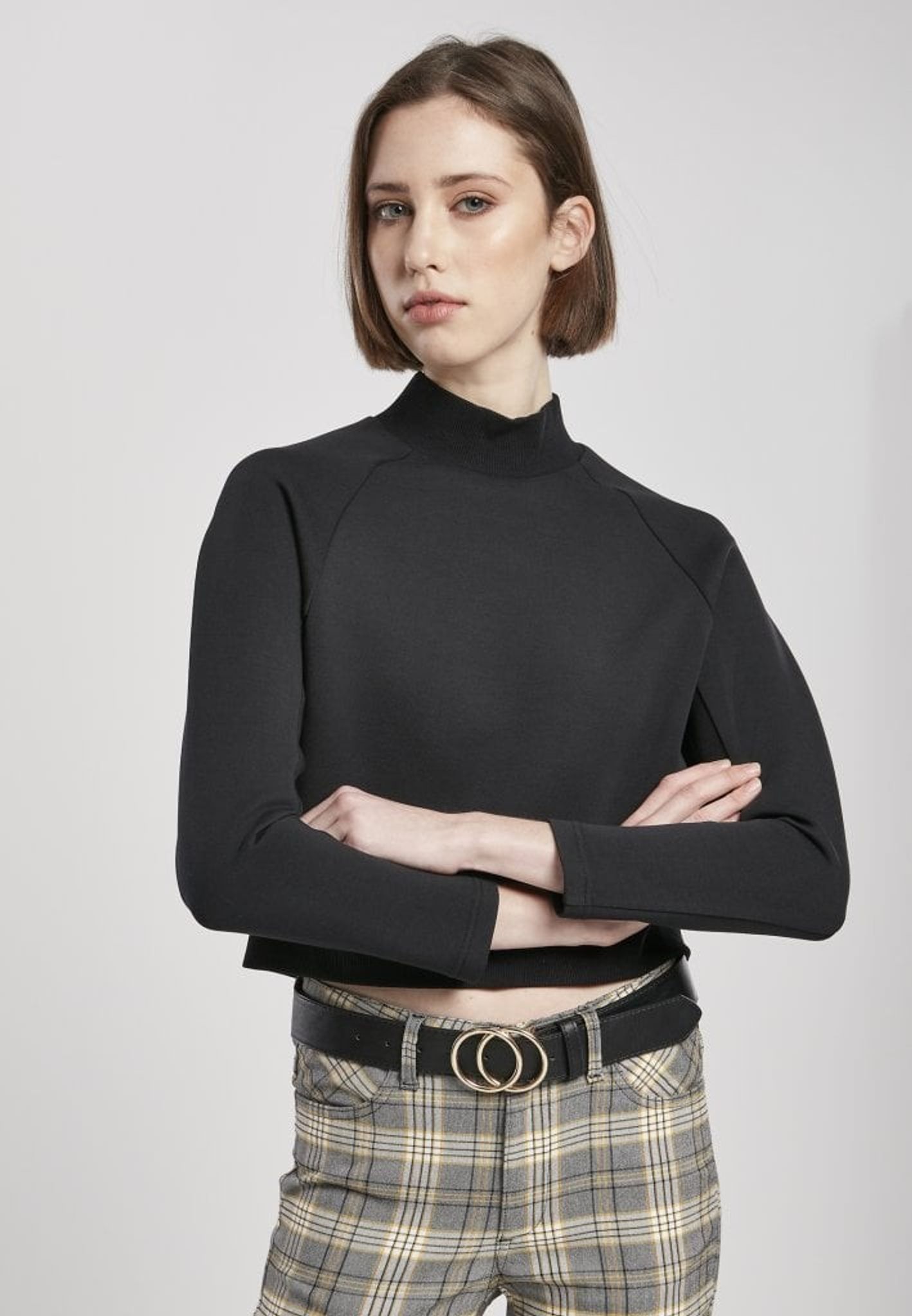 Tröjan har raglanarmar och en turtle hals och i nederkanten är en bred reså.