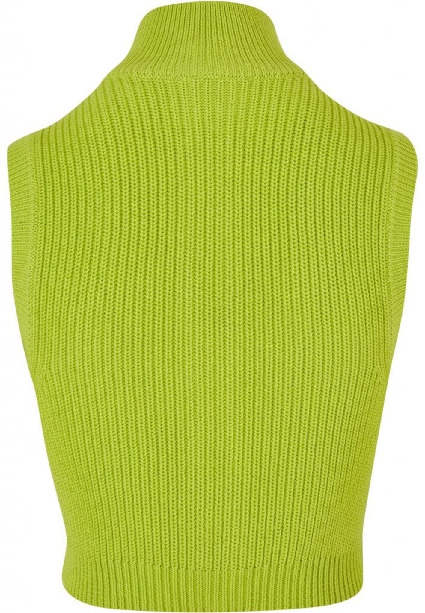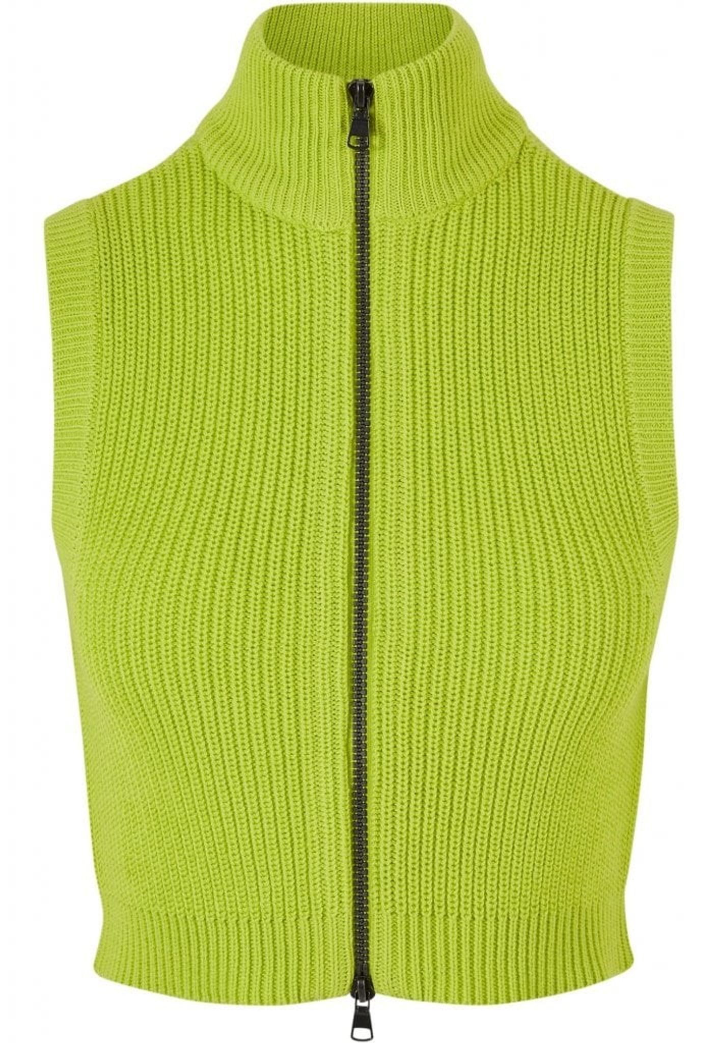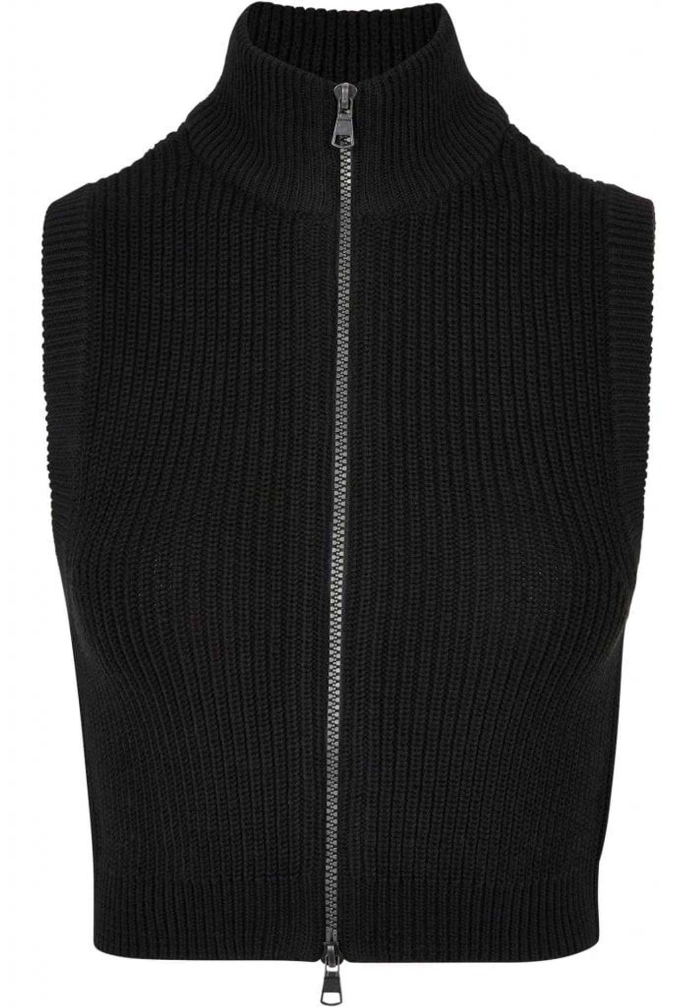 Denna korta stickade väst för damer är både djärv och sofistikerad i sin design. Den är avskuren och har en hög ståkrage och stängs med en tvåvägsdragkedja.