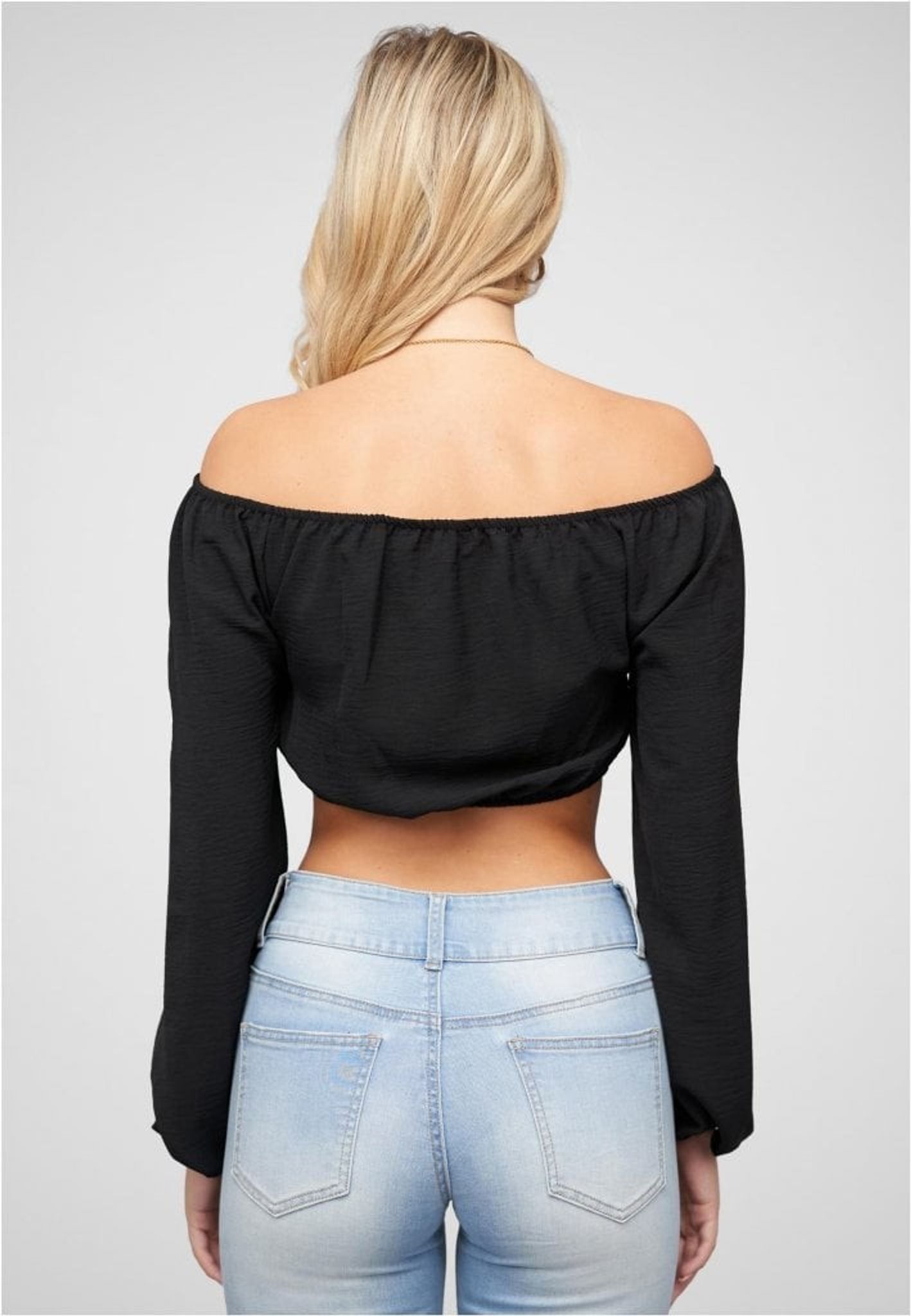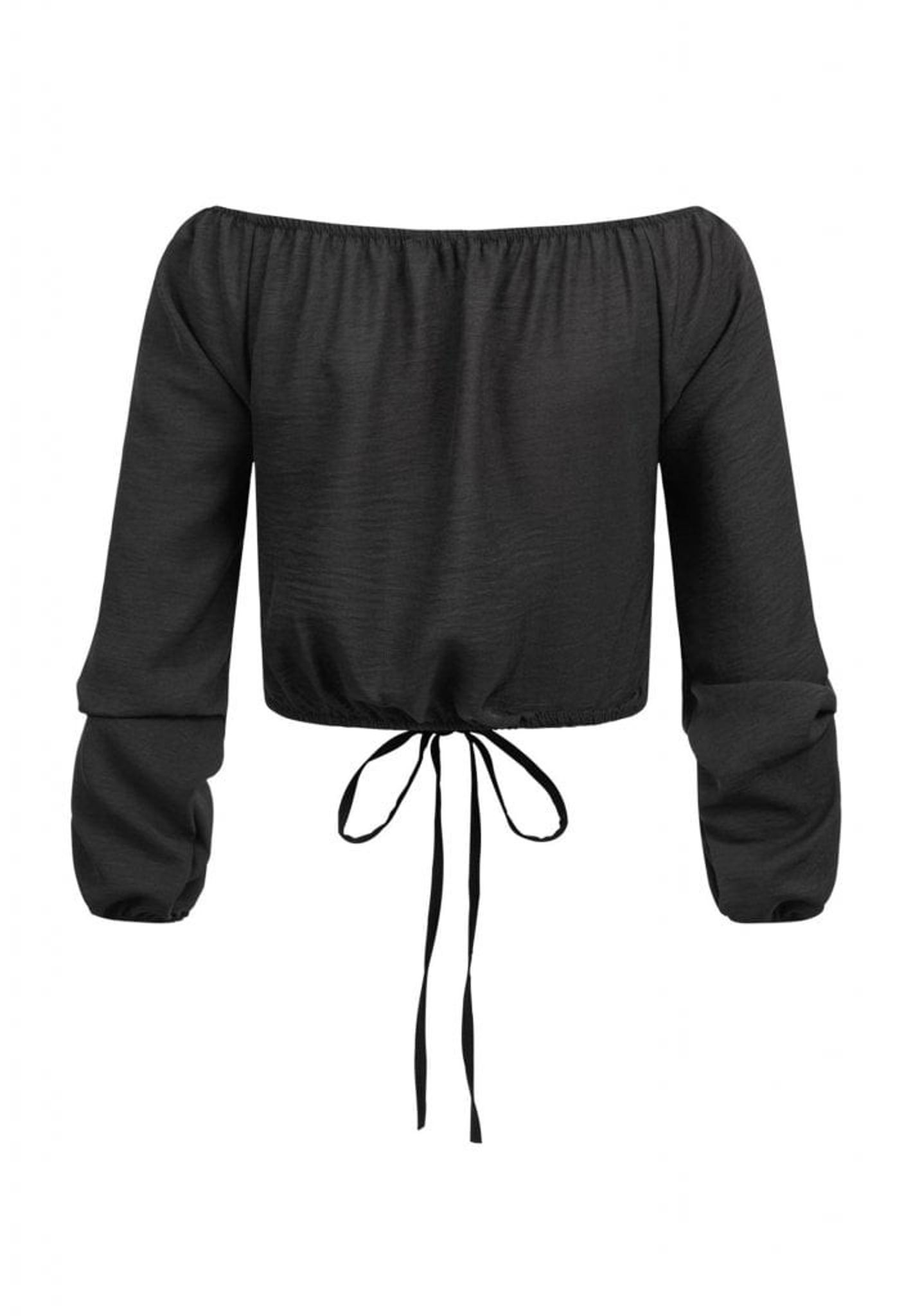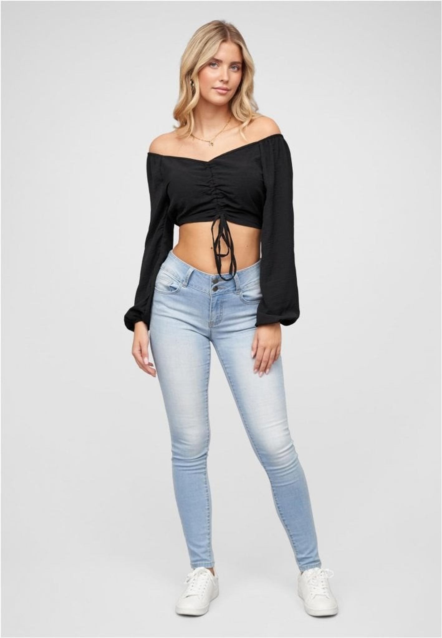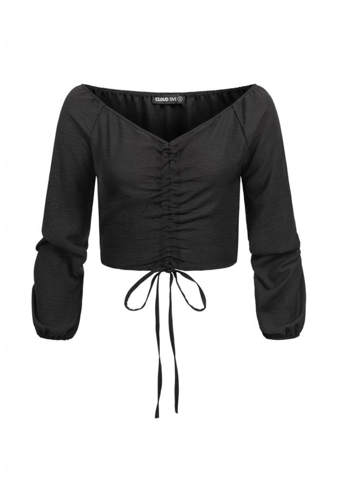 Kort V-ringad blus med ballongärmar och rynkad detalj framtill