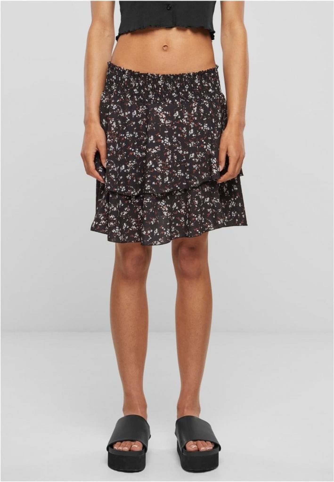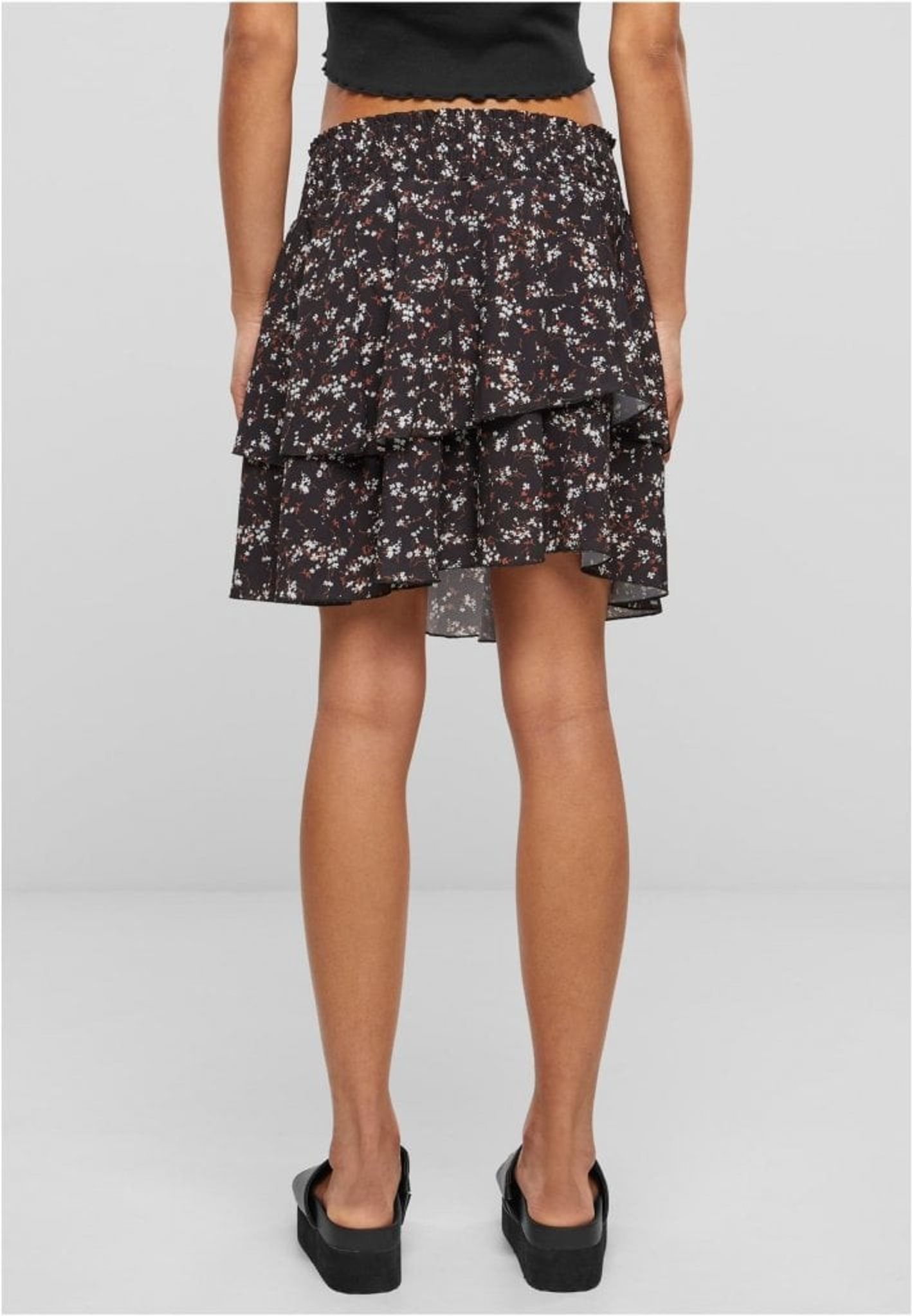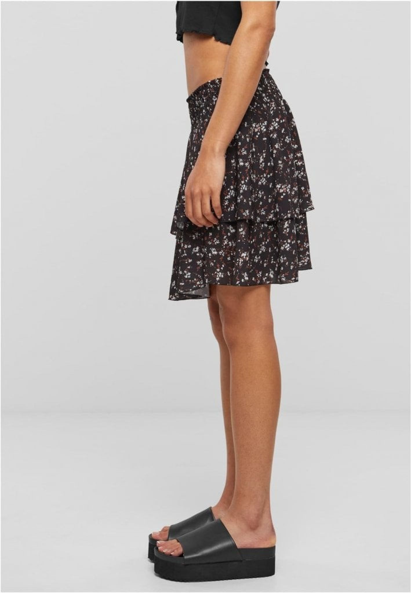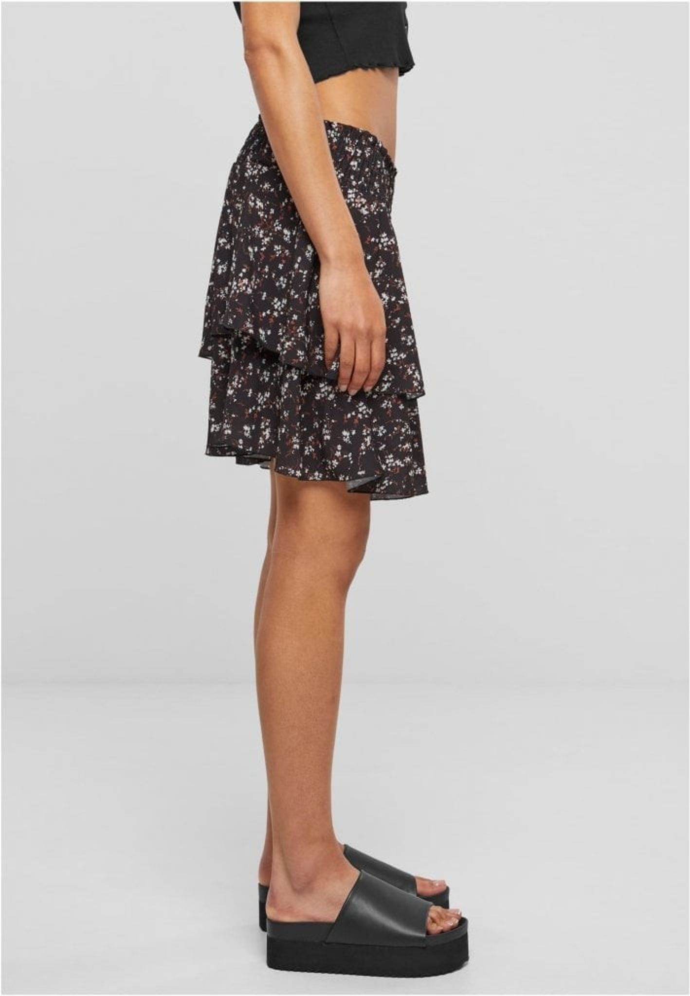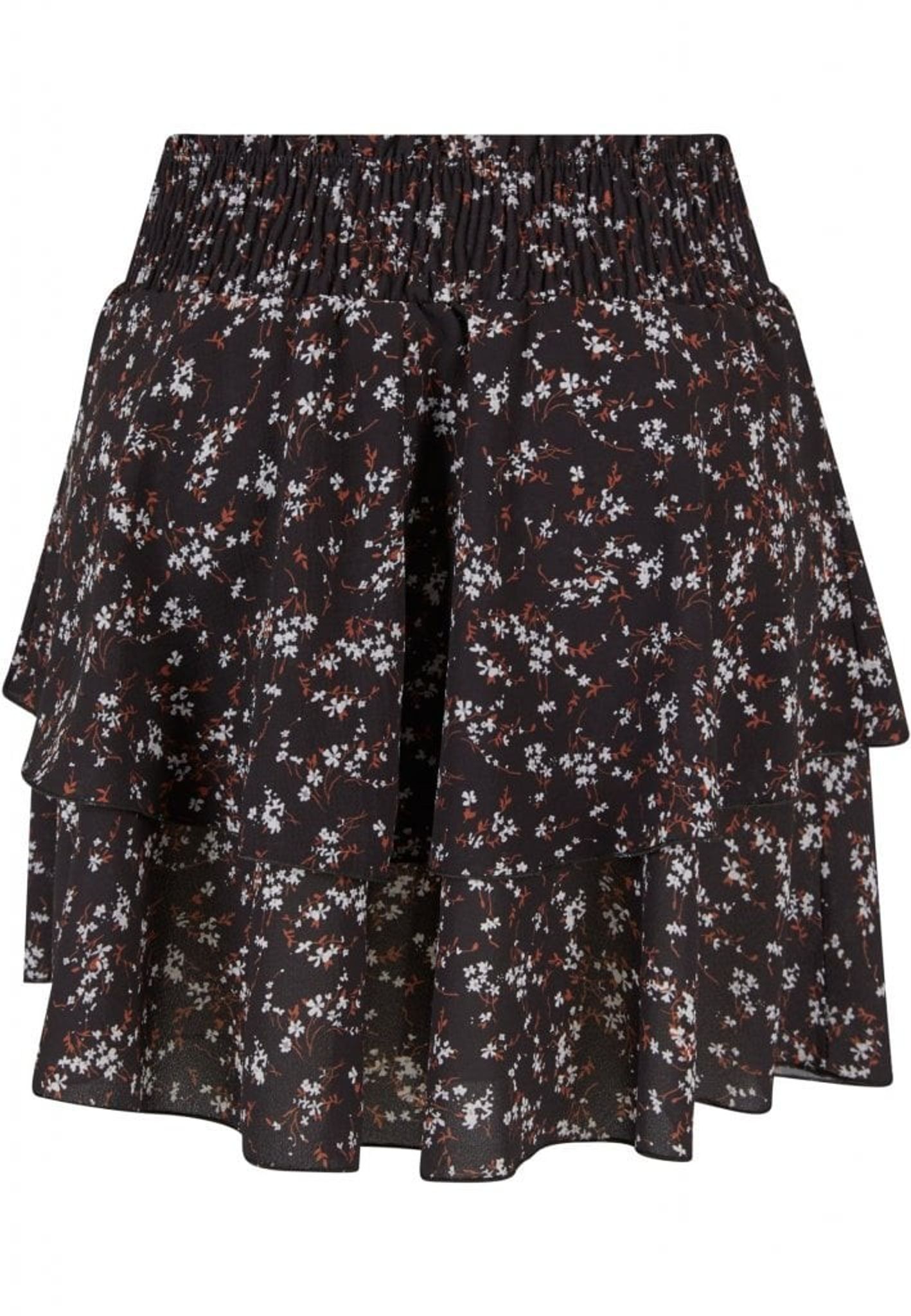 En kort volangkjol med ett blommönster. Kjolen har flera lager volanger, vilket ger den en lekfull och feminin silhuett. Mönstret är ganska detaljerat och består av olika blommor i flera färger mot en mörk bakgrund, vilket ger den ett visuellt intressant intryck och göra den lätt att matcha med olika toppar och skor.