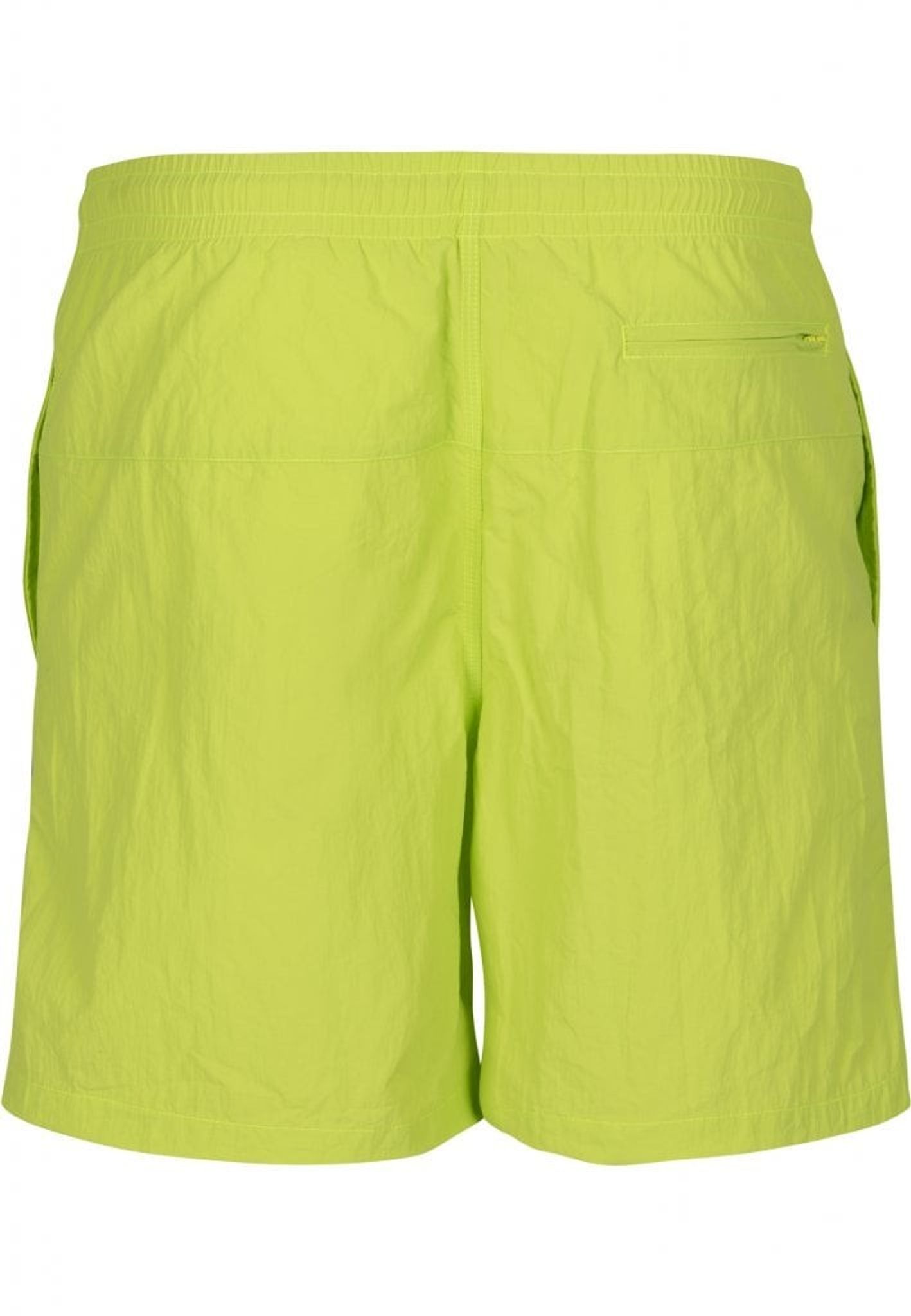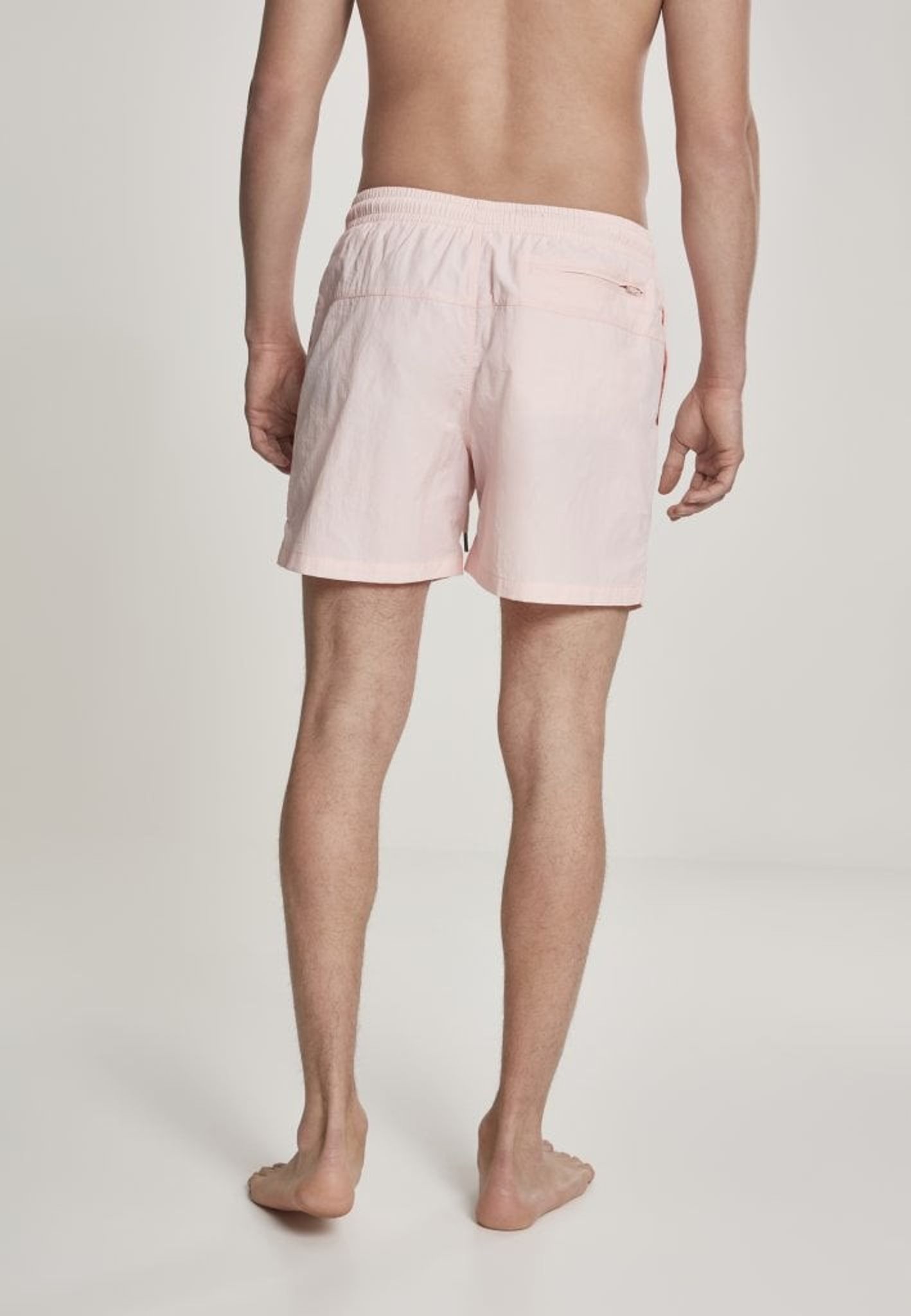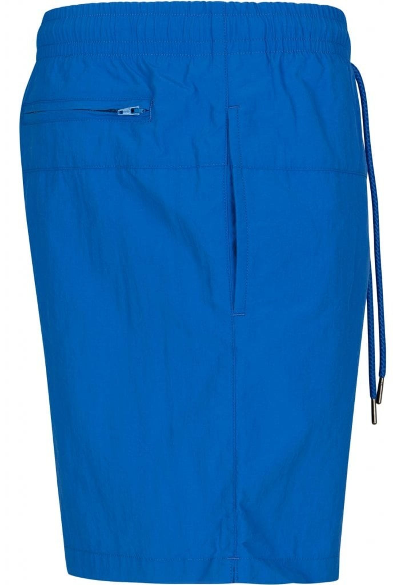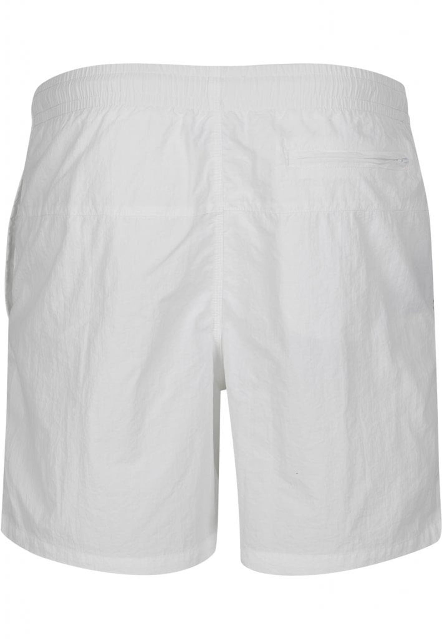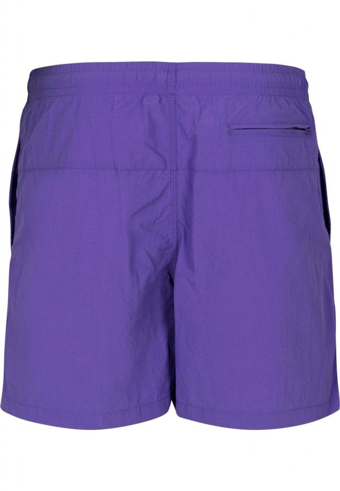 Ett par enkelfärgade badshorts med dubbla sidofickor och en bakficka med dragkedja.
