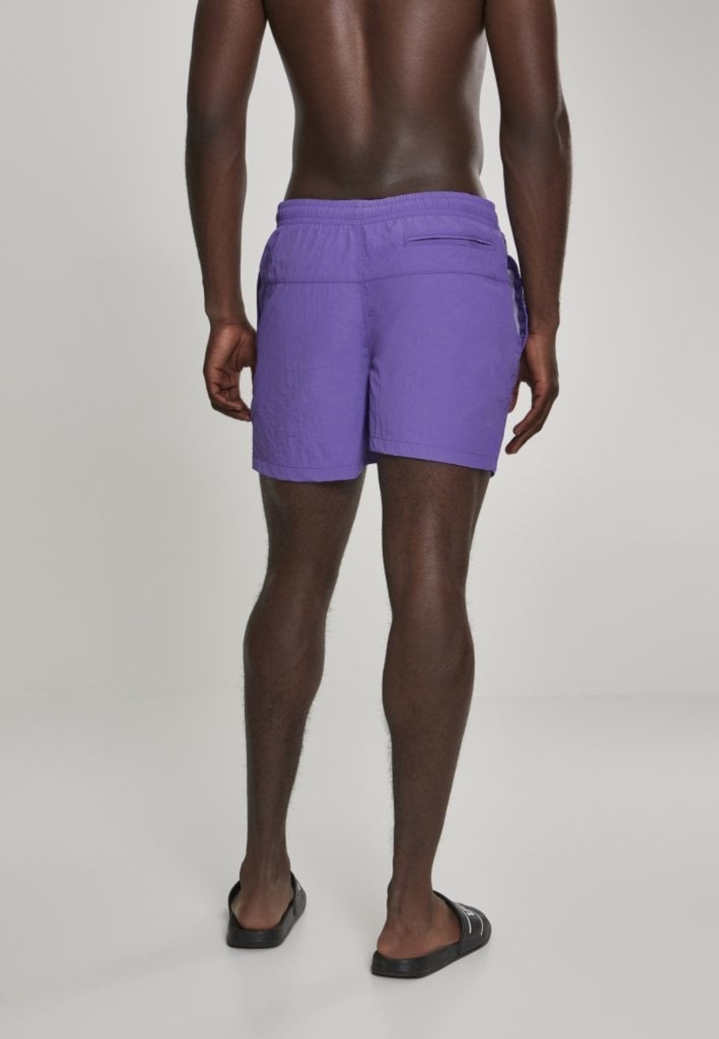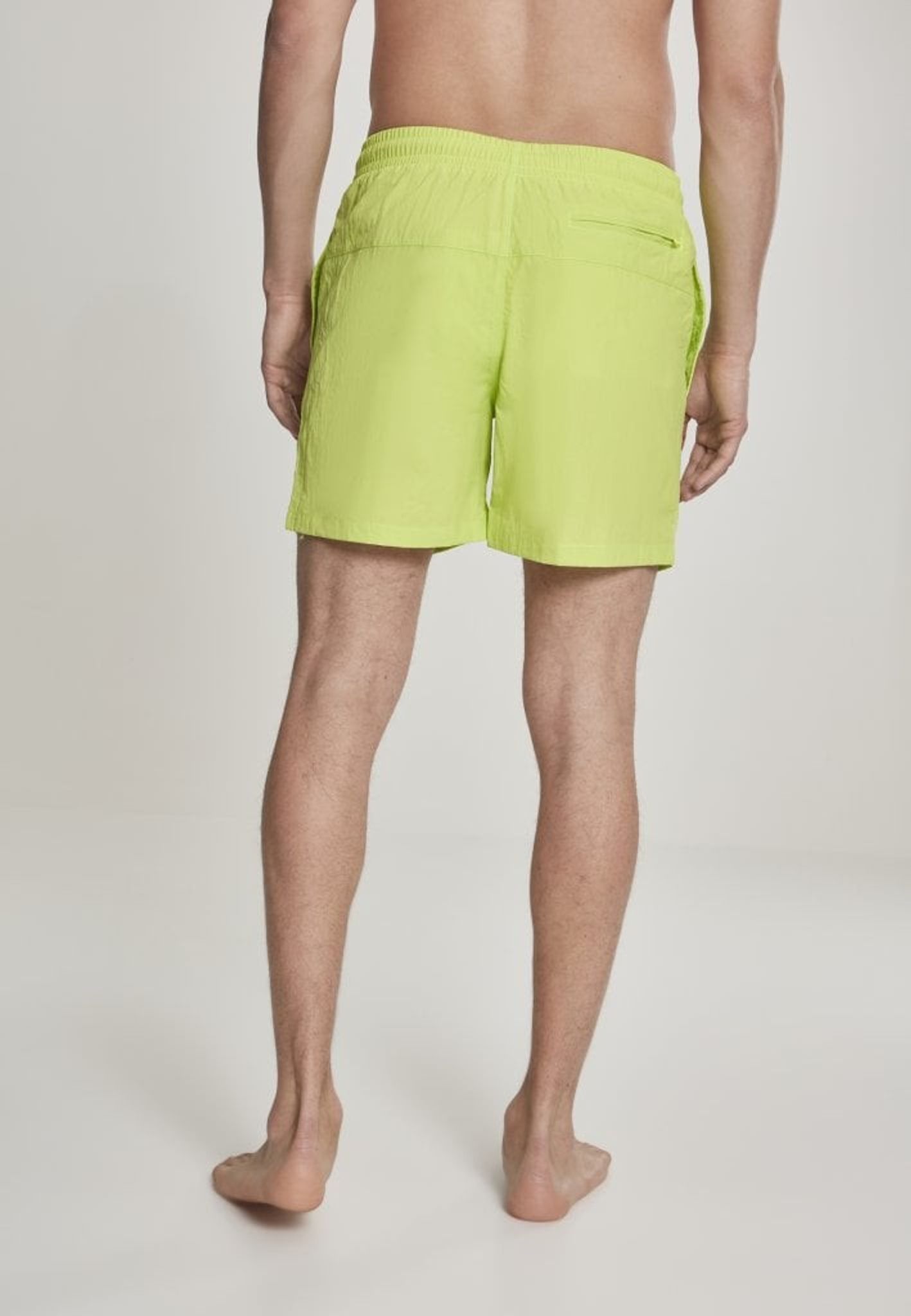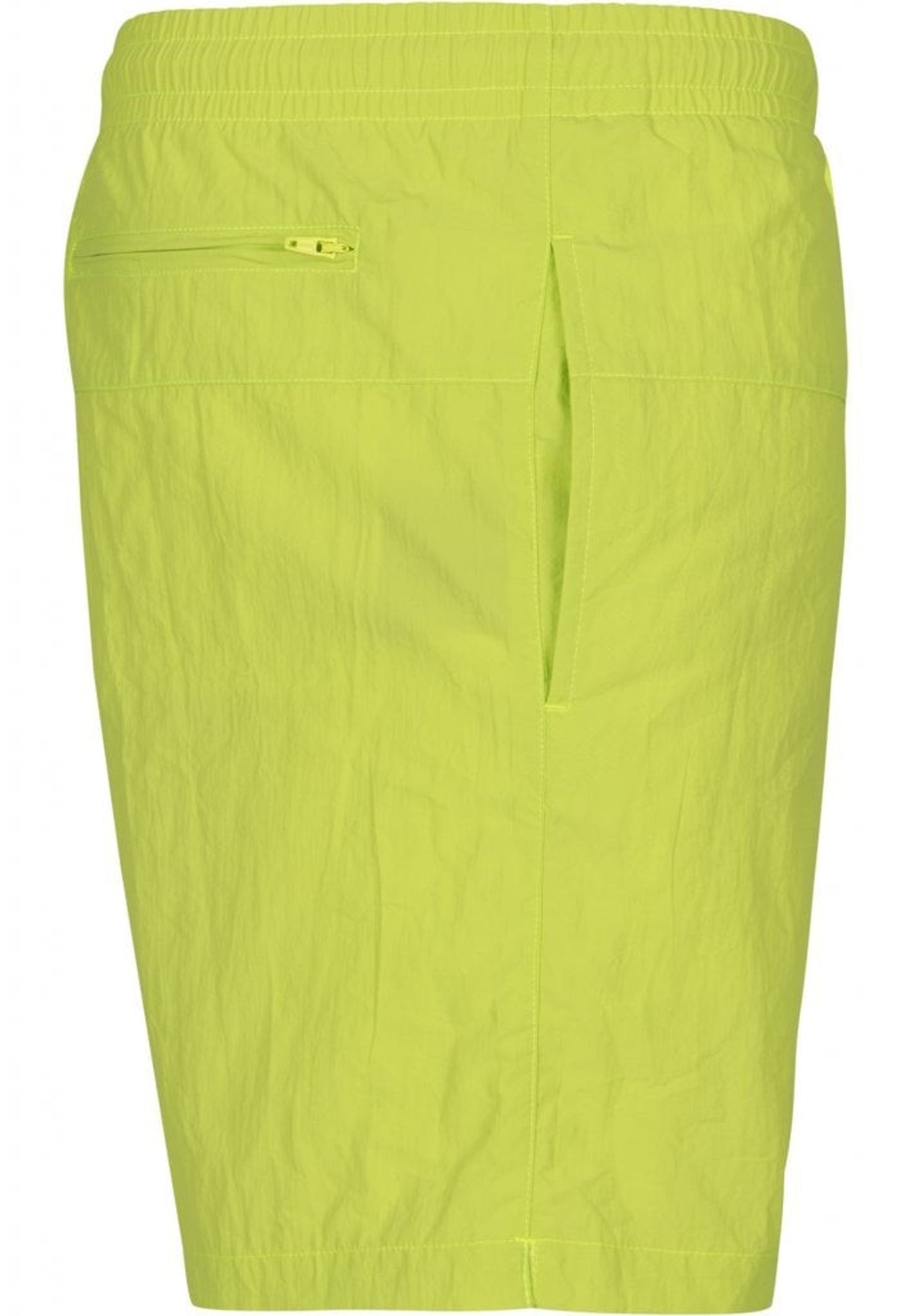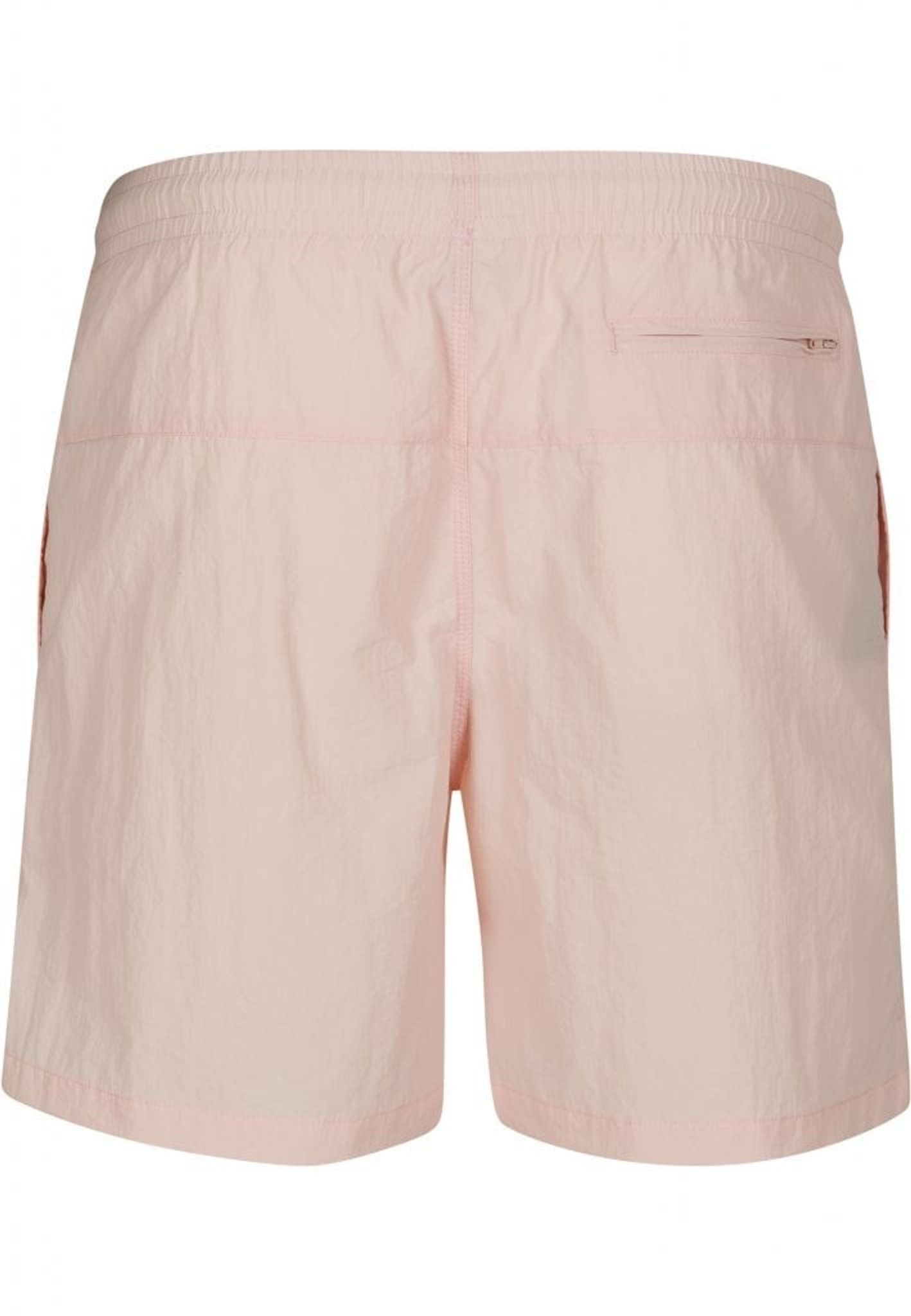 Ett par enkelfärgade badshorts med dubbla sidofickor och en bakficka med dragkedja.