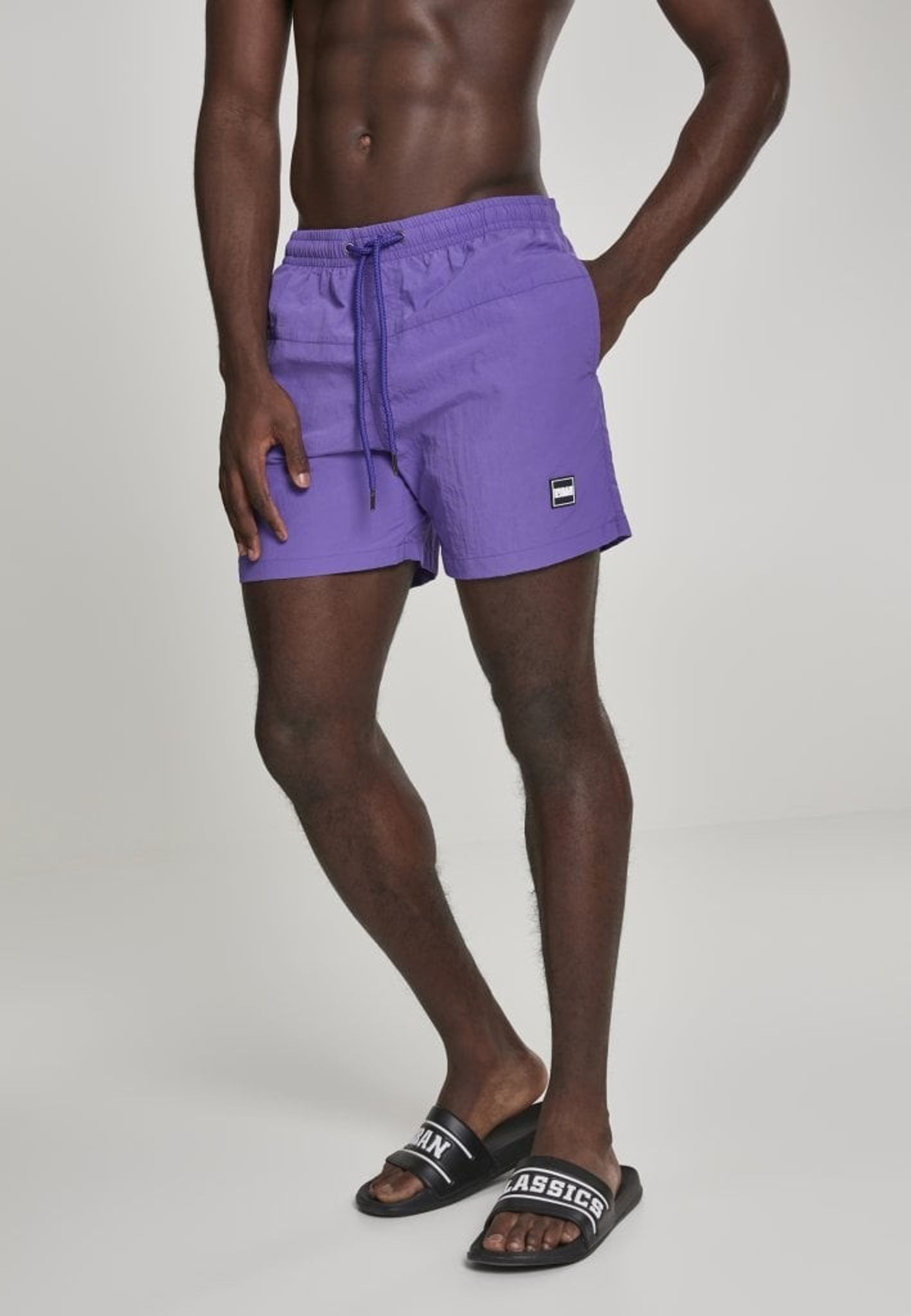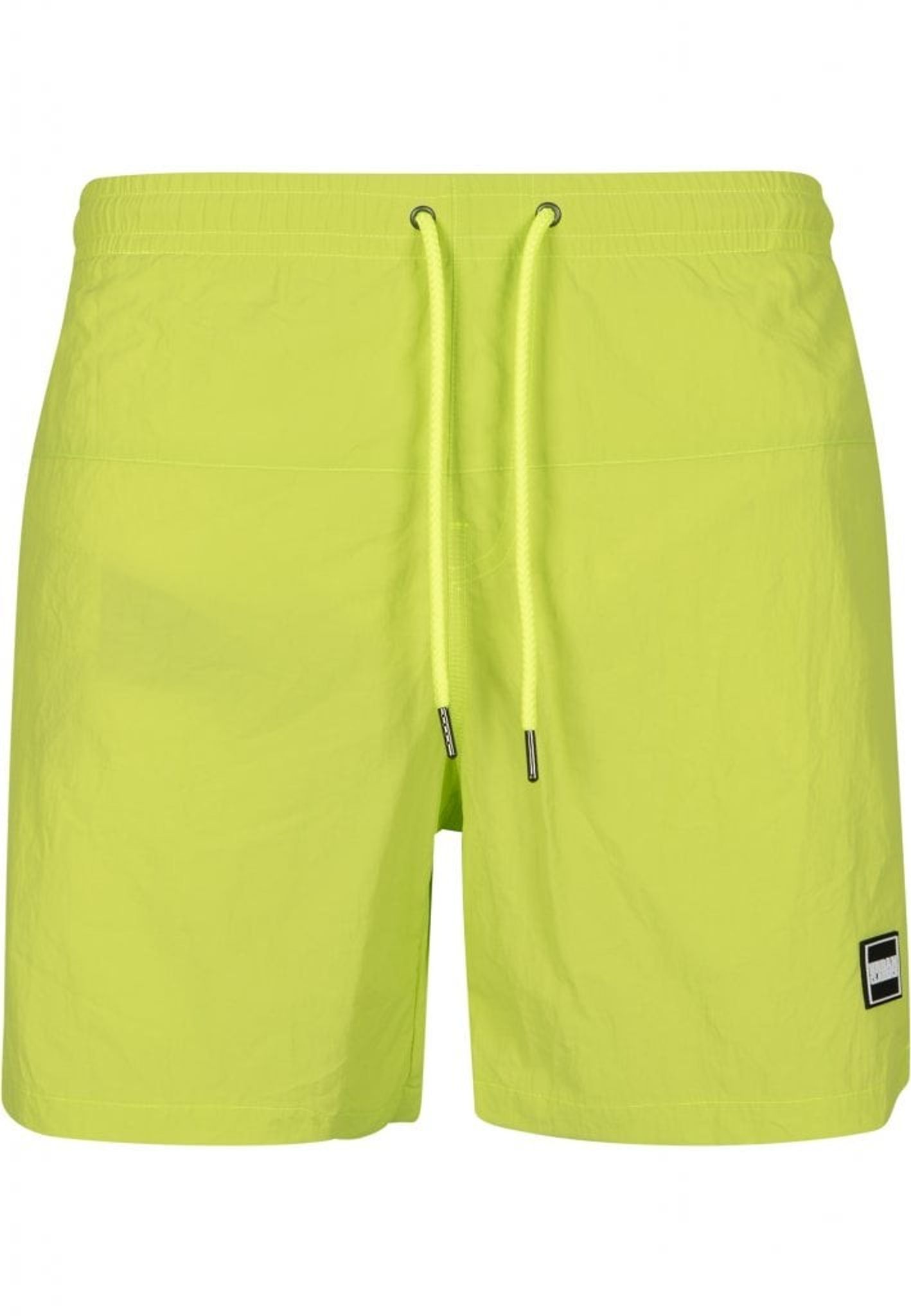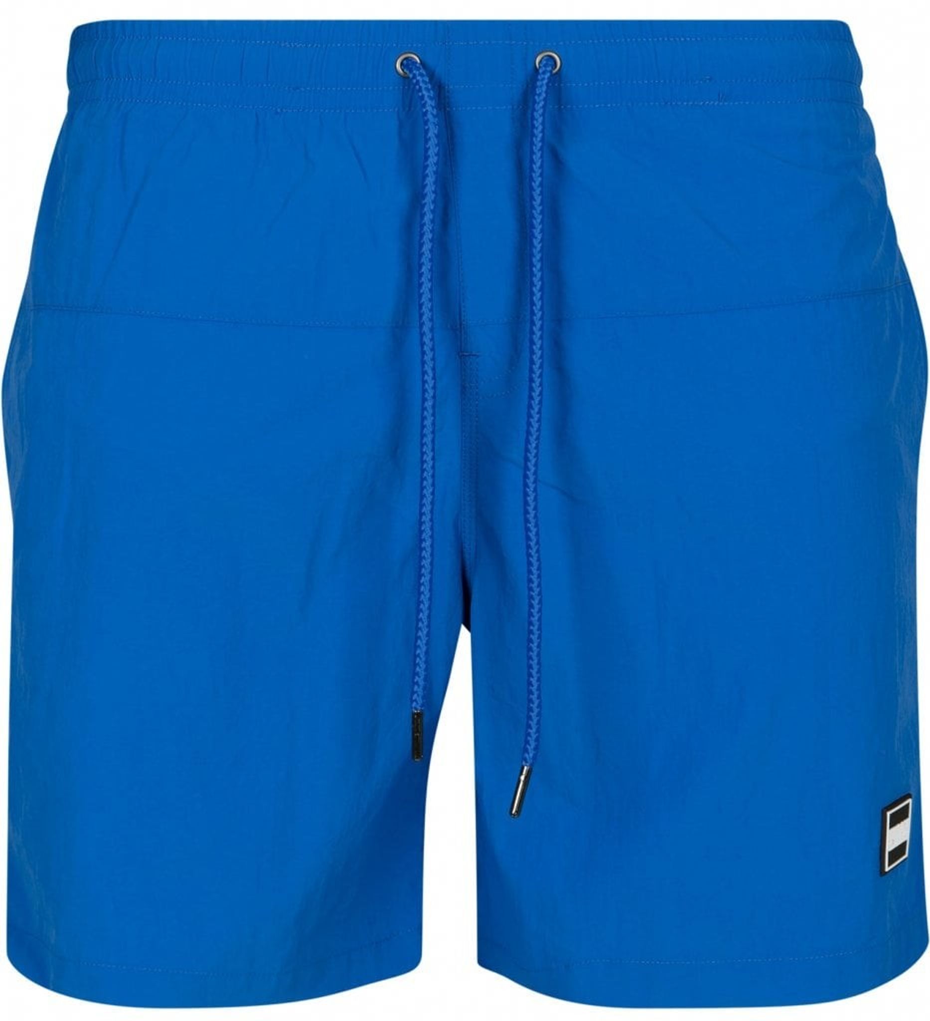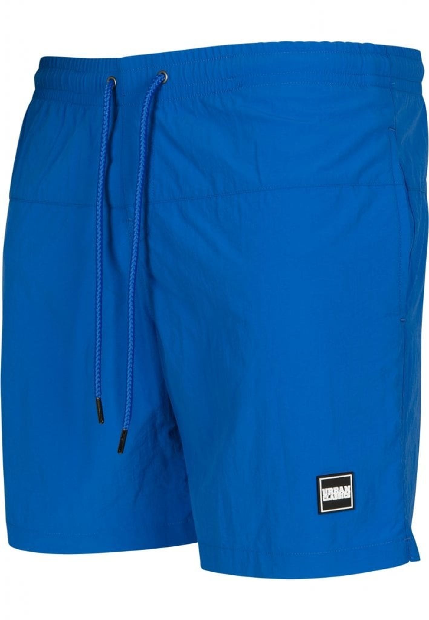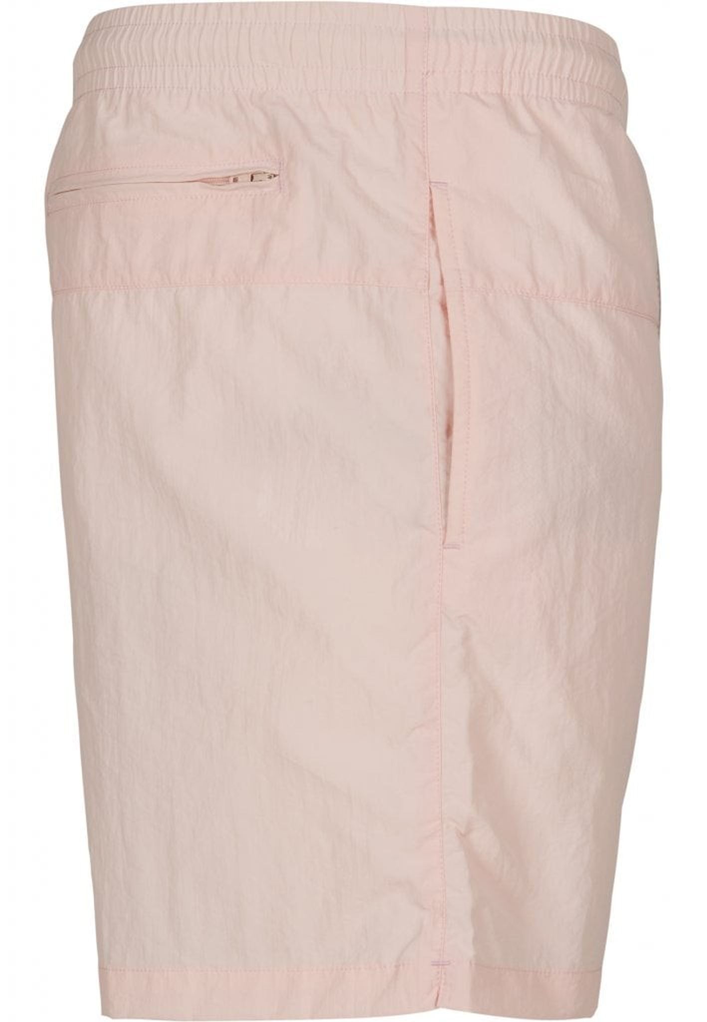 Ett par enkelfärgade badshorts med dubbla sidofickor och en bakficka med dragkedja.