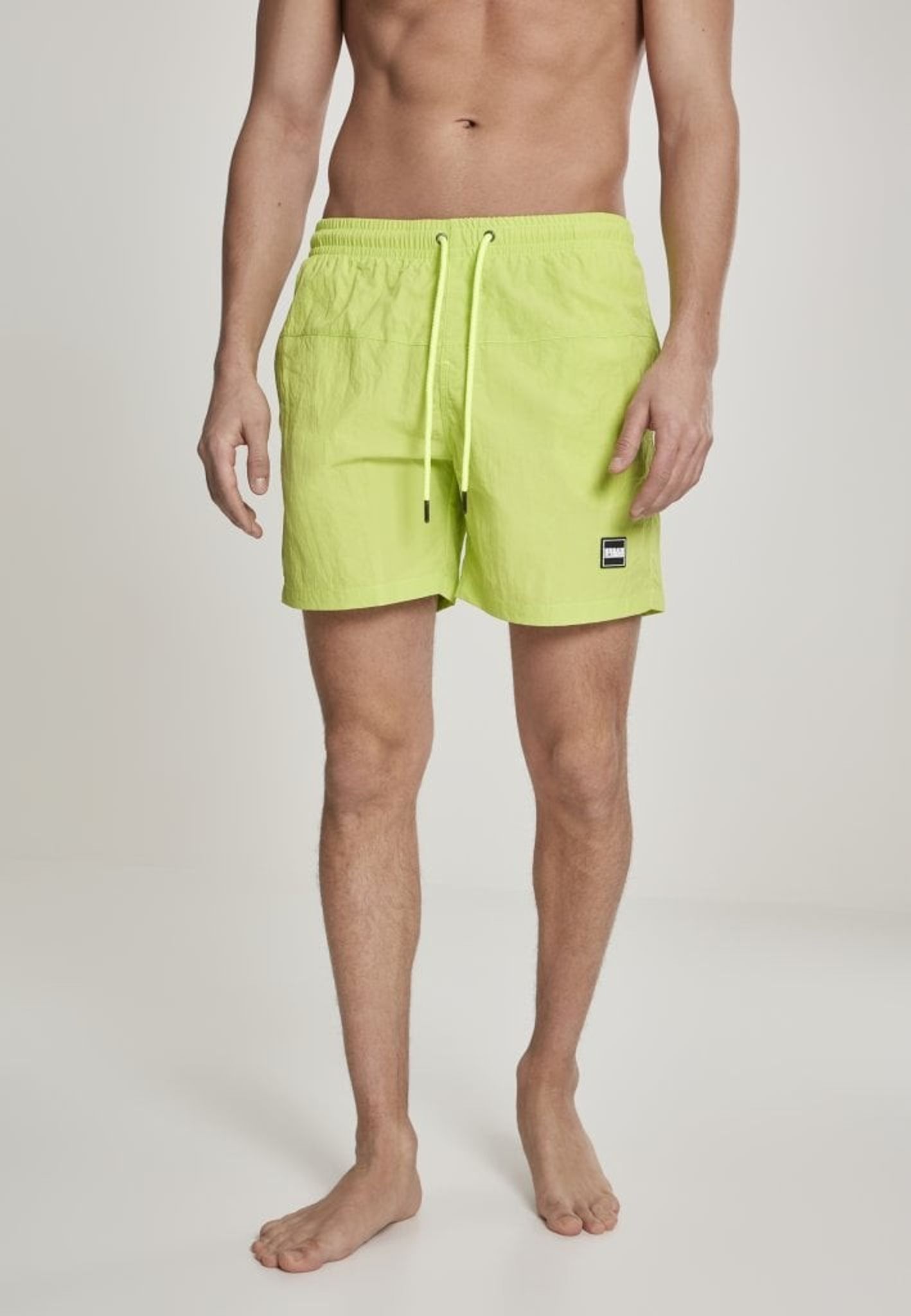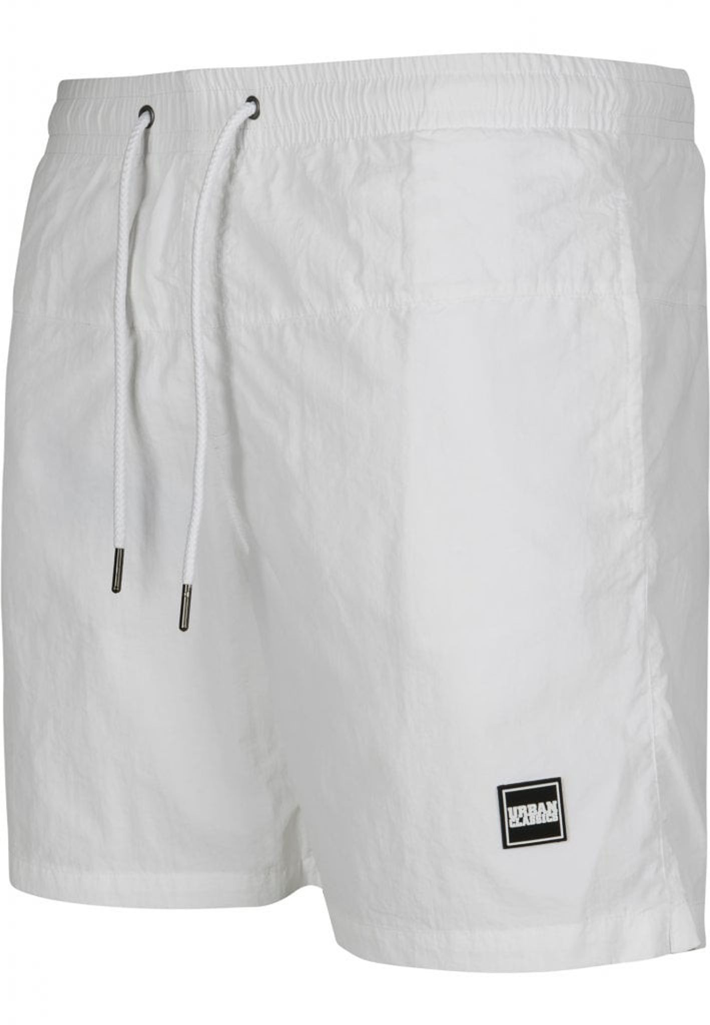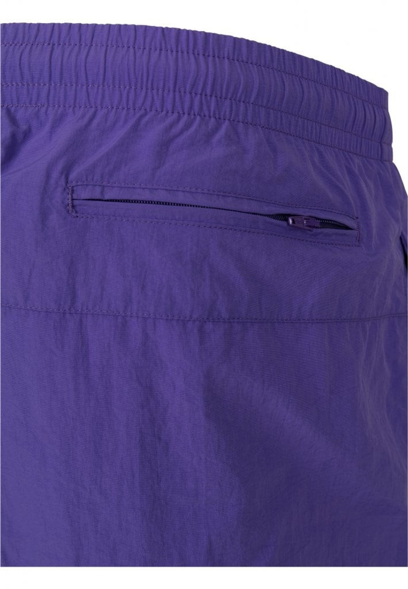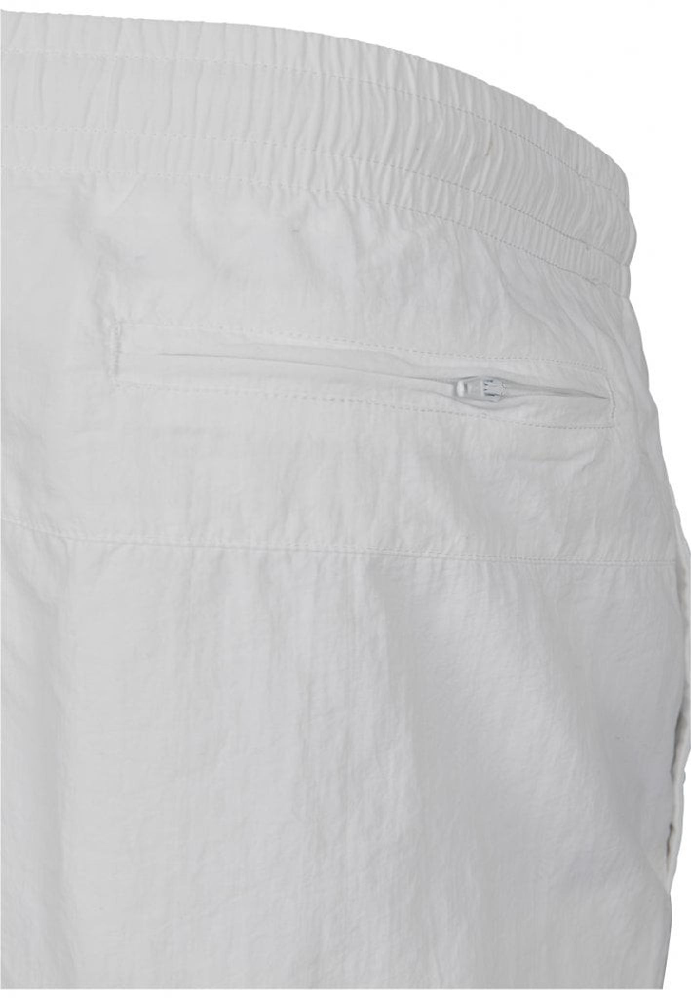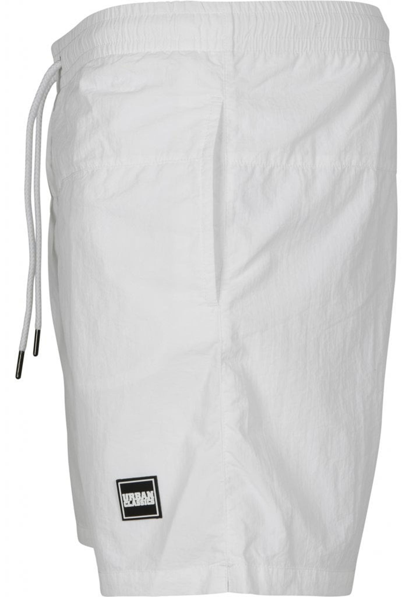 Ett par enkelfärgade badshorts med dubbla sidofickor och en bakficka med dragkedja.