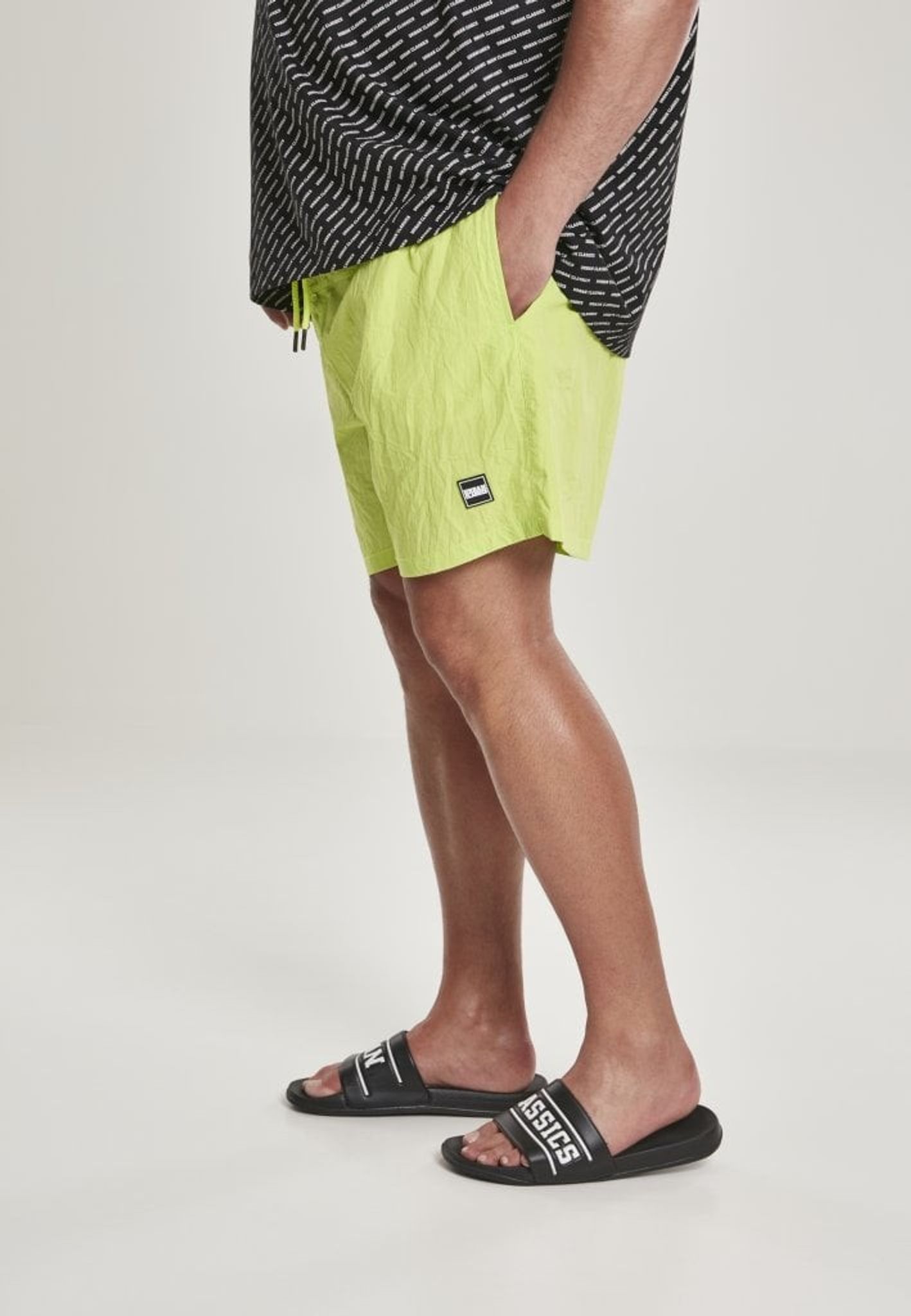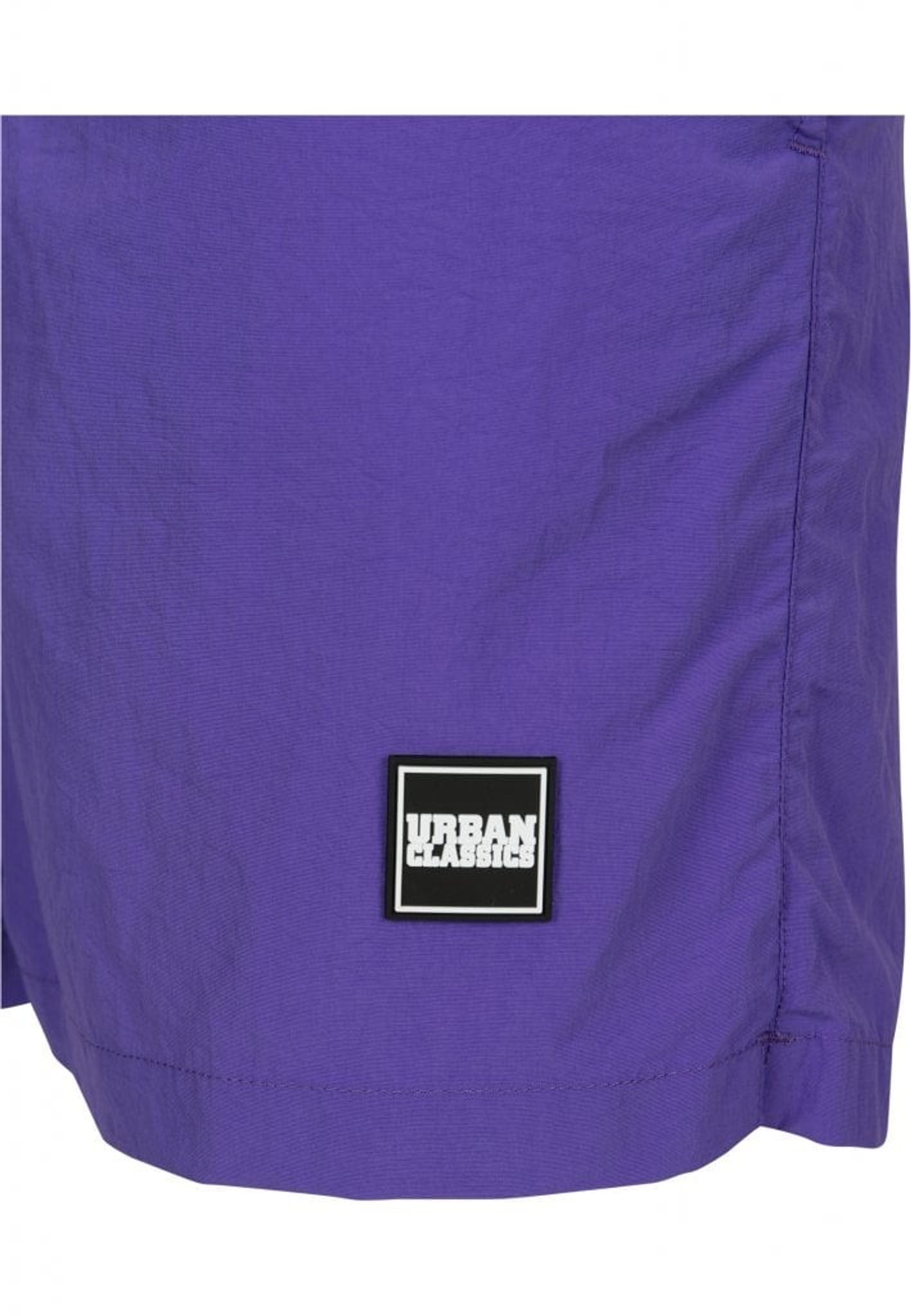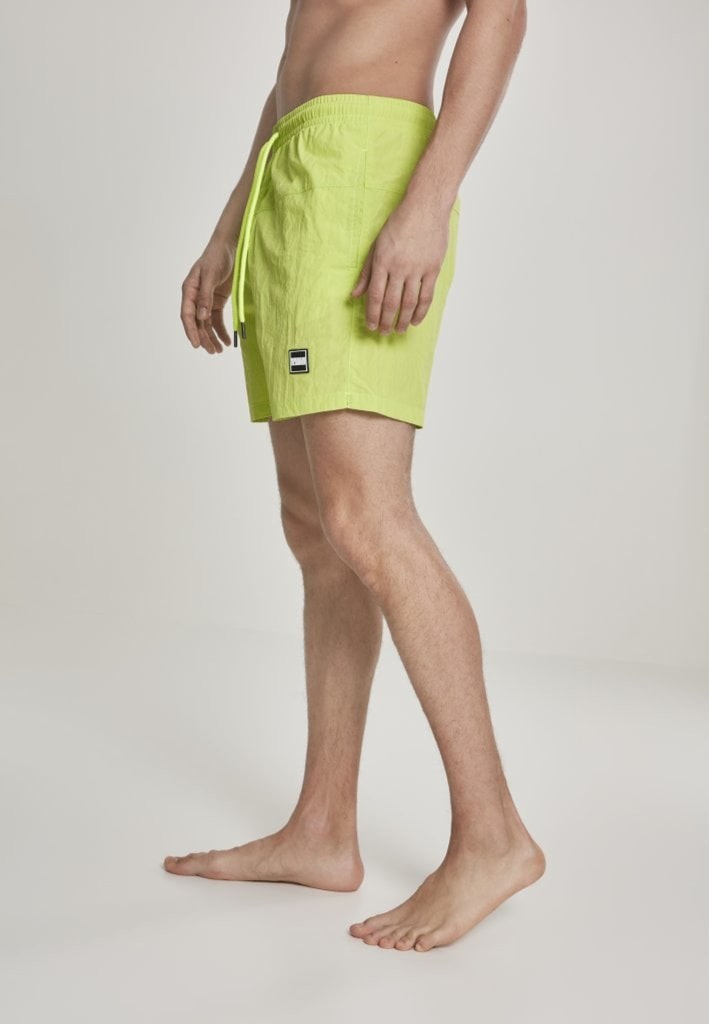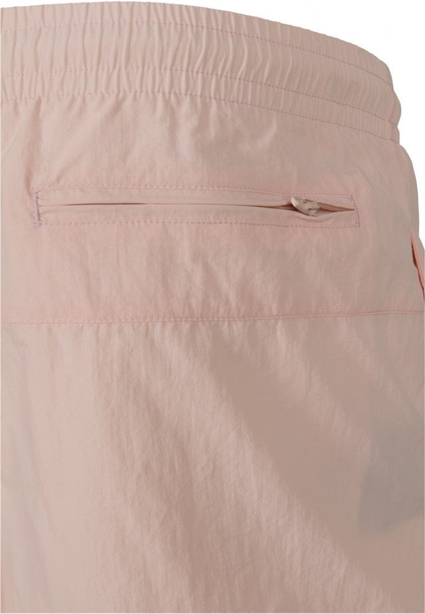 Ett par enkelfärgade badshorts med dubbla sidofickor och en bakficka med dragkedja.