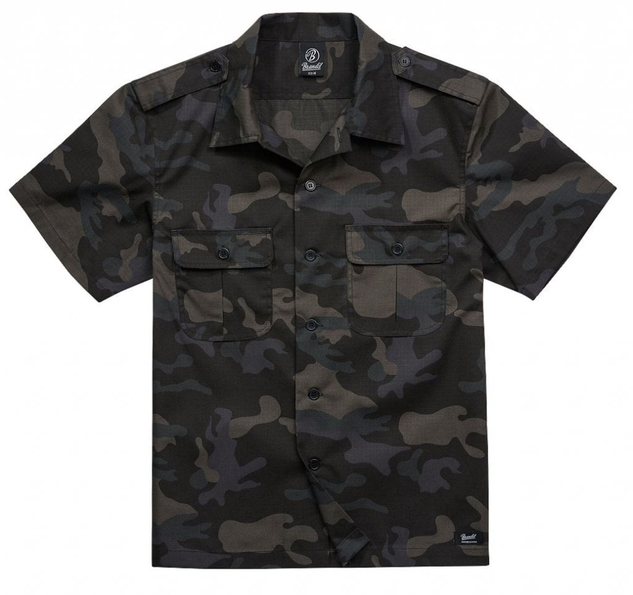 Skjorta i darkcamo och som har ett ripstop-tyg. Ripstop innebär att den liten förstärkande tråd är invävd i tyget och gör tyget extra slitstarkt.