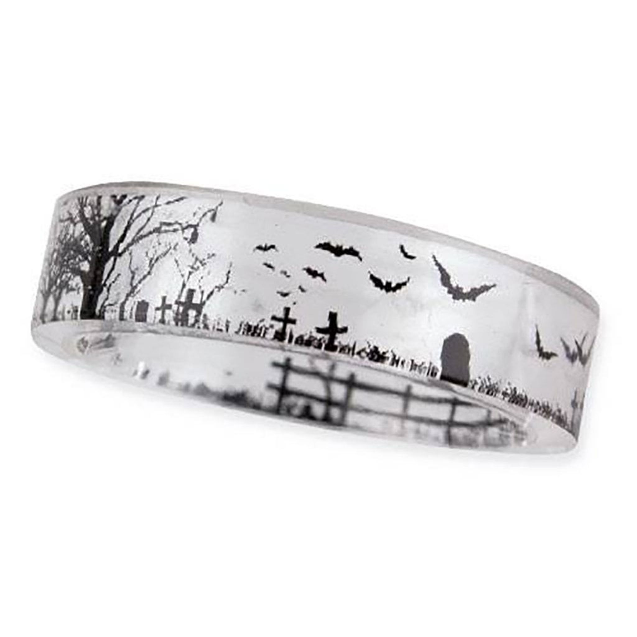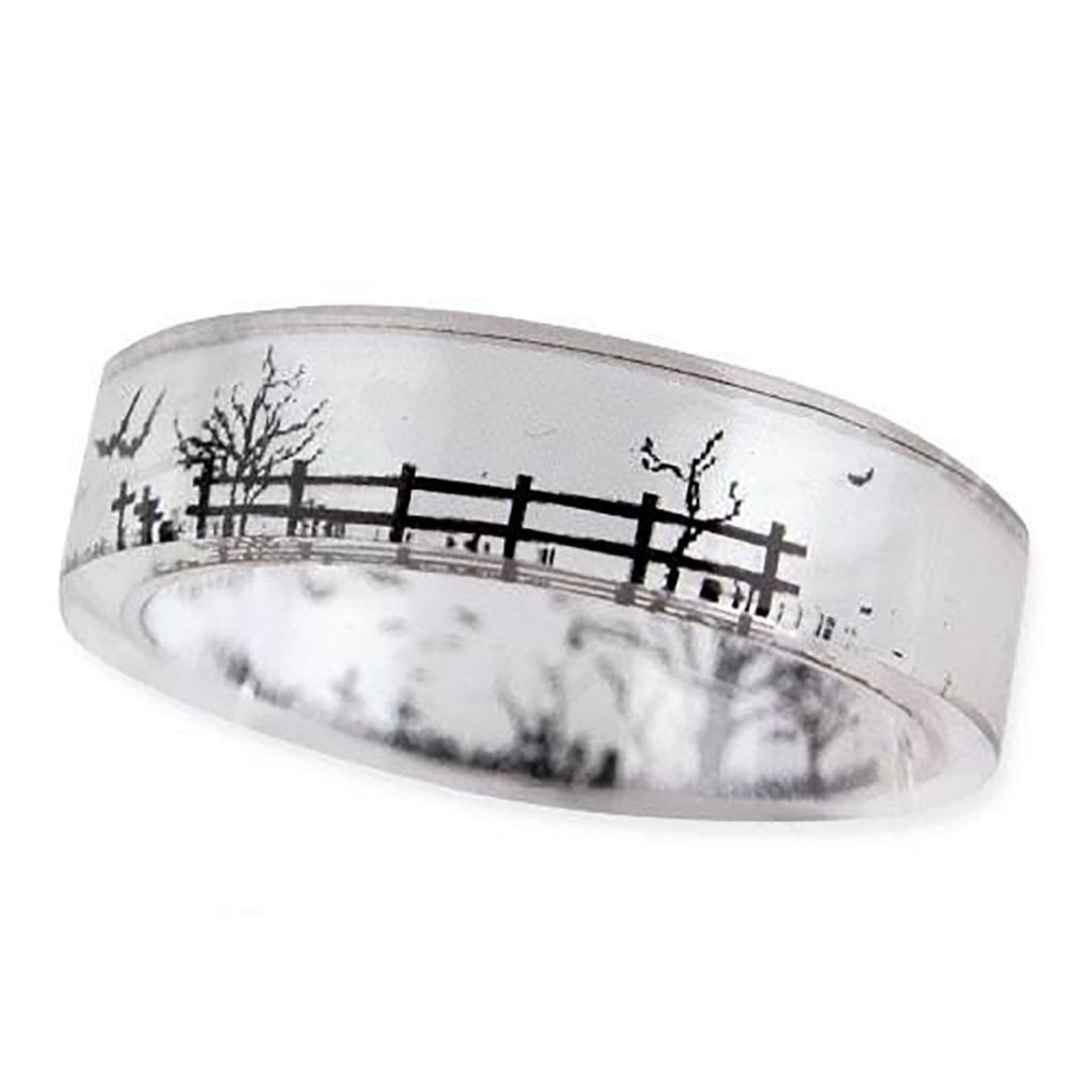 På denna ring syns konturerna av en kolsvart kyrkogård med gravstenar och fladdermöss som svärmar i natten.