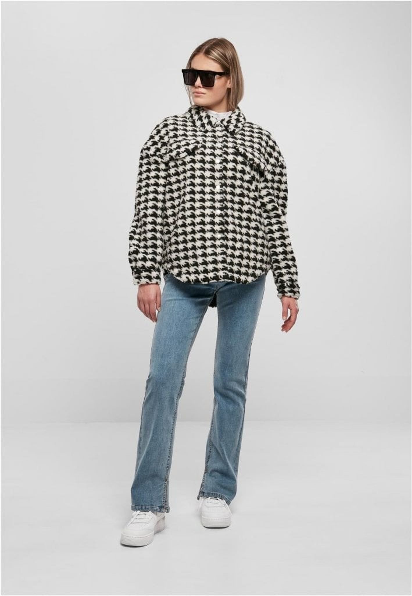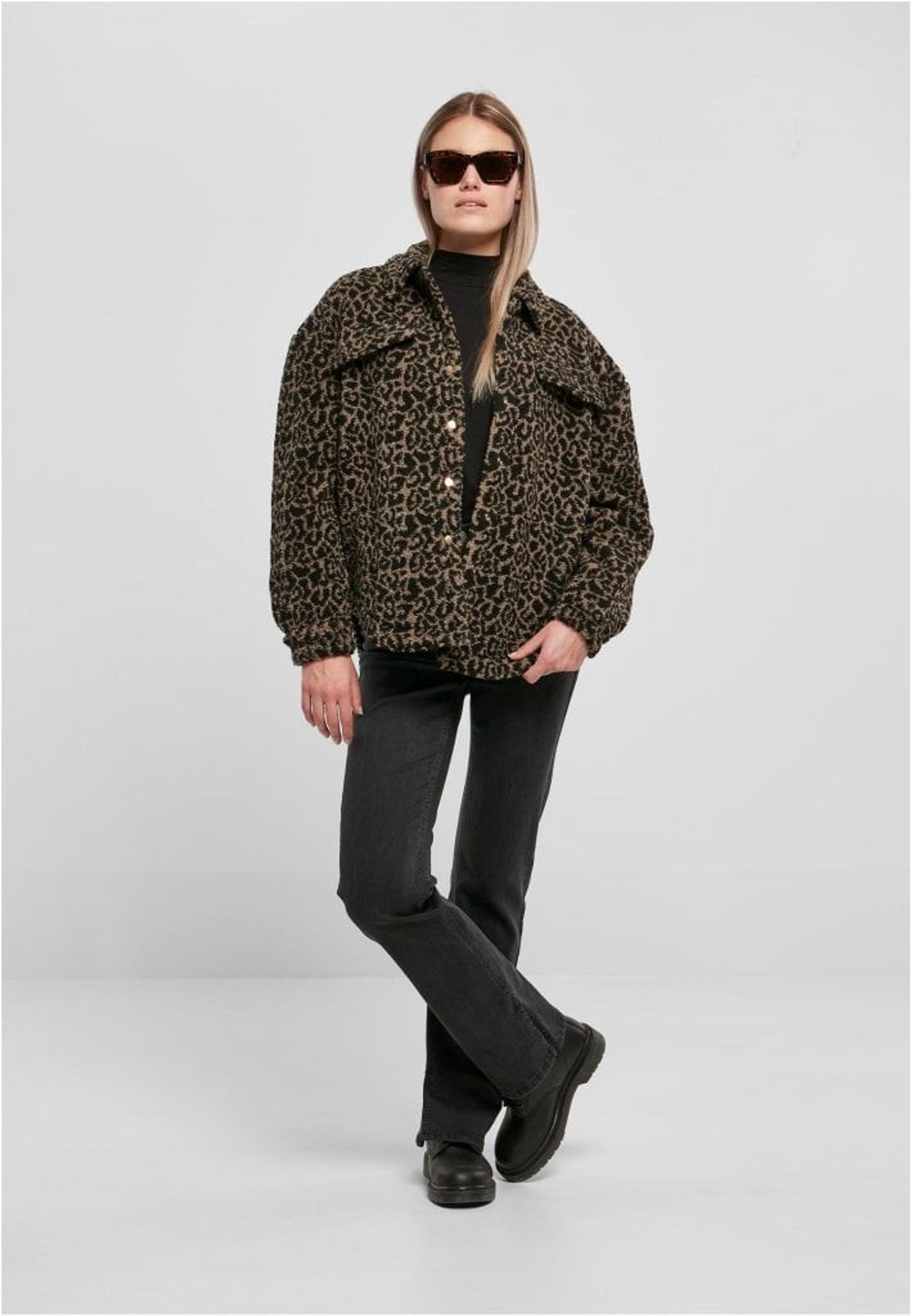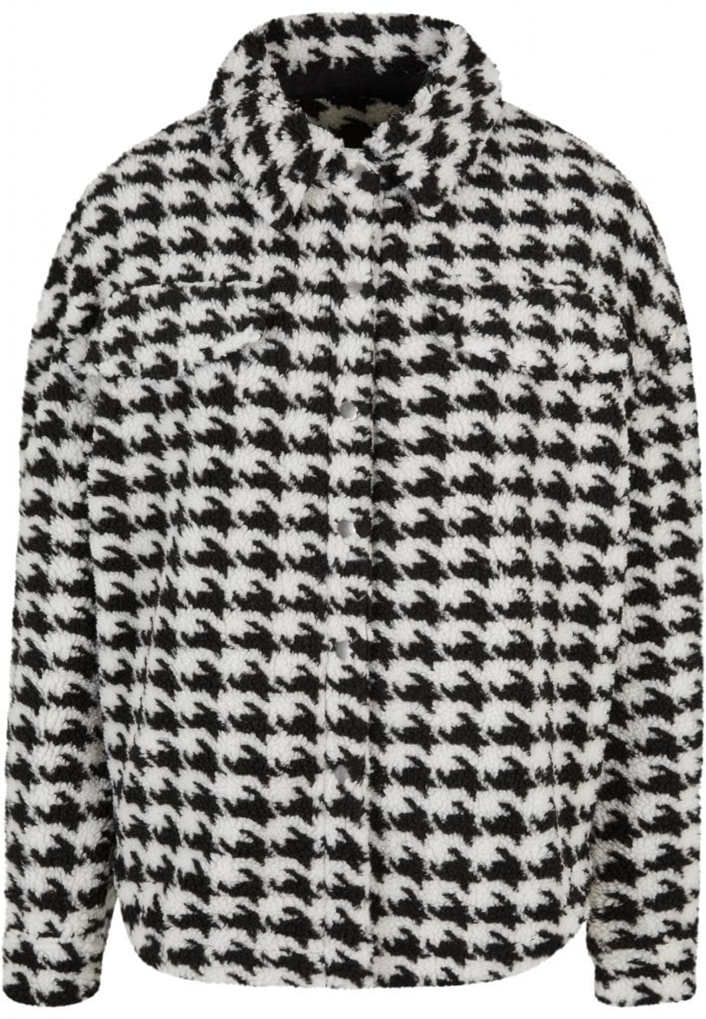 Denna damjacka tillfredsställer på mer än ett sätt. För det första är den gjord av ett gosigt Sherpa-material, för det andra har den ett fräckt allover-mönster. Klassiska inslag som krage, knappslå och rundad fåll kompletterar designen och ackompanjeras av en något långsträckt rygg. Dessutom är jackan fodrad med taft och erbjuder en hip oversize passform.