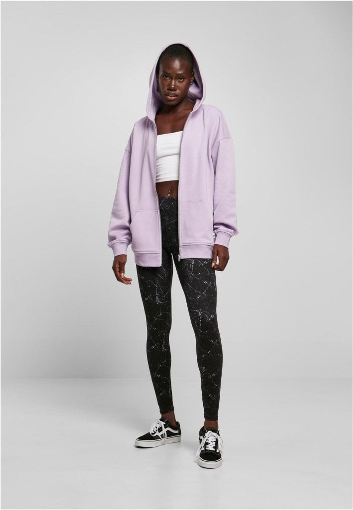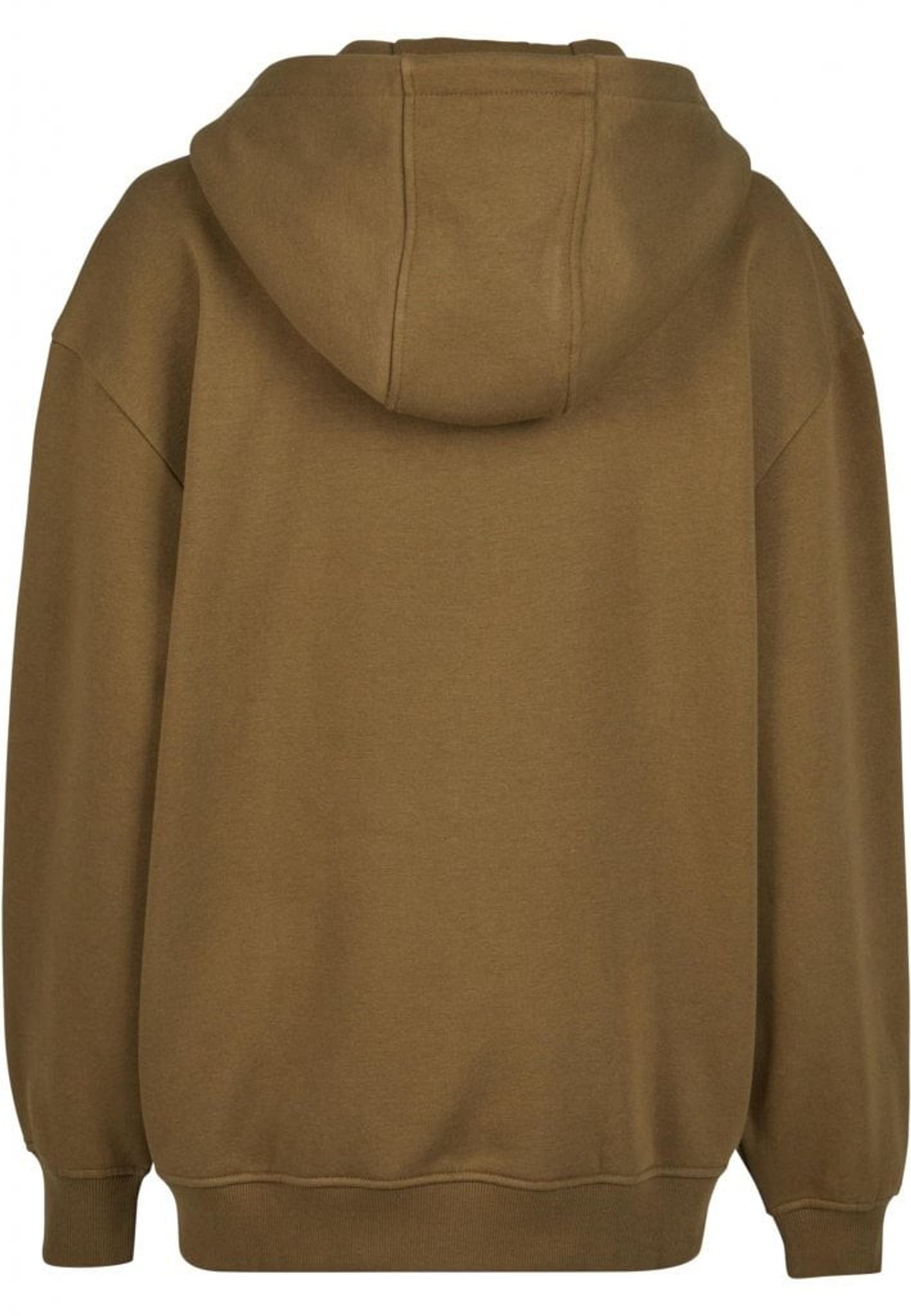 Den överdimensionerade huvtröjan med dragkedja för damer har en voluminös design som framhäver kraftiga skärningar.
