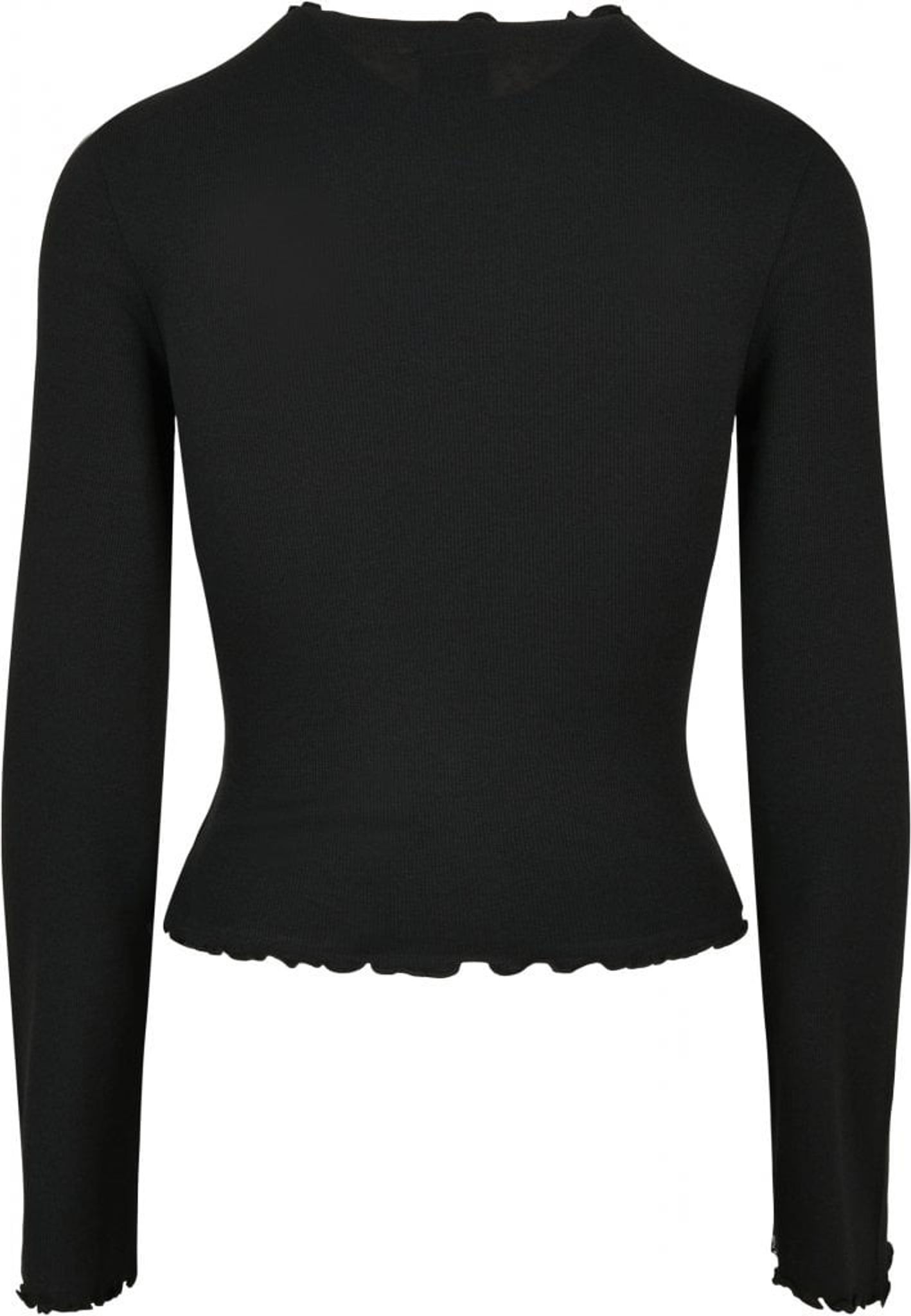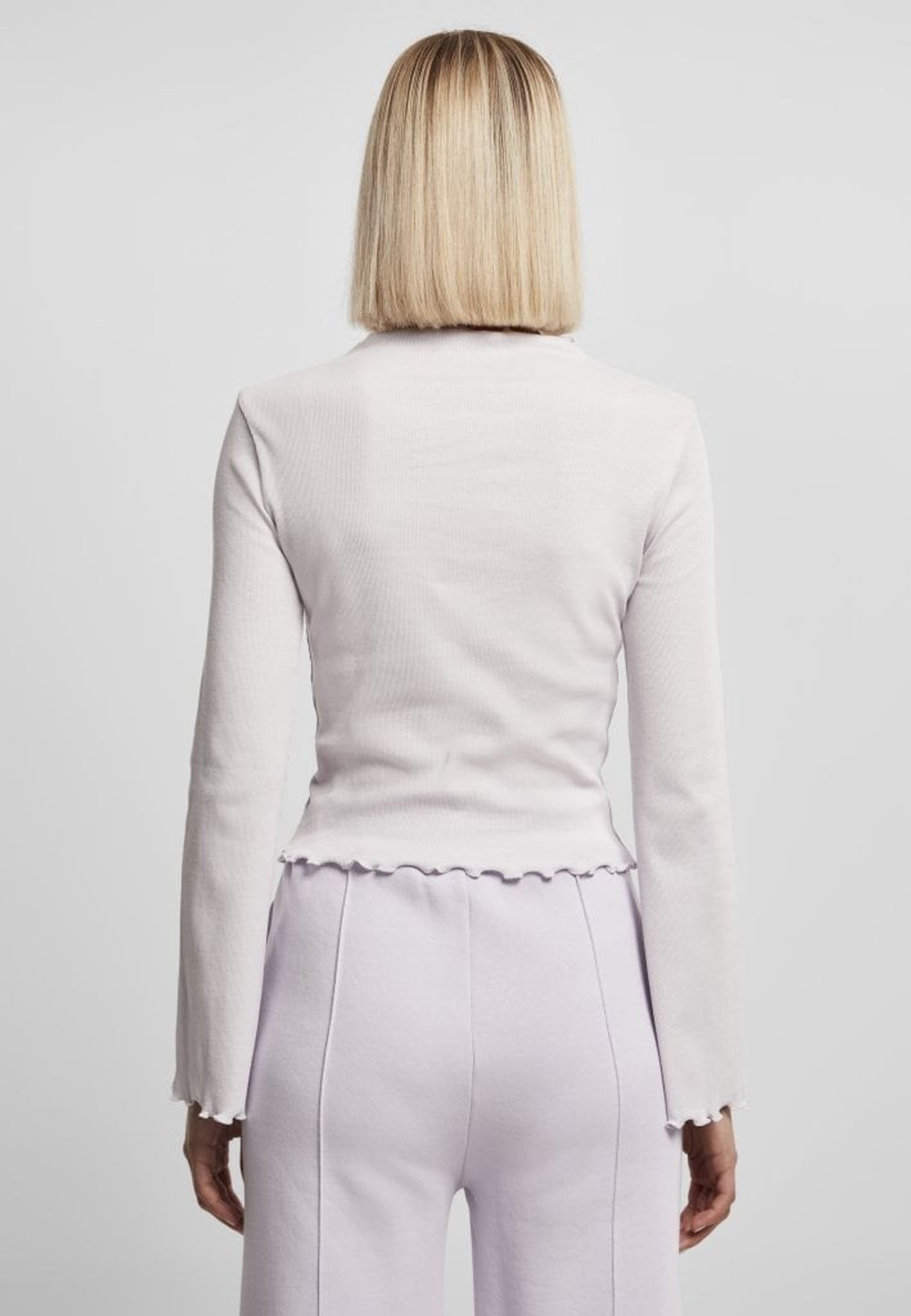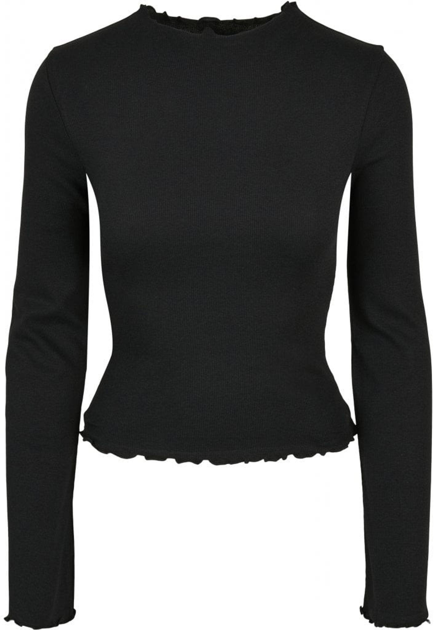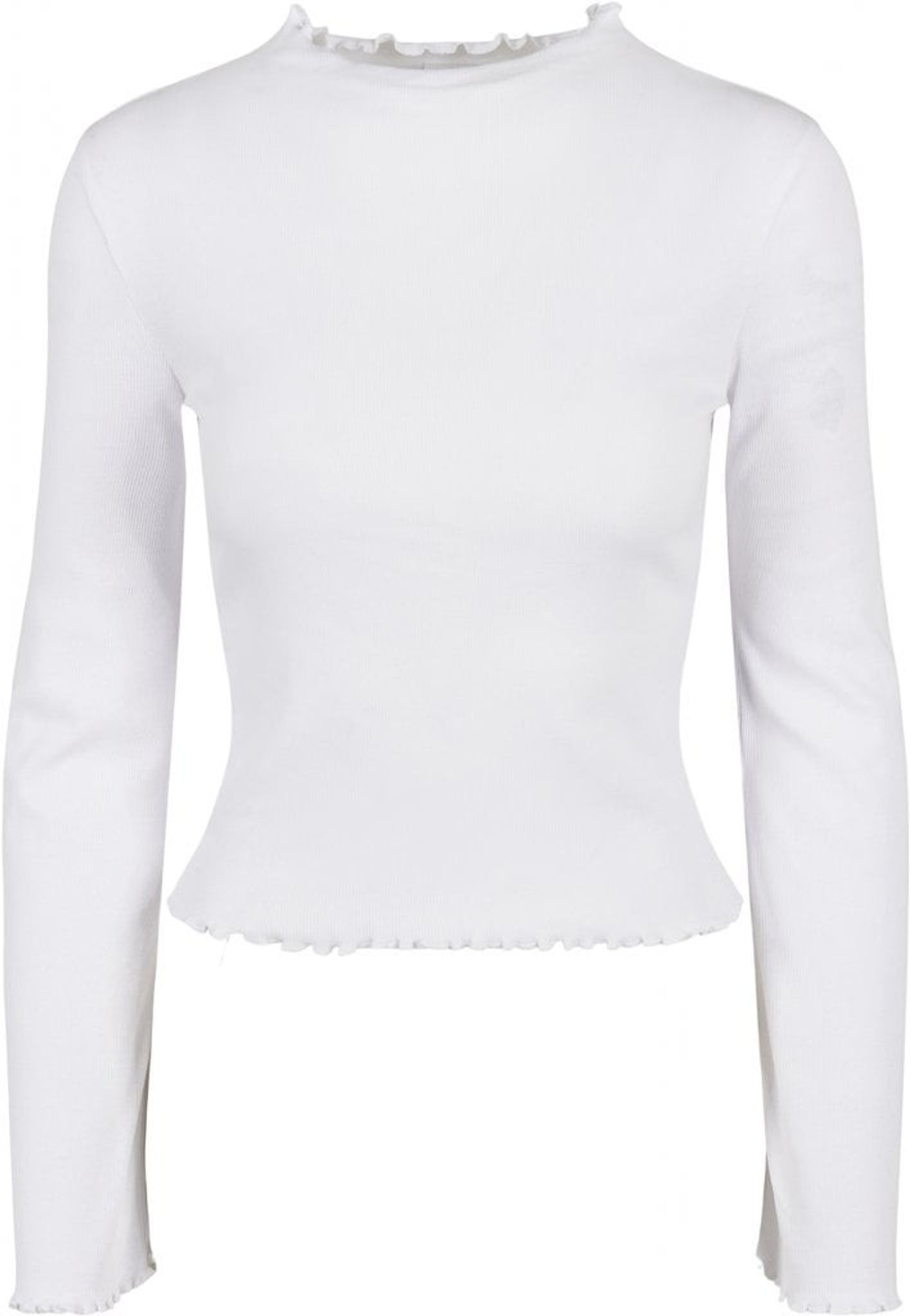 En topp med långa ärmar och ribbat tyg. Denna feminina topp har dessutom rullande follar vid ärmslut och krage. Toppen är gjord i ett strech-ribbmaterial av fin bomull med elastan.