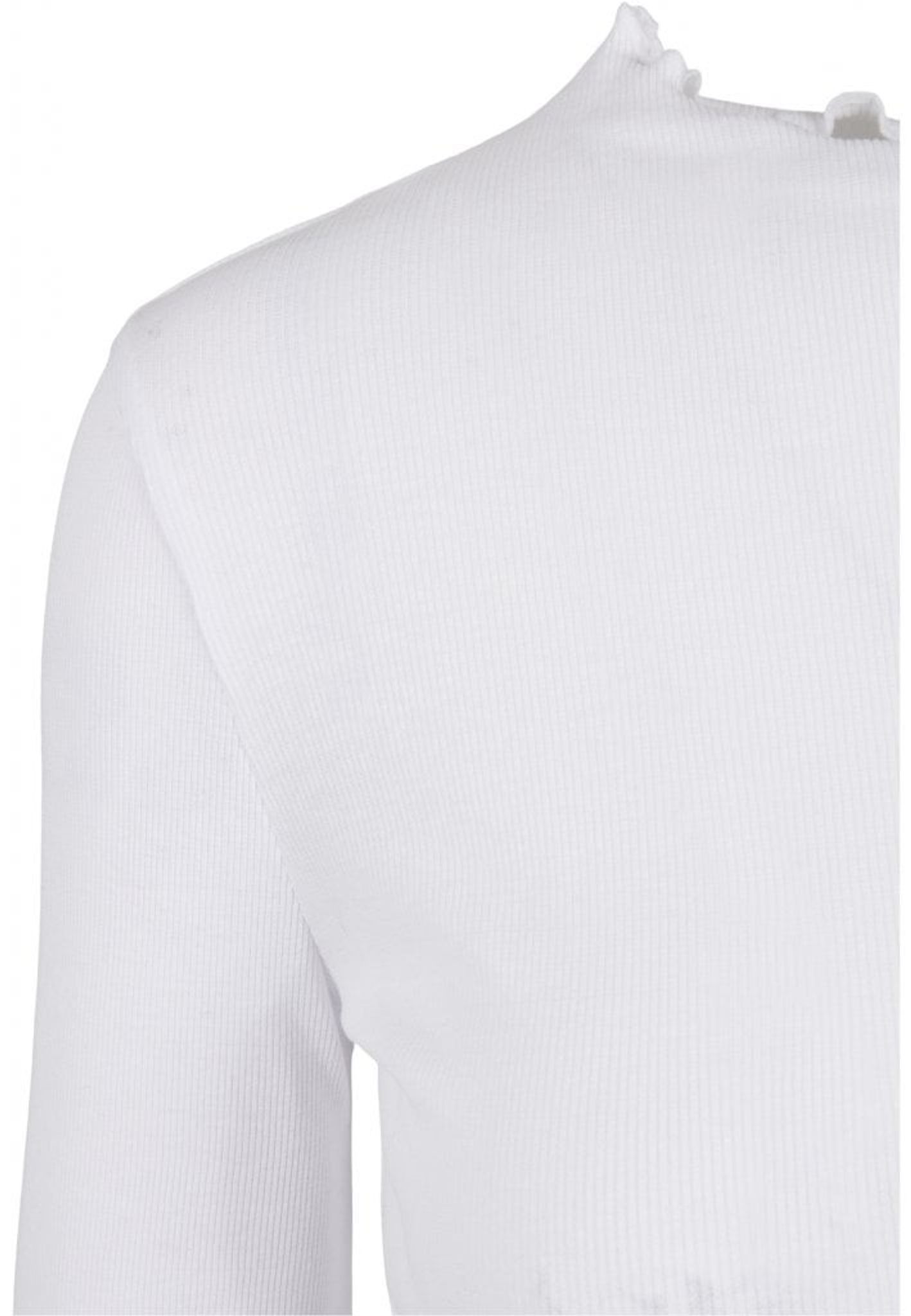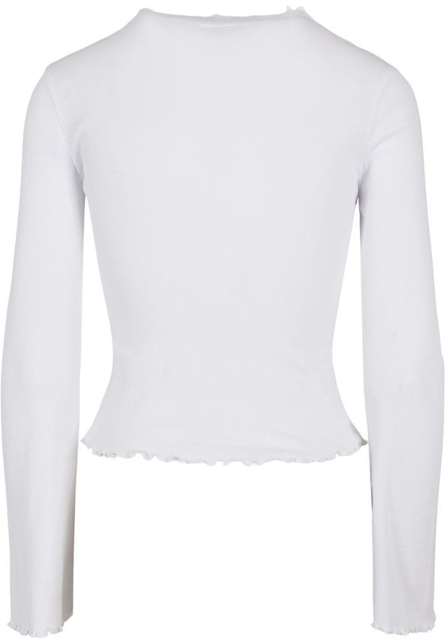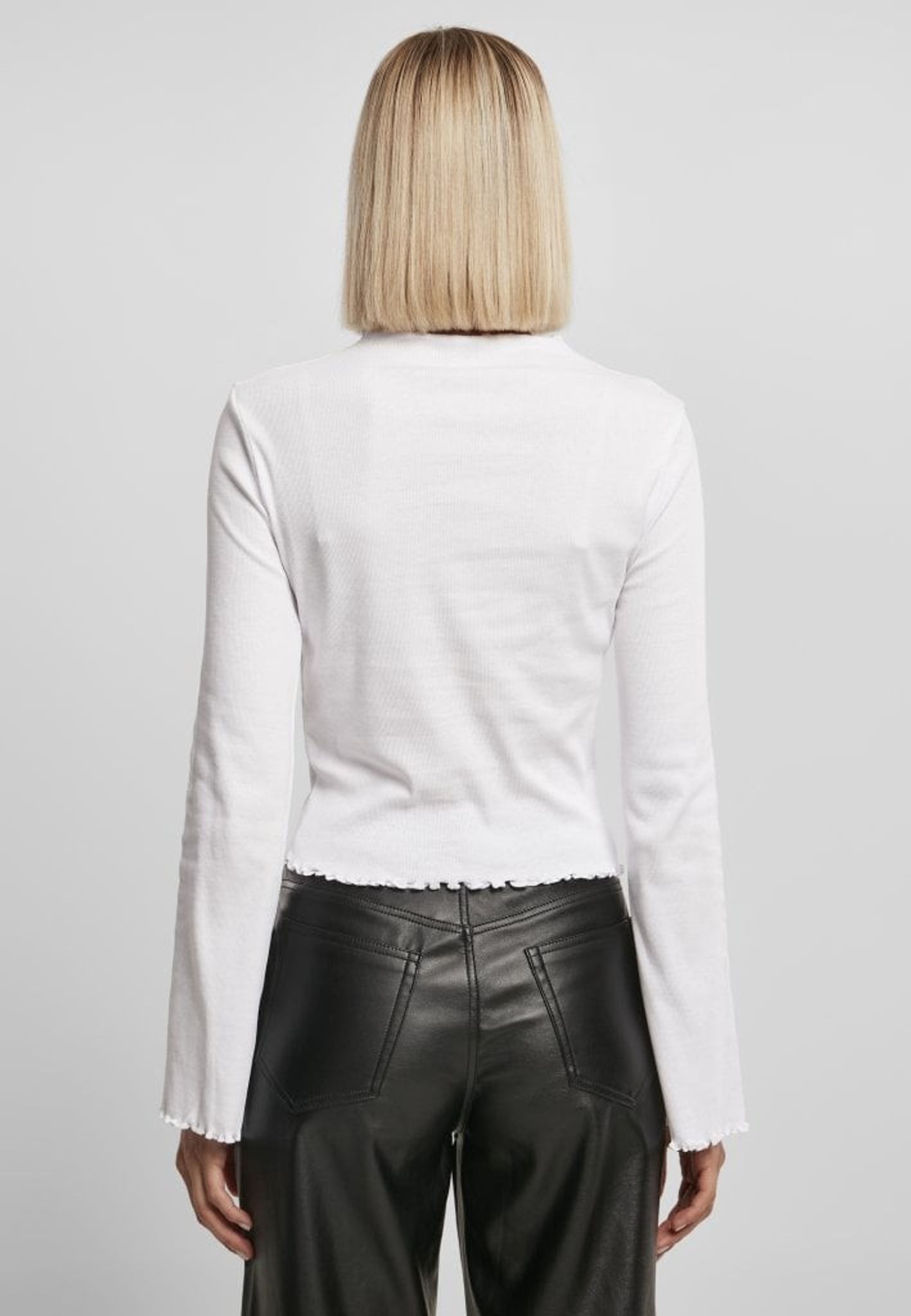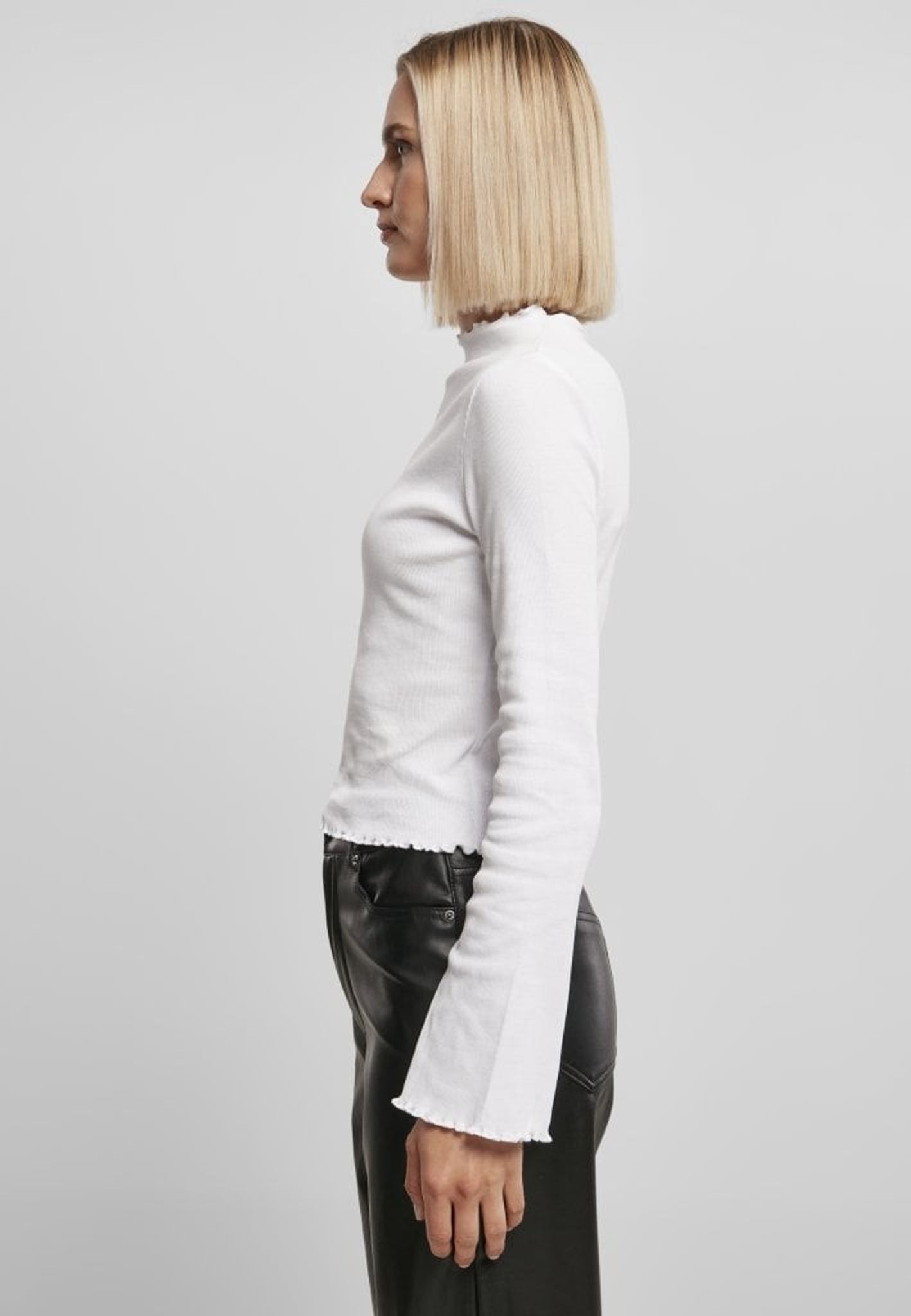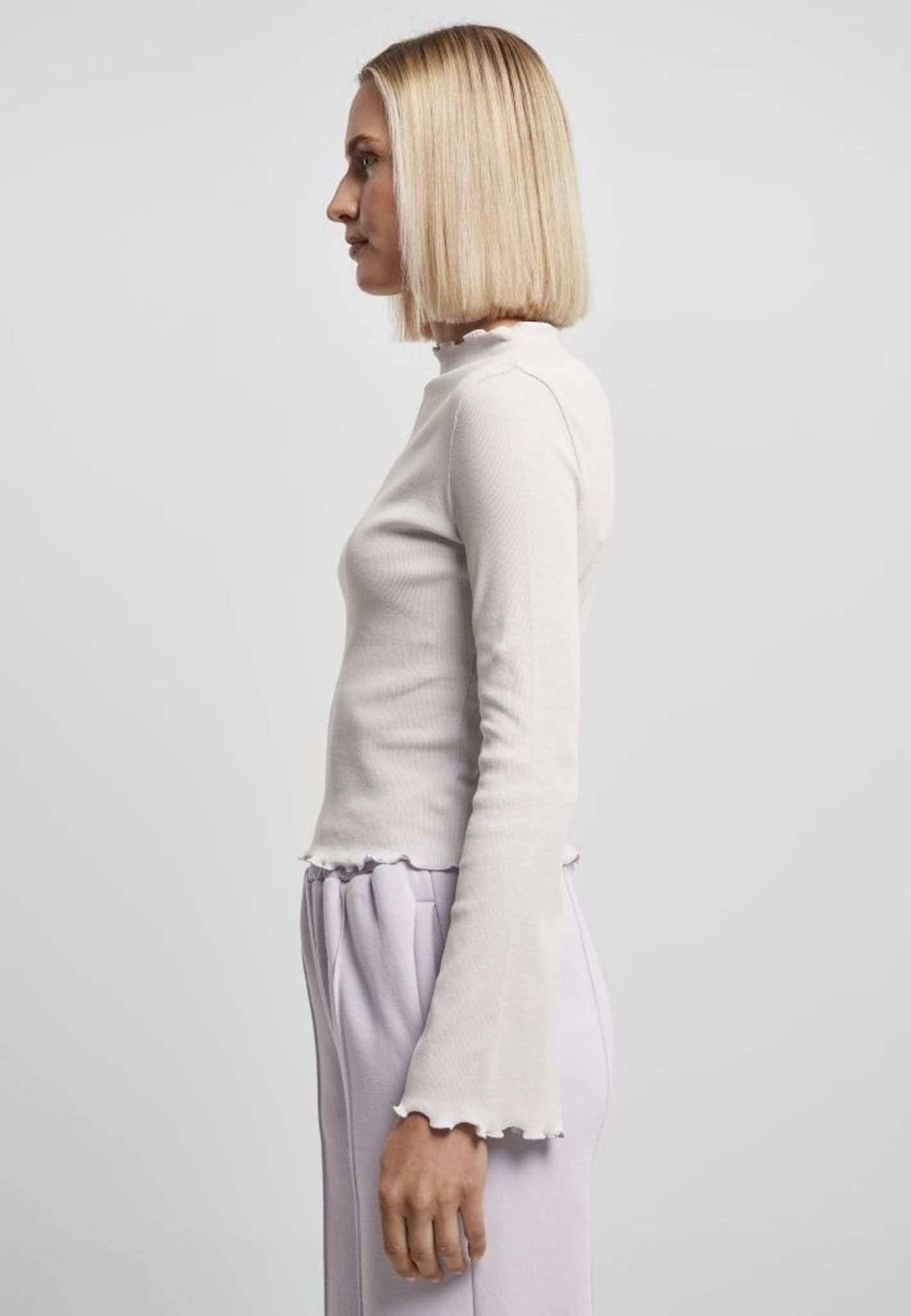 En topp med långa ärmar och ribbat tyg. Denna feminina topp har dessutom rullande follar vid ärmslut och krage. Toppen är gjord i ett strech-ribbmaterial av fin bomull med elastan.
