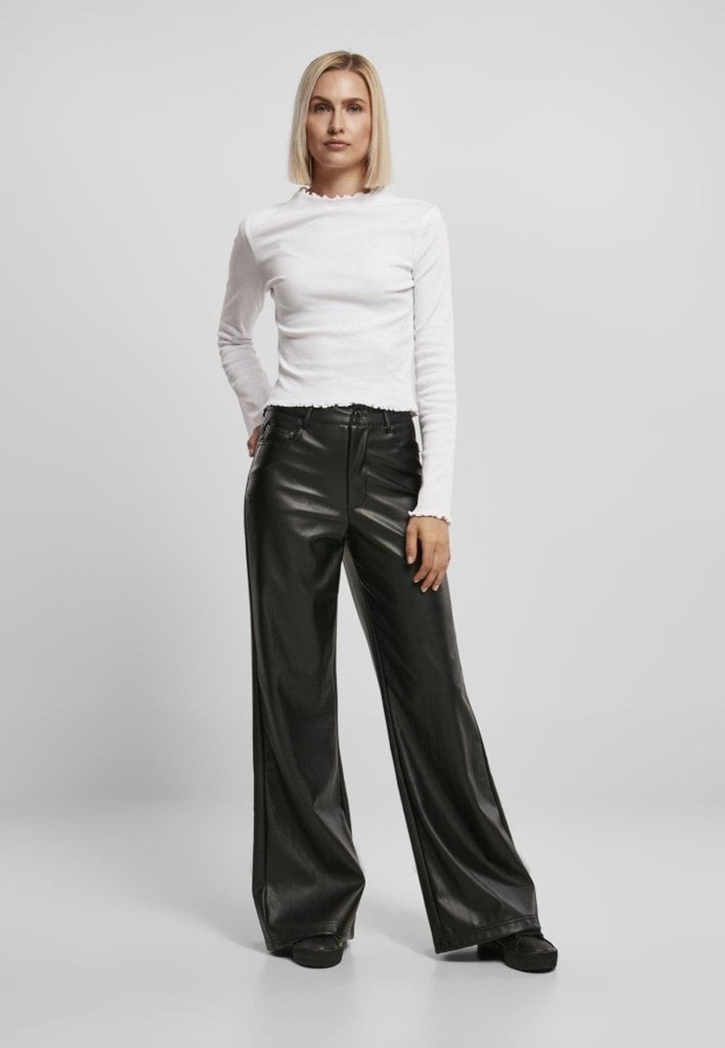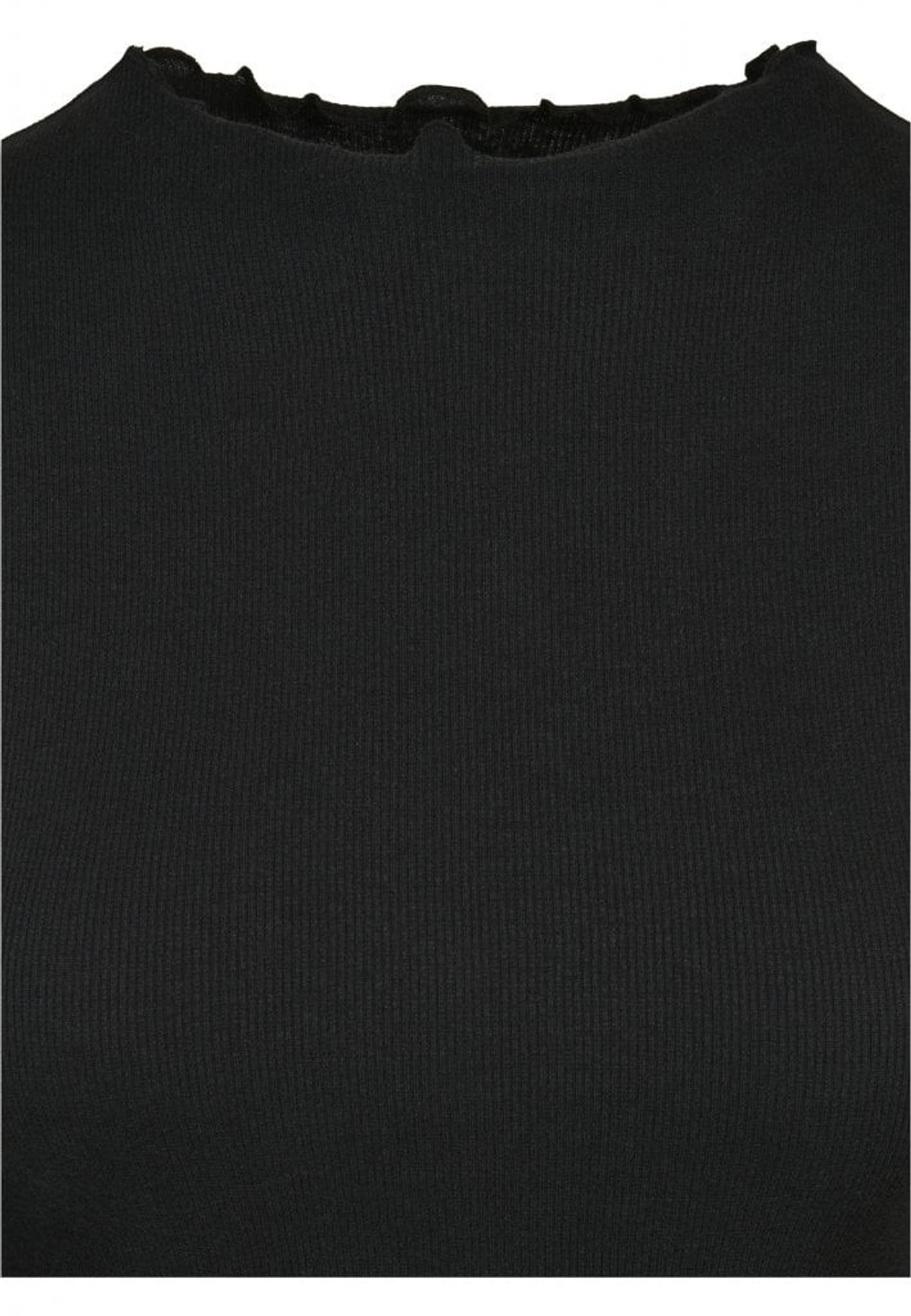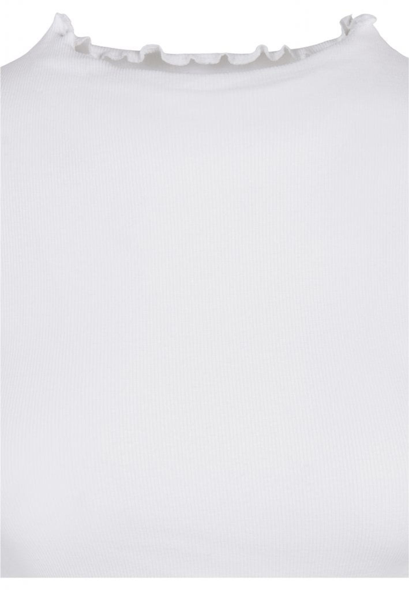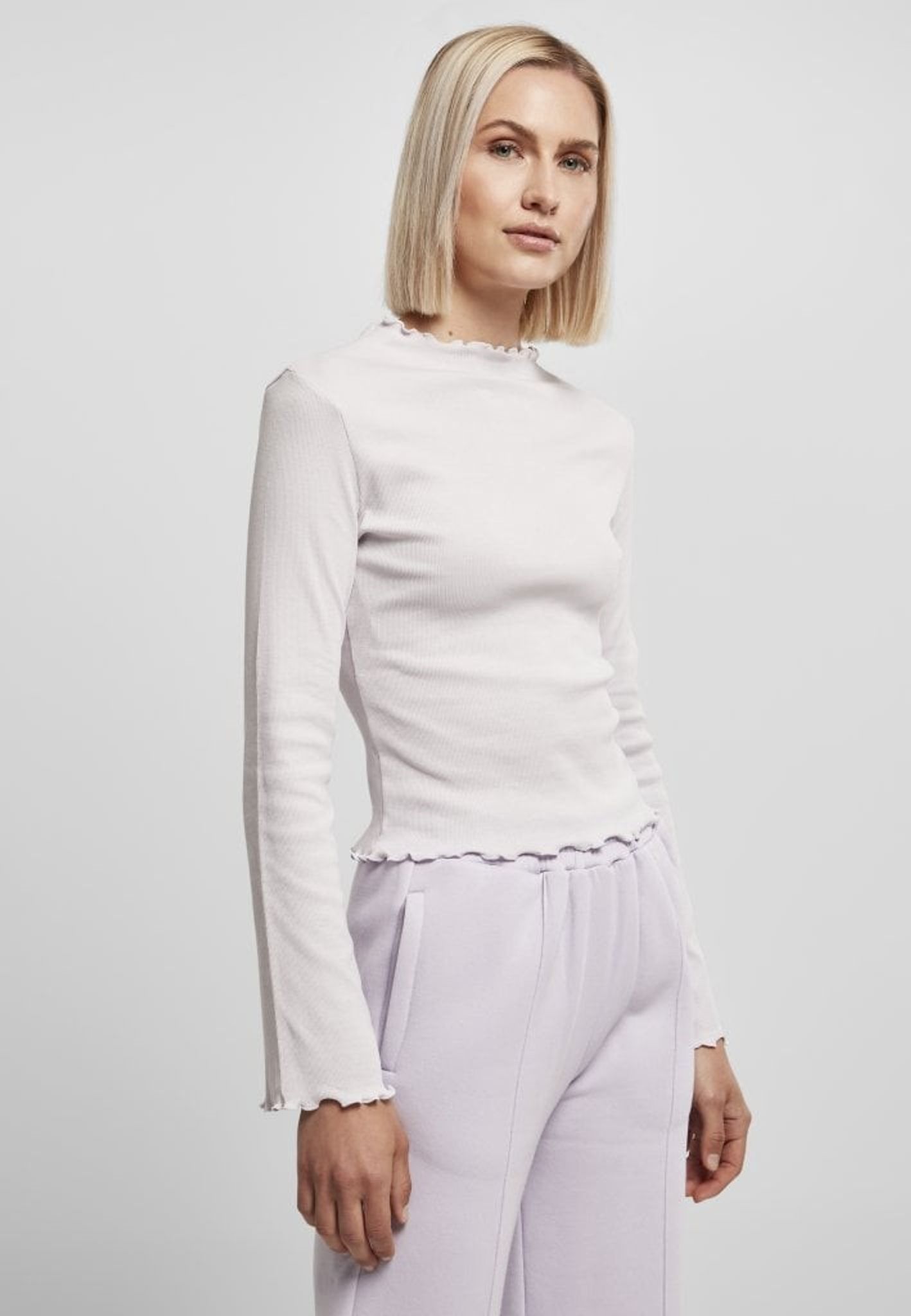 En topp med långa ärmar och ribbat tyg. Denna feminina topp har dessutom rullande follar vid ärmslut och krage. Toppen är gjord i ett strech-ribbmaterial av fin bomull med elastan.