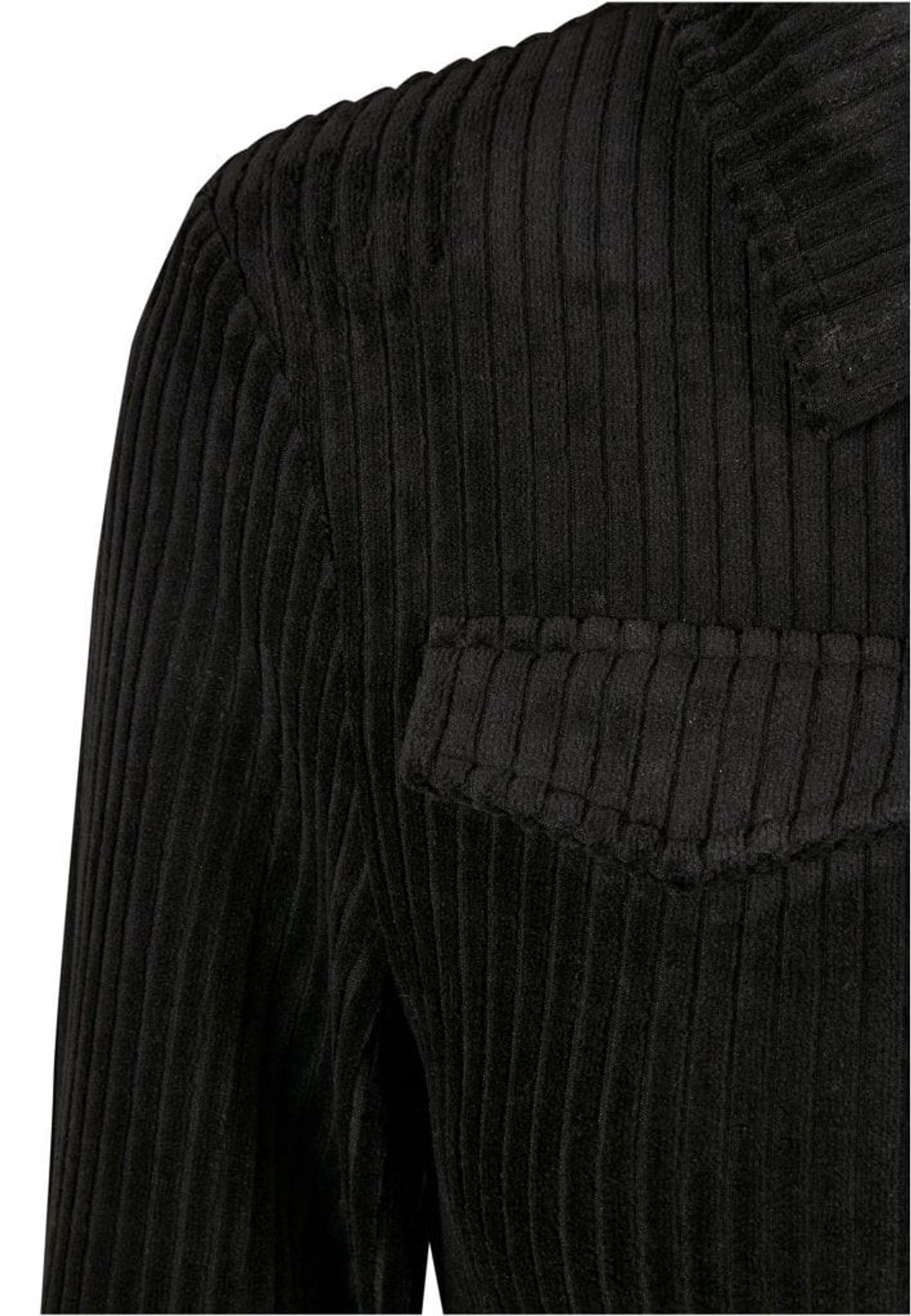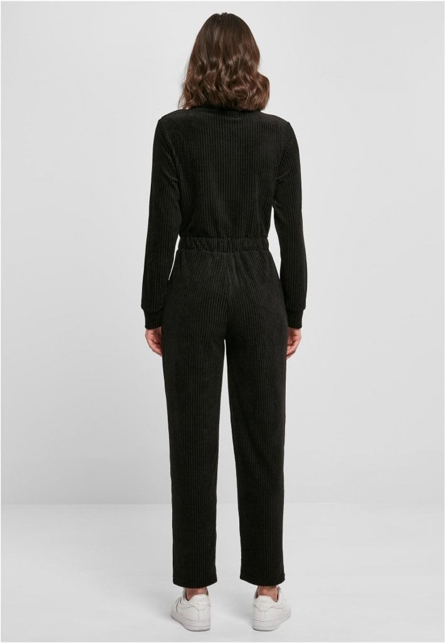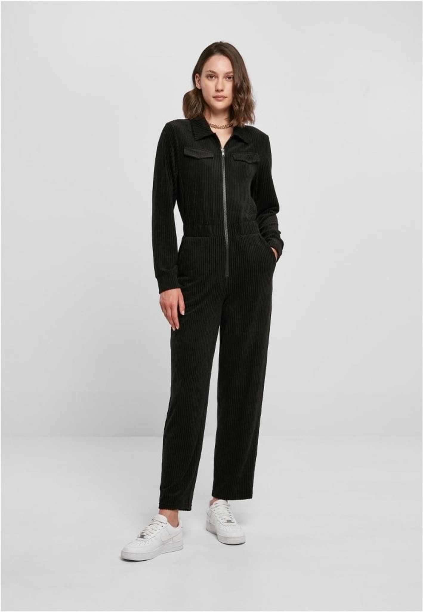 En pragmatisk ribbad overall för kvinnor med en lång metallisk dragkedja, krage och lappade ytor på bröstet. Ett integrerat elastiskt midjeband säkerställer en perfekt passform och en feminin siluett. Kostymen i ett stycke är också utrustad med sidfickor och är gjord av ribbad sammet.