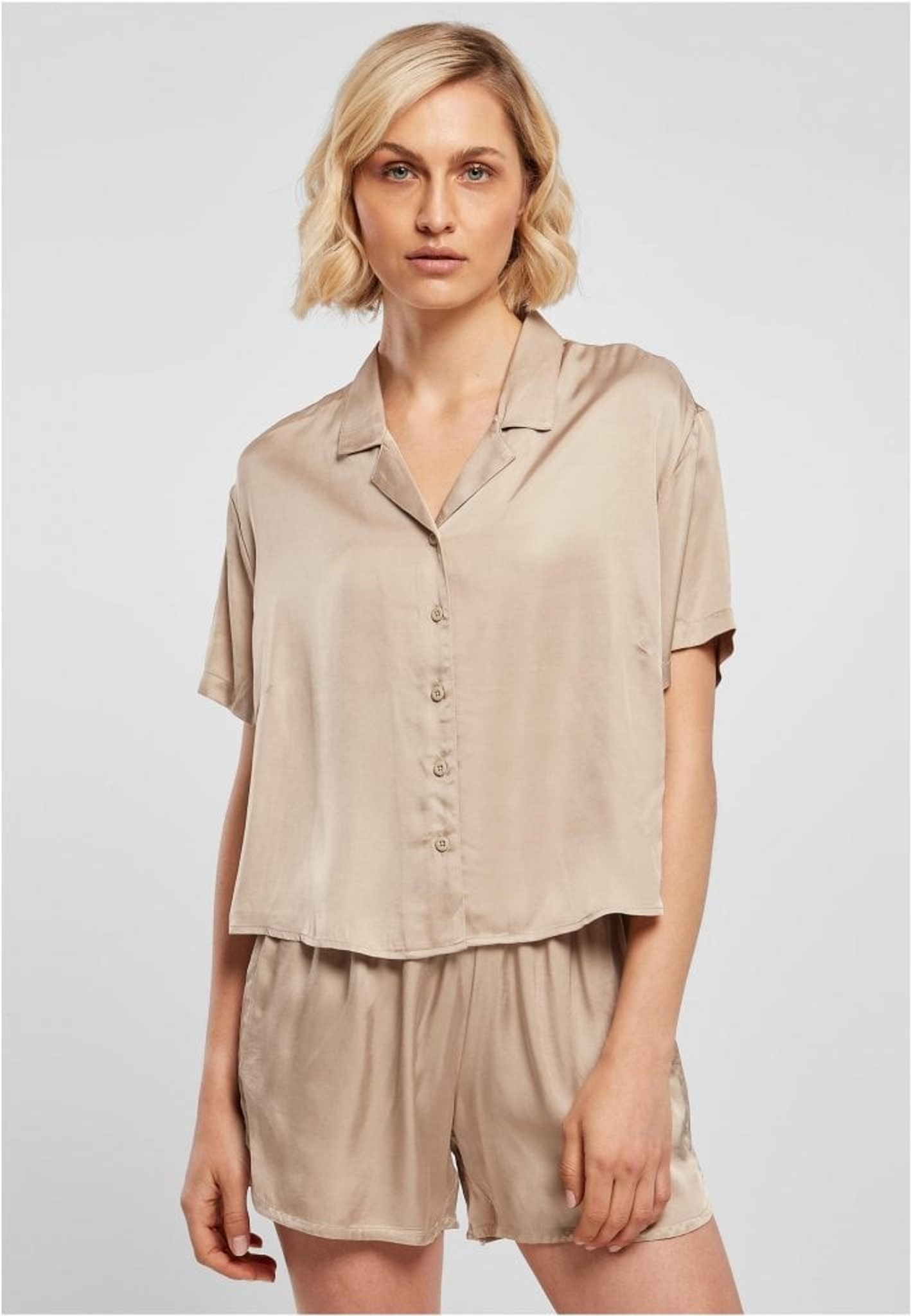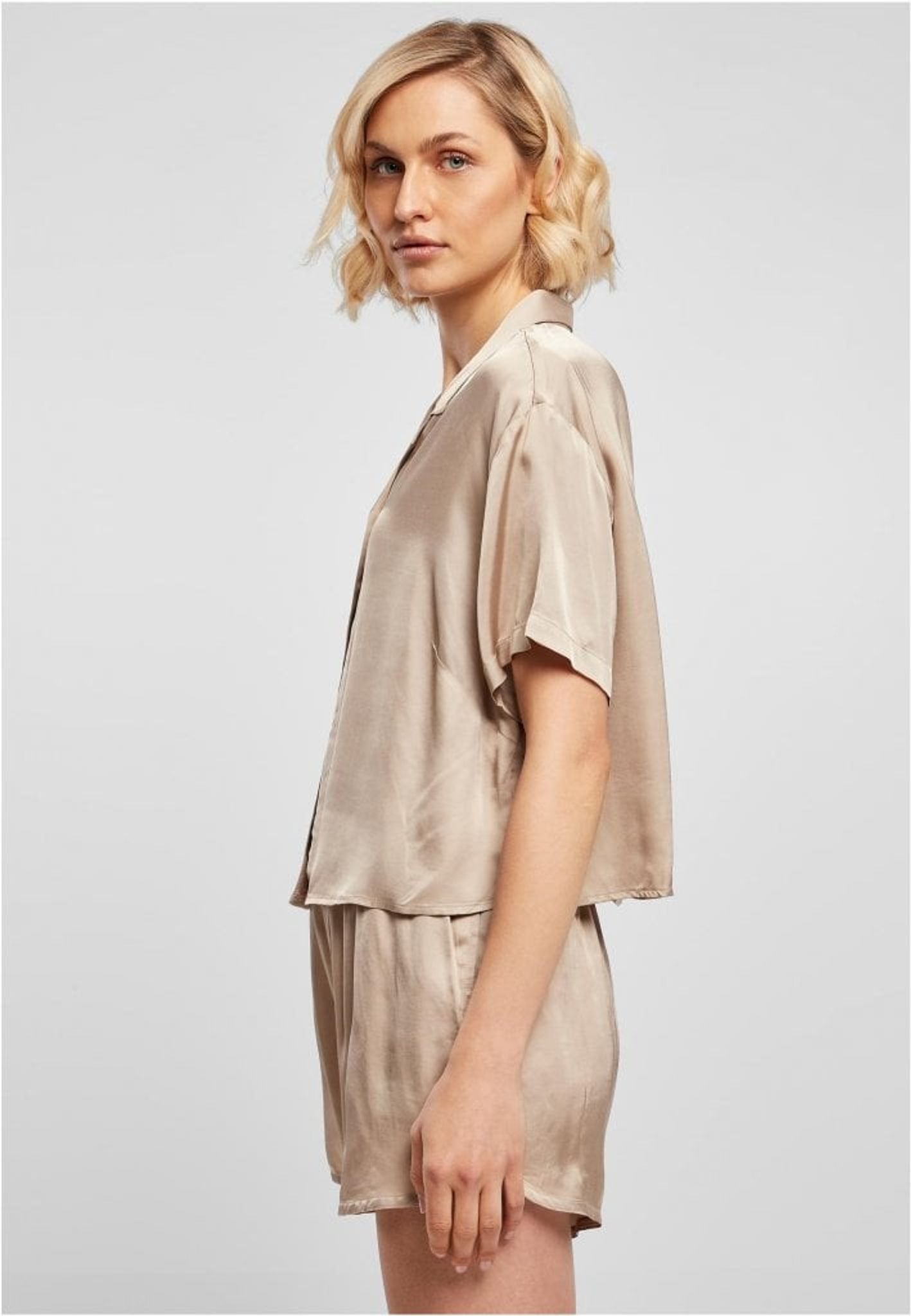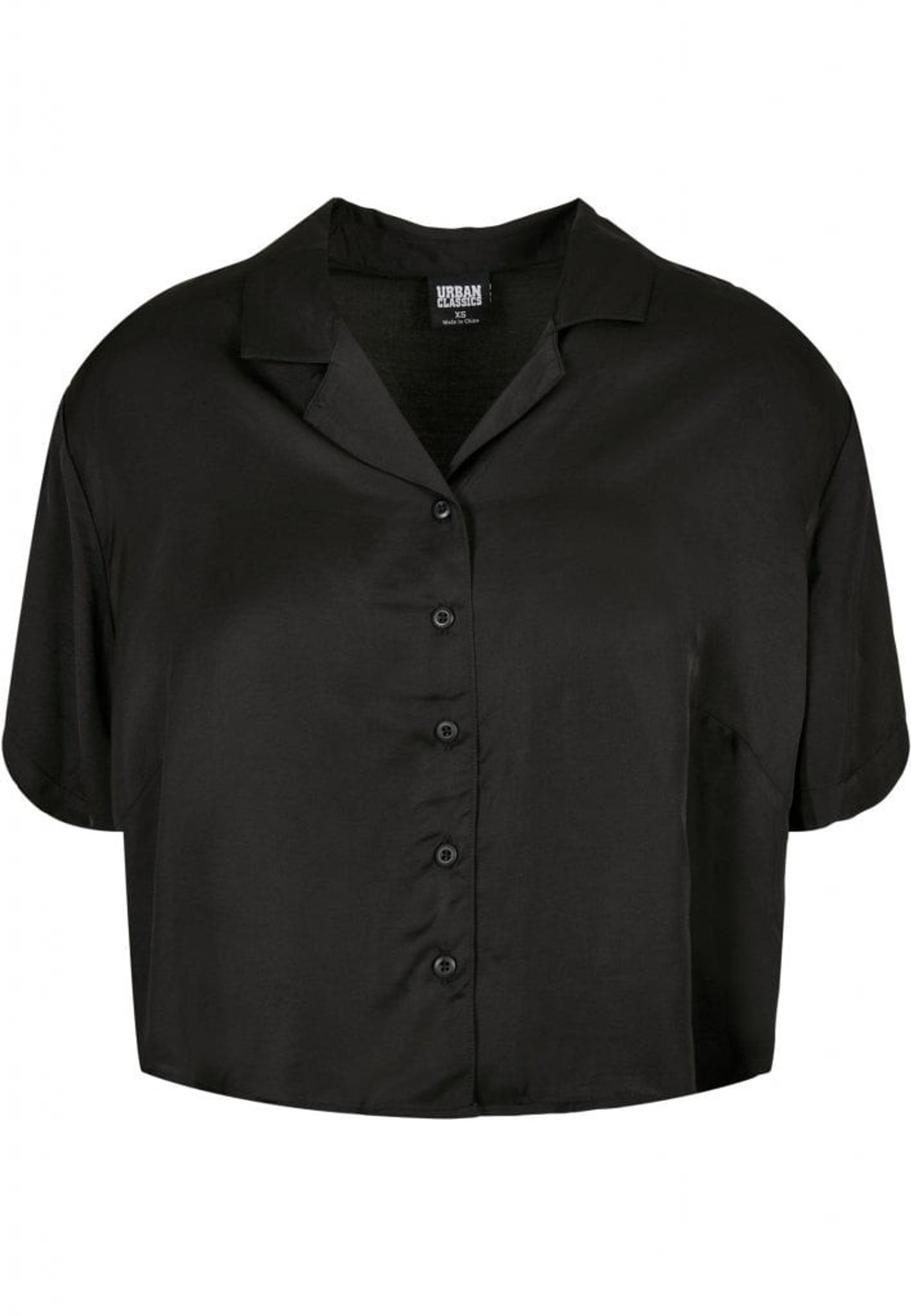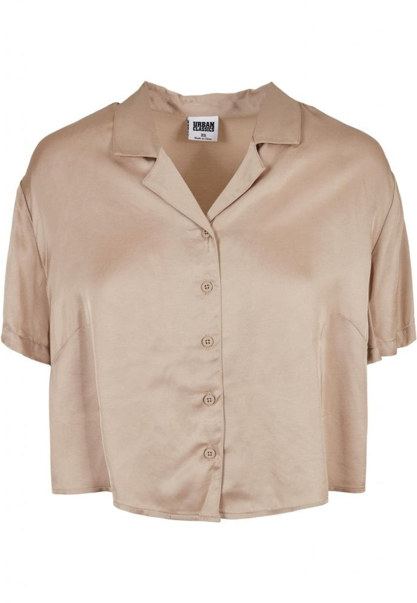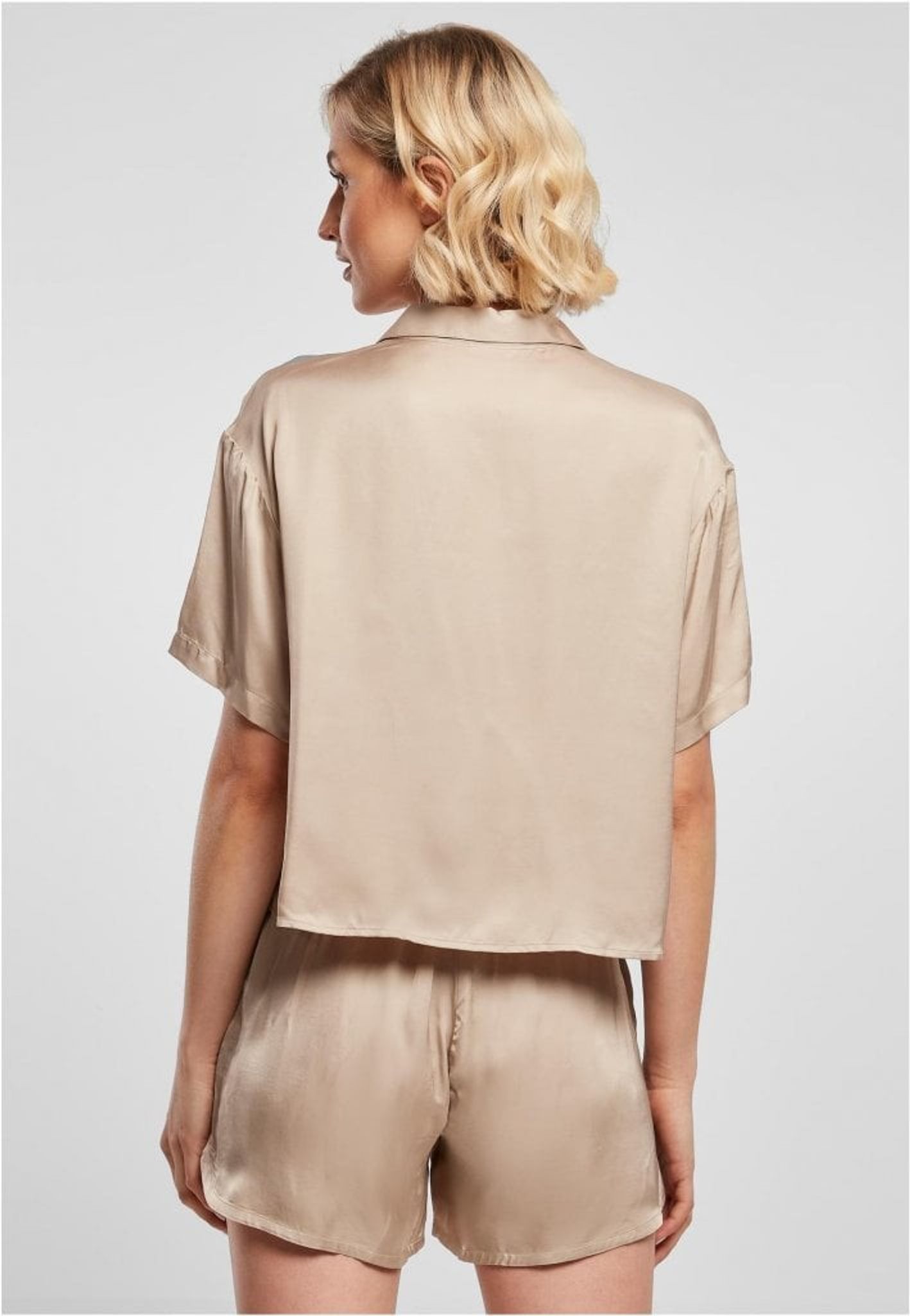 En modern och minimalistisk damblus som är lös i passformen och är gjord i fint sartin tyg med ett kort snitt som når precis ovanför höfterna.