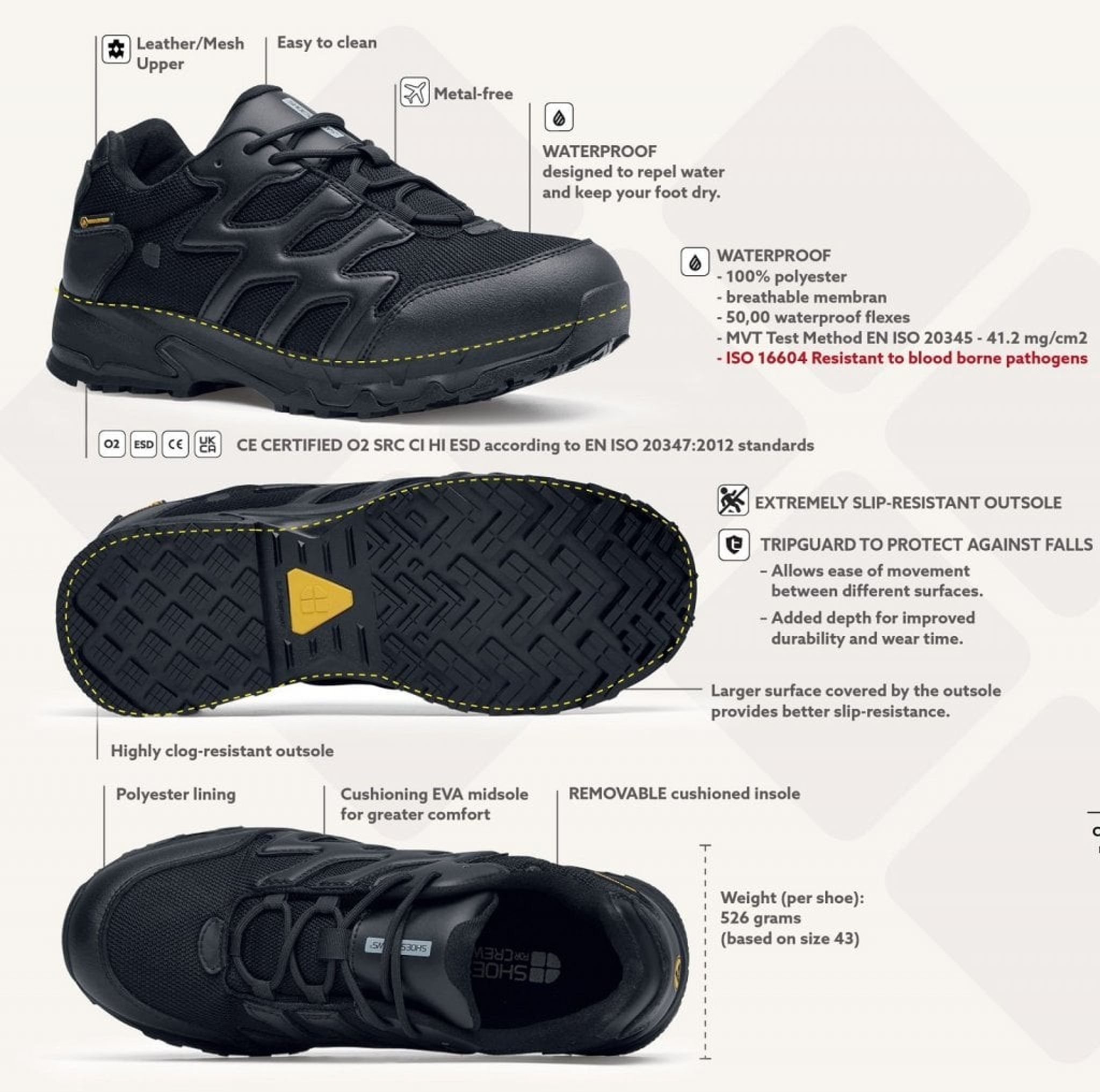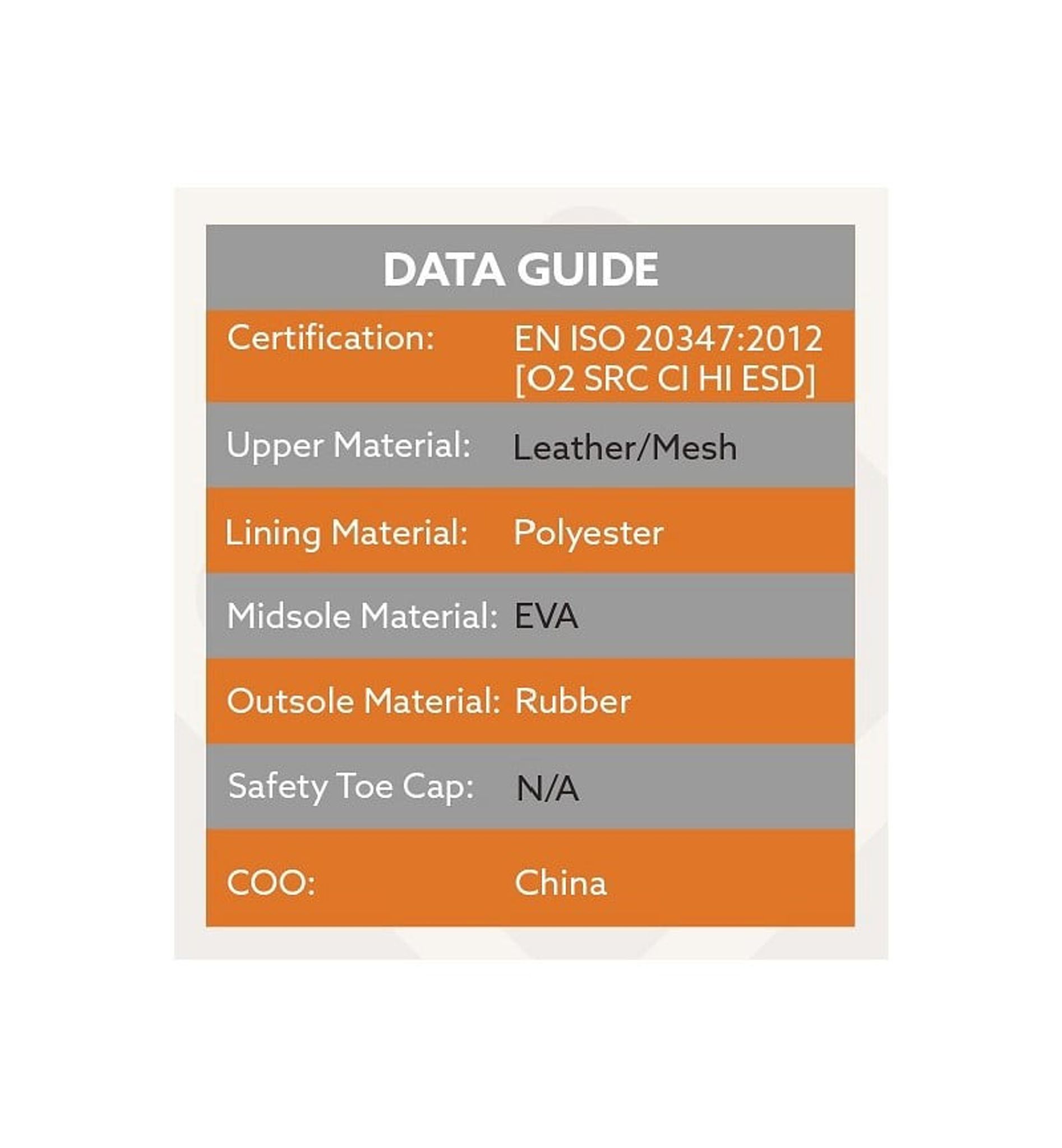 - Certifieringar: CE certifierad 02 SRC CI HI ESD enligt EN ISO 20347:2012 standarder