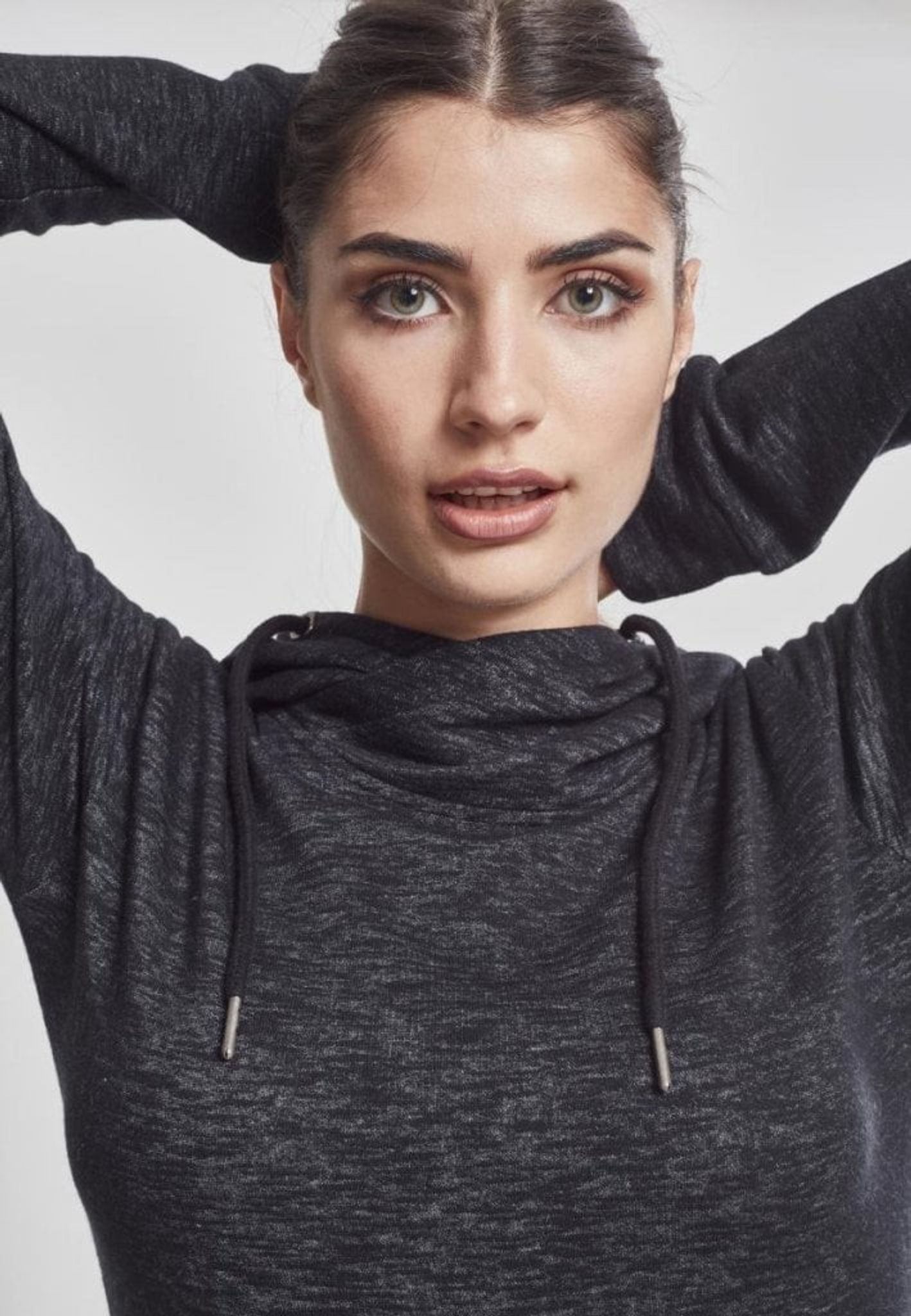 En melerad huvtröja i längre modell. Hoodien har hög krage med omvänd huva och stora metallöglor till snören. Känguruficka fram som är draperad.