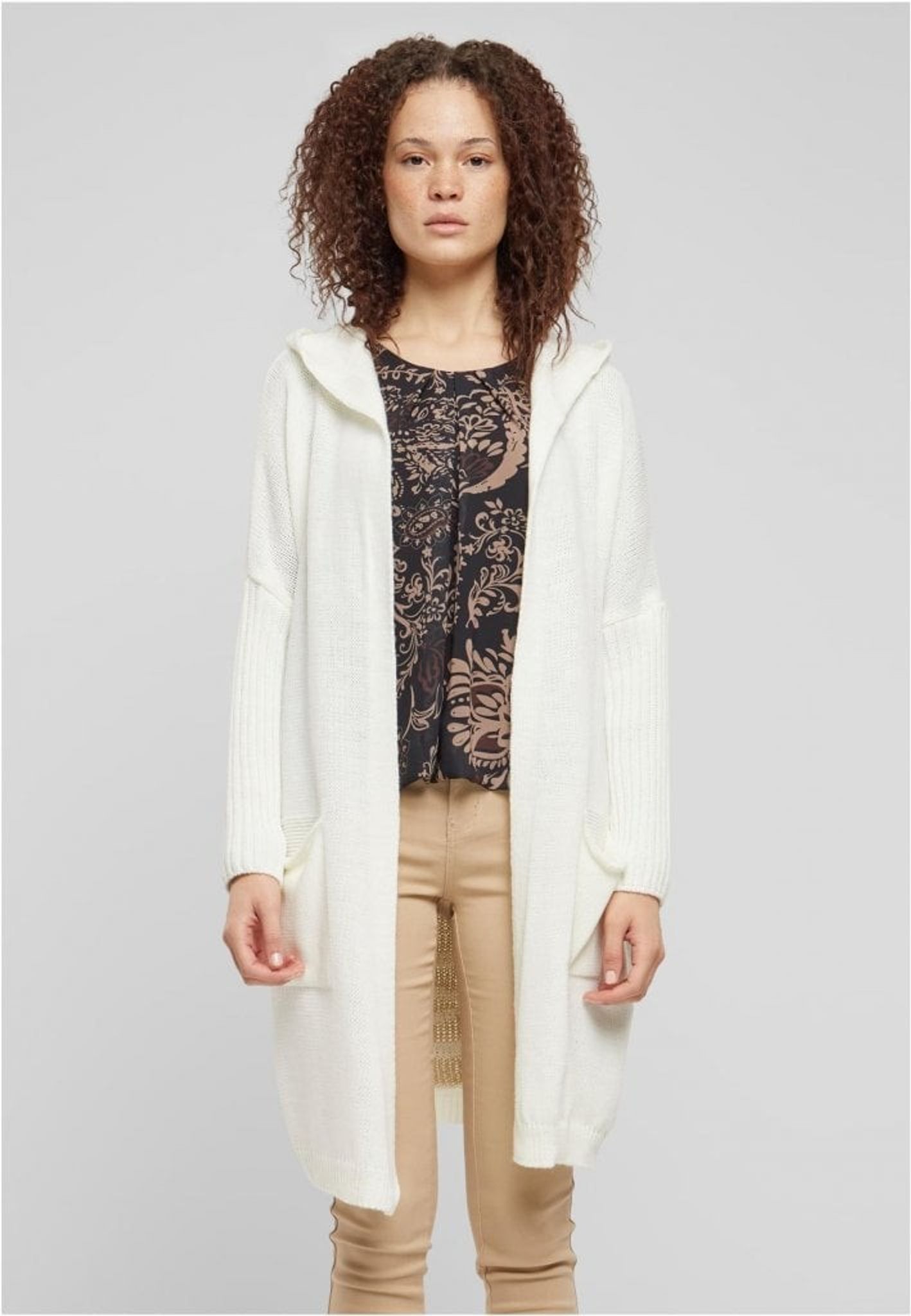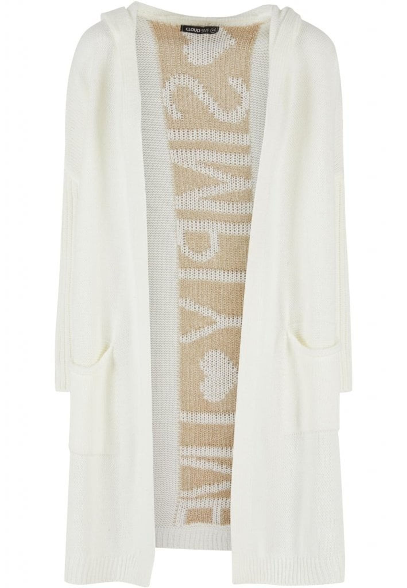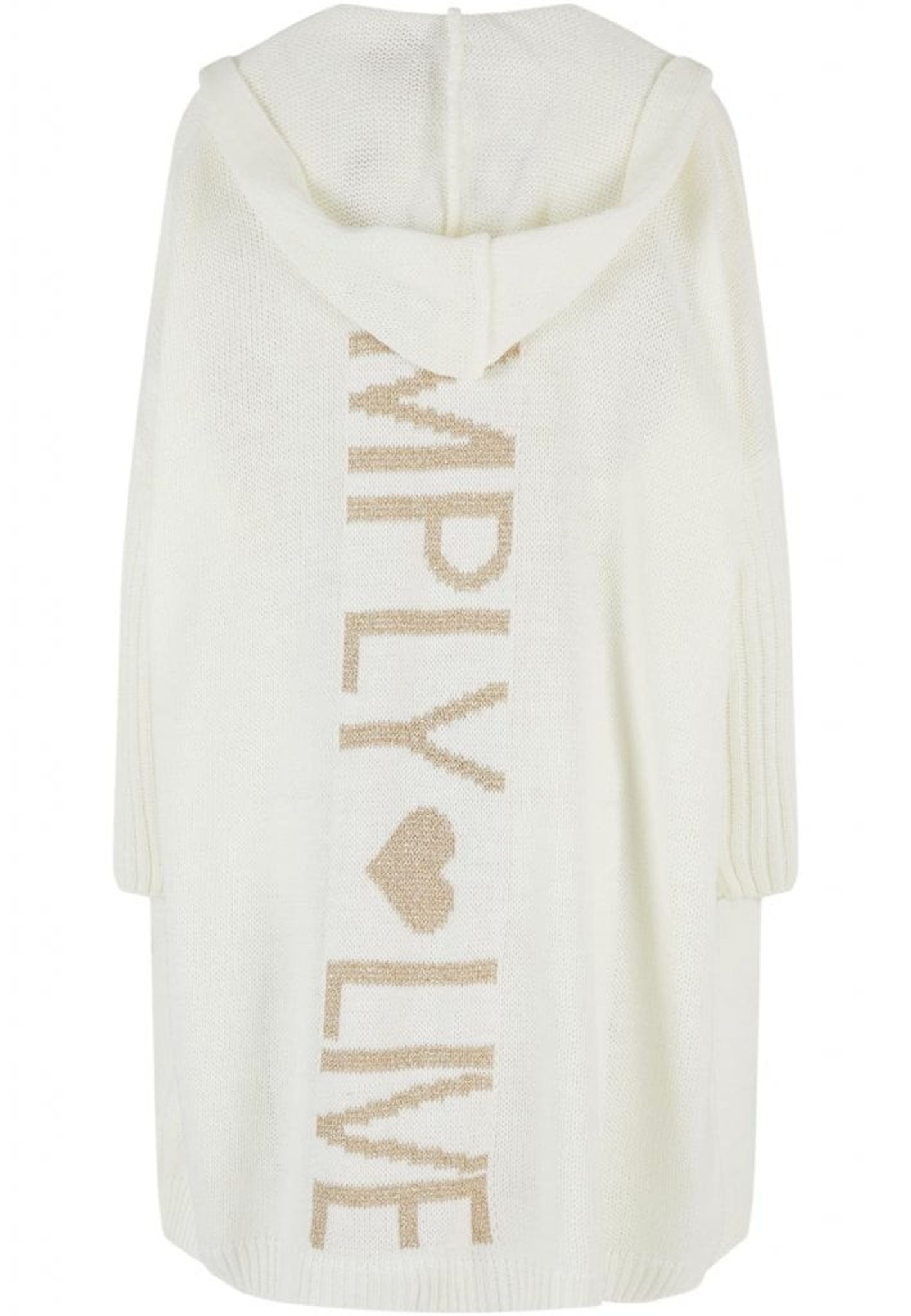Denna eleganta och bekväma långa kofta, "Simply Live". Den är designad med en avslappnad passform som ger en ledig men samtidigt sofistikerad silhuett. Koftan kommer i en lugnande elfenbensvit färg med stilfulla detaljer i beige som framhäver ordet "LIVE" och ett hjärta, vilket tillför en subtil men meningsfull touch till designen.