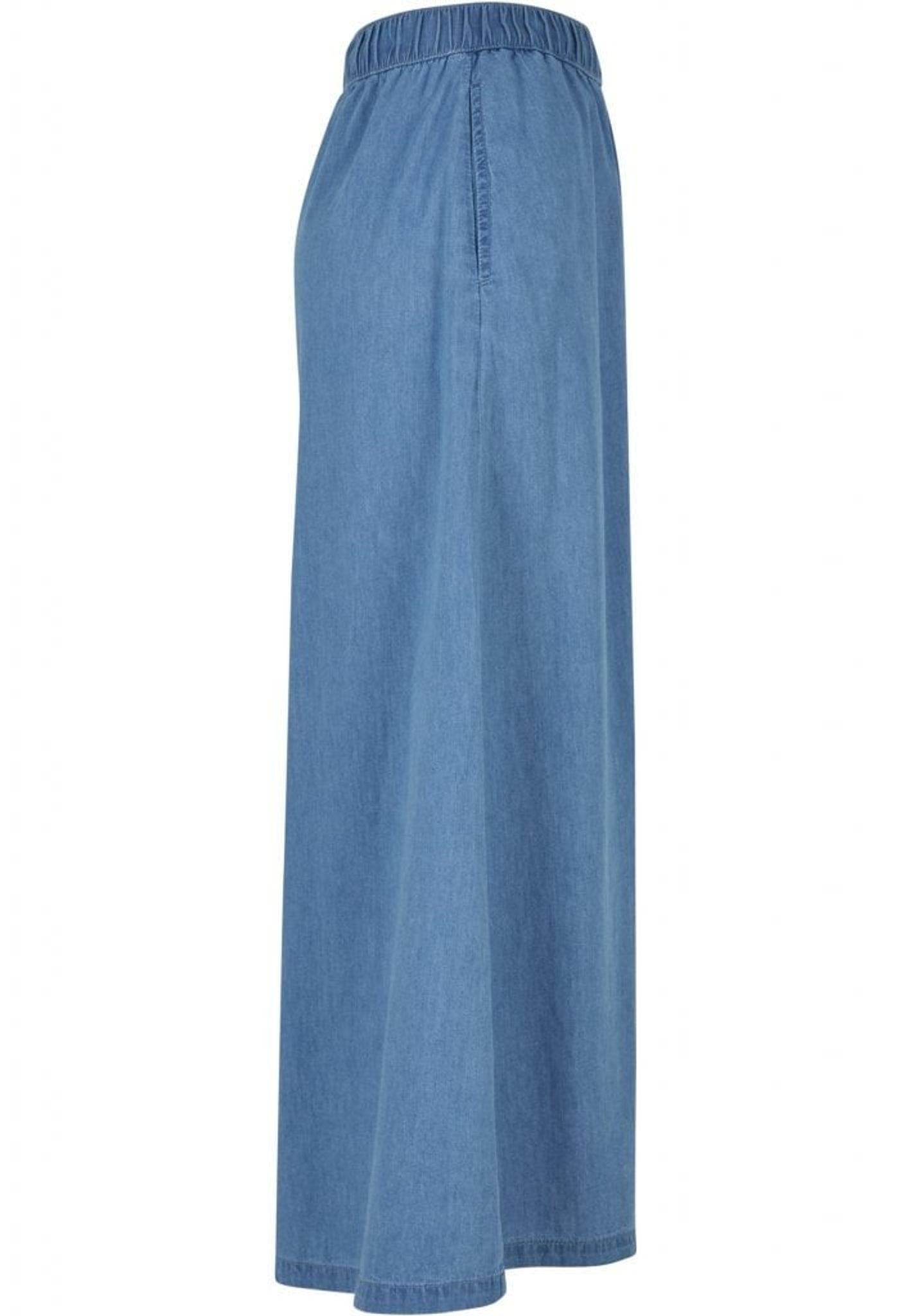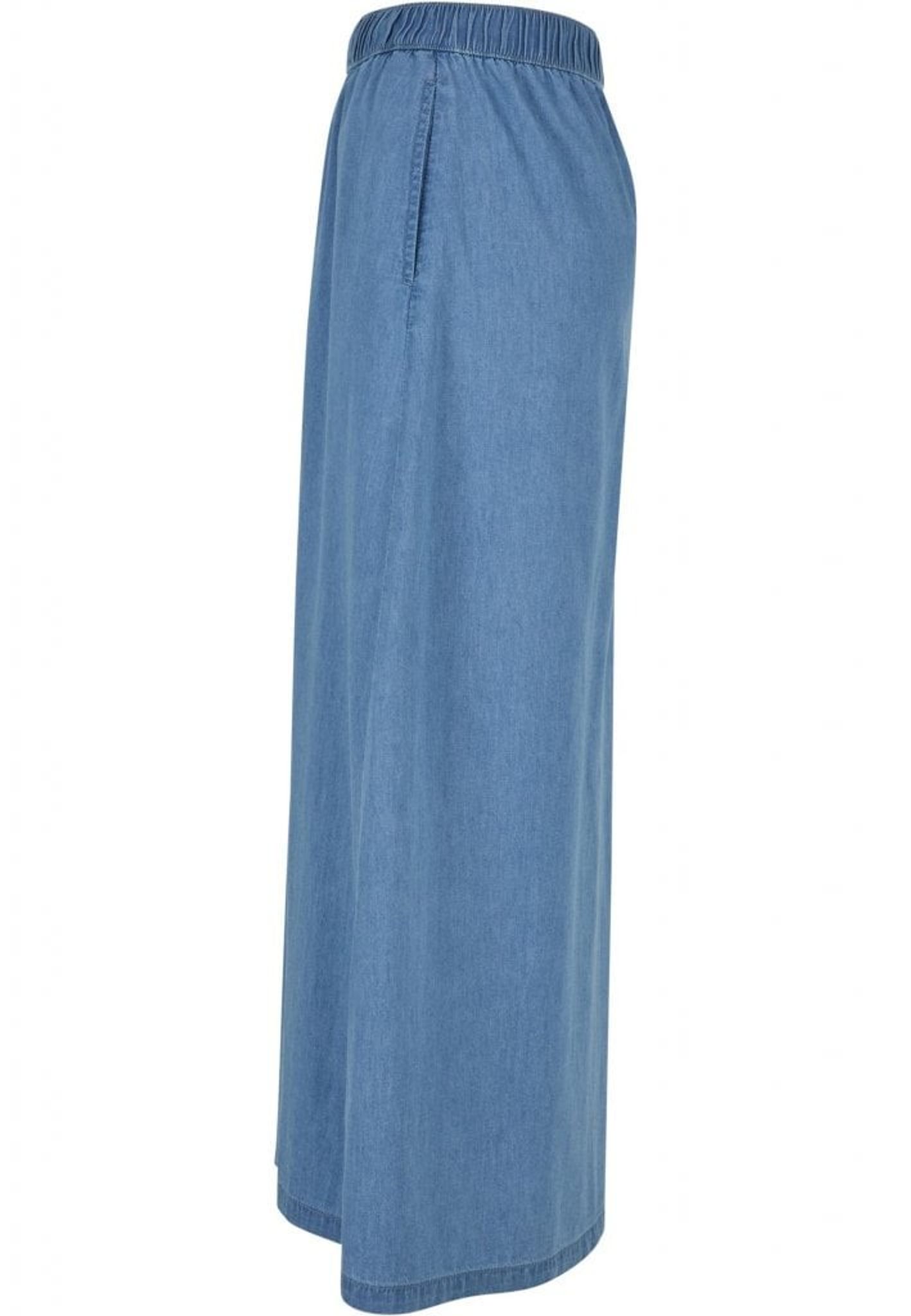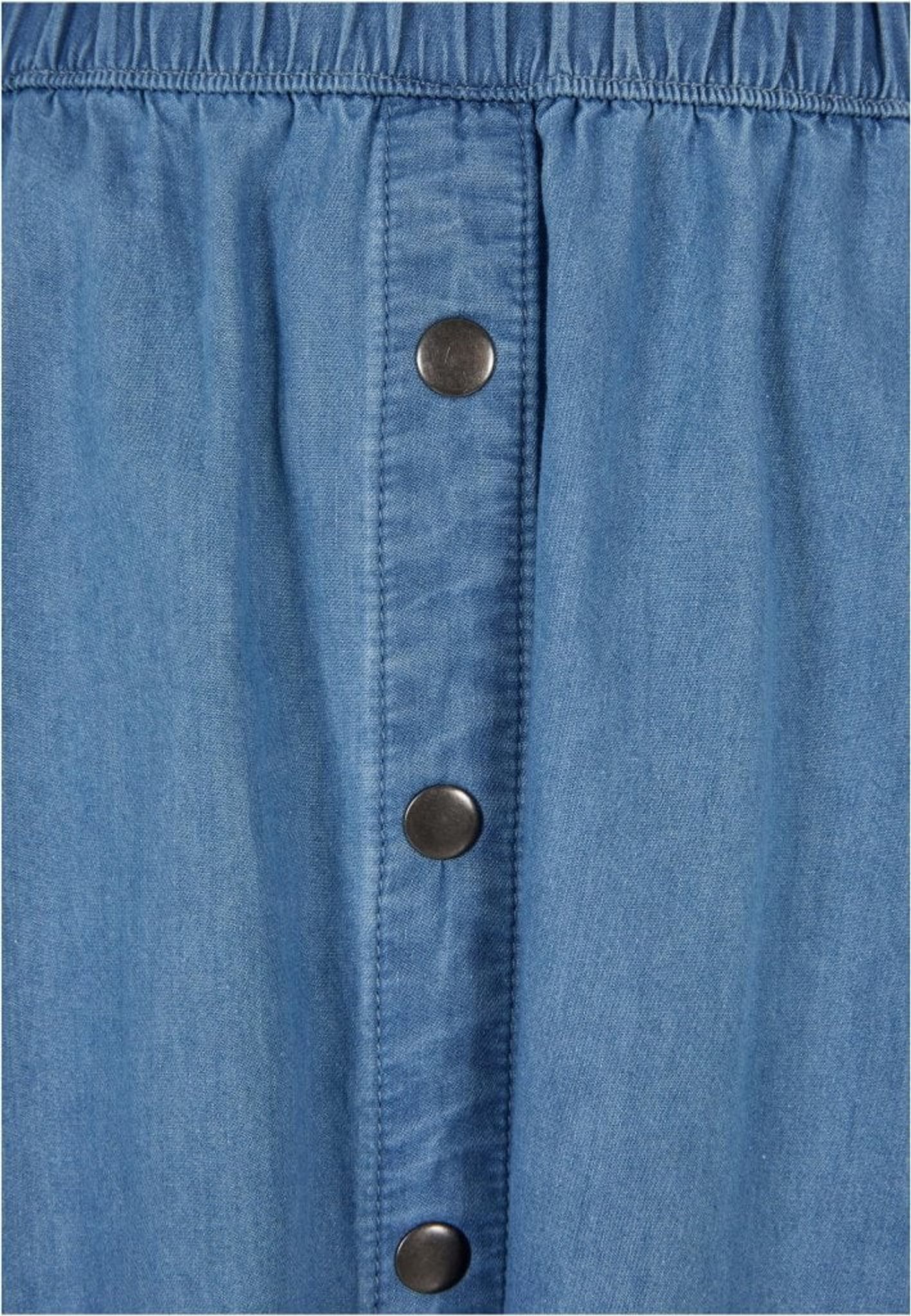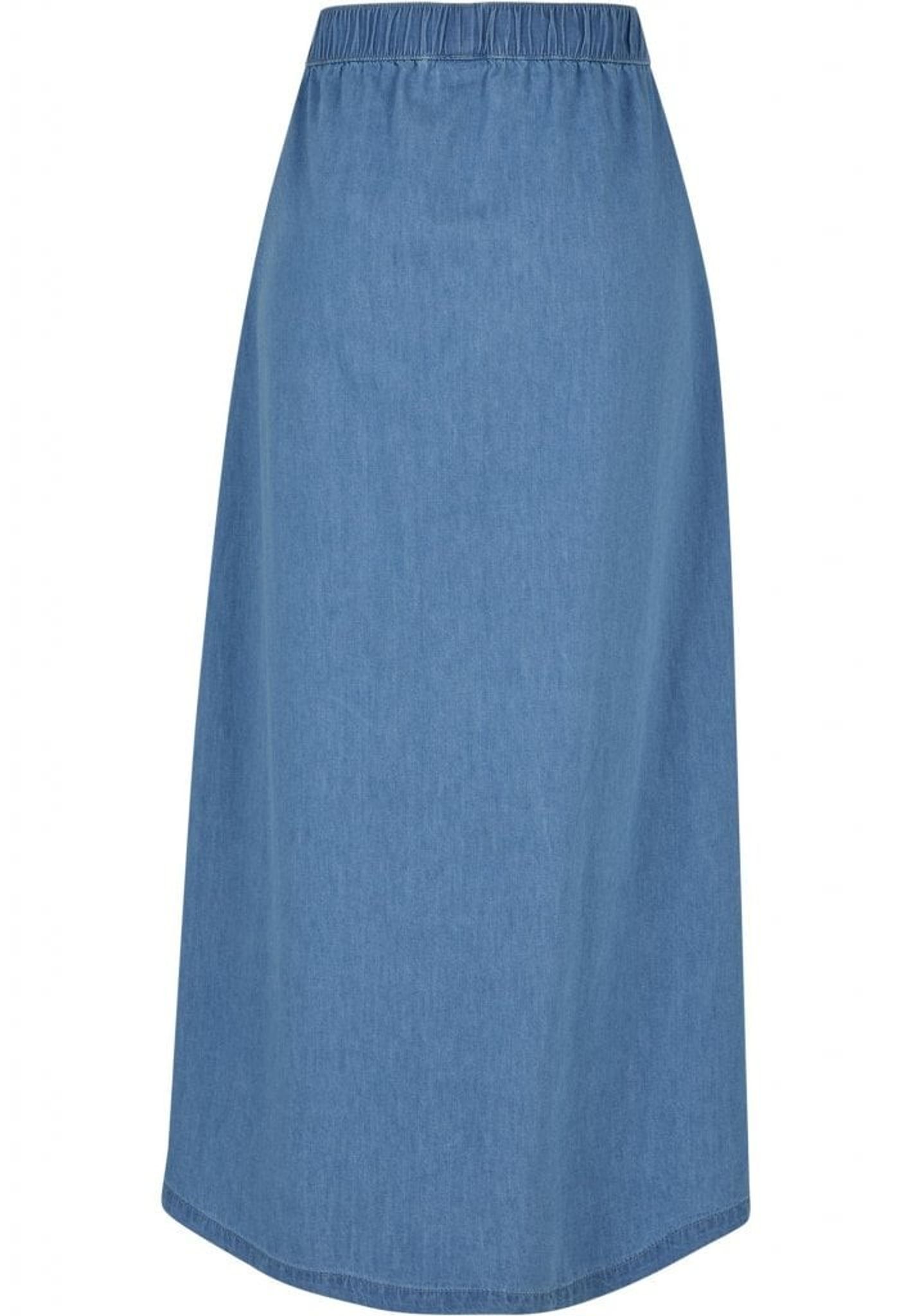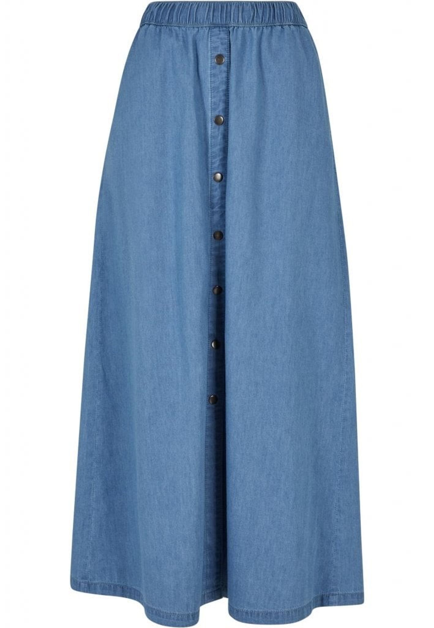 Denna långa tunna jeanskjol har en distinkt design med en knappremsa som pryds av metallpressknappar i mitten. Knappremsan är dock inte nödvändig för att ta på sig kjolen, eftersom den också har en elastisk midja som sträcker sig efter behov. Kjolen har en löst passform som slutar ovanför ankeln och är utrustad med två sidofickor. Materialet som används är en lätt denim-bomull.