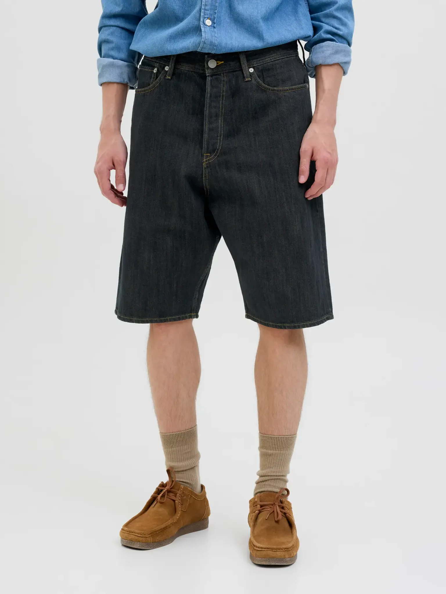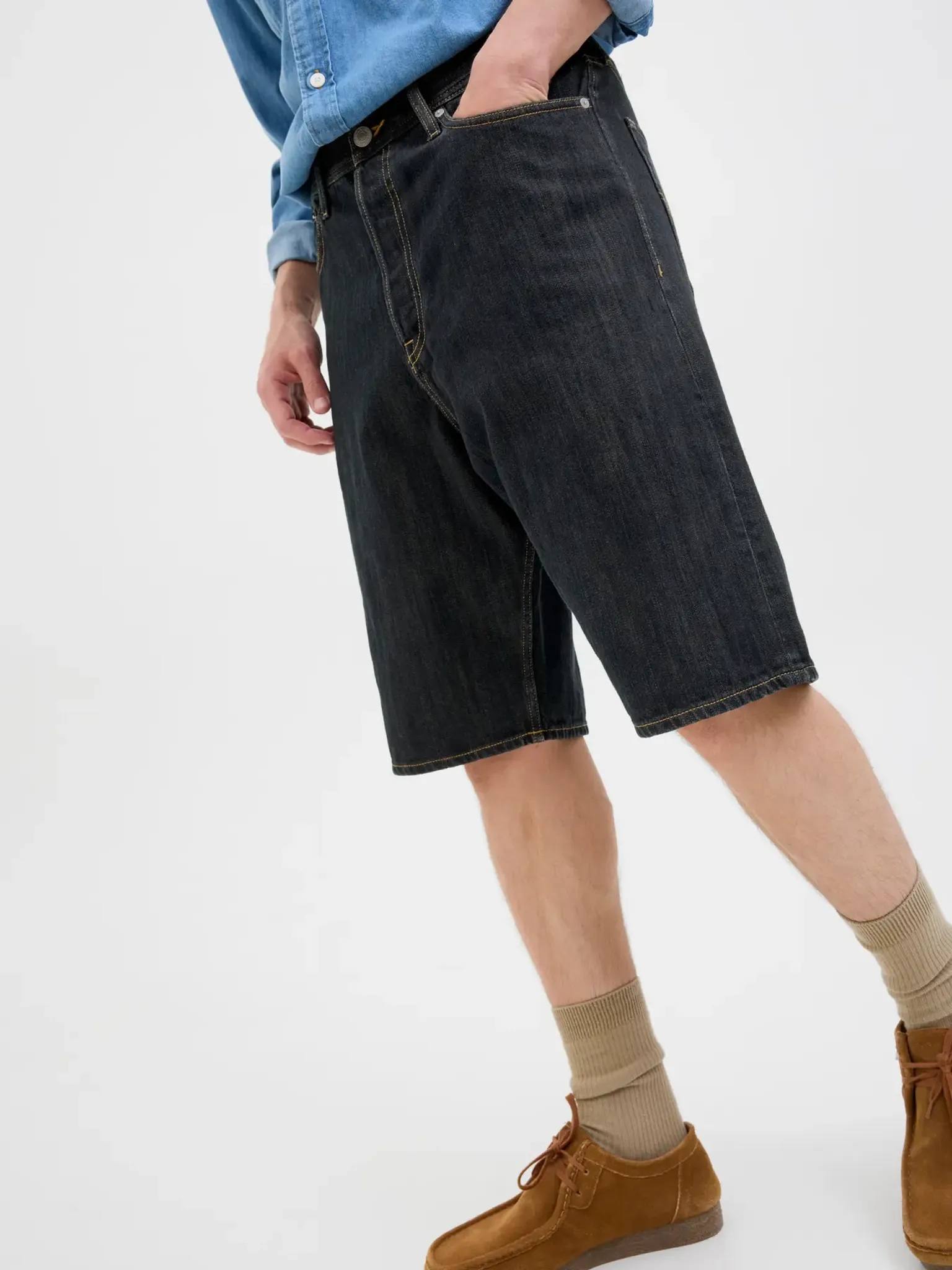 Tillverkade i 100 % bomull och vävda i twillstruktur, erbjuder shortsen en robust känsla utan stretch – vilket ger dem det där traditionella, autentiska jeansutseendet och en formfast passform som håller över tid. Gylfen stängs med knappar i klassisk jeansstil.