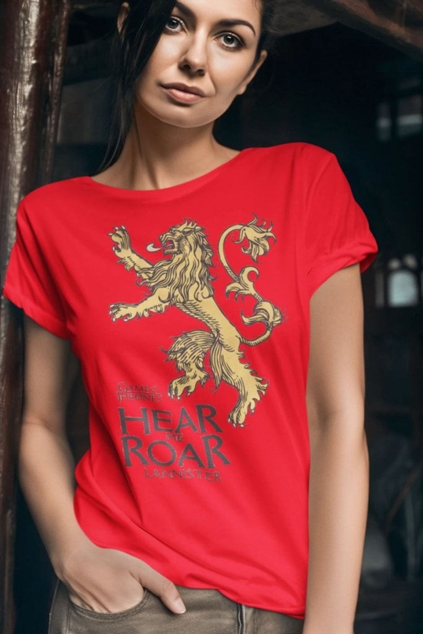 Vår Tjej T-shirt är inte bara en vanlig tröja - den är en hyllning till det gyllene lejonet, symbolen för huset Lannister från "Game of Thrones". Med en majestätisk pose och stolt hållning representerar lejonet styrka, makt och överlägsenhet, precis som Lannister-familjen själva.