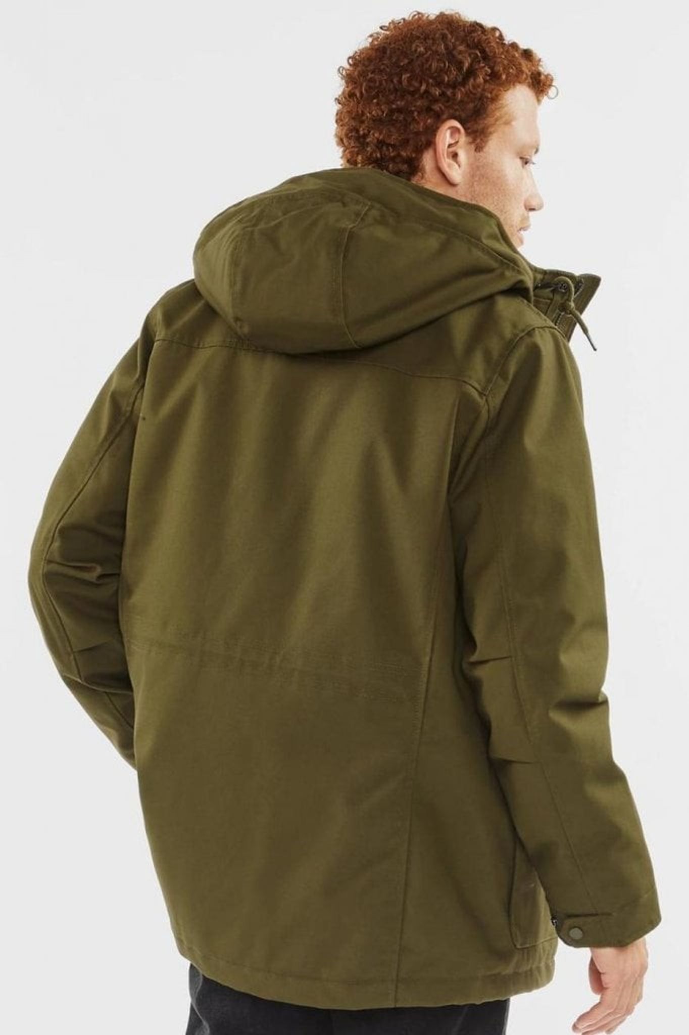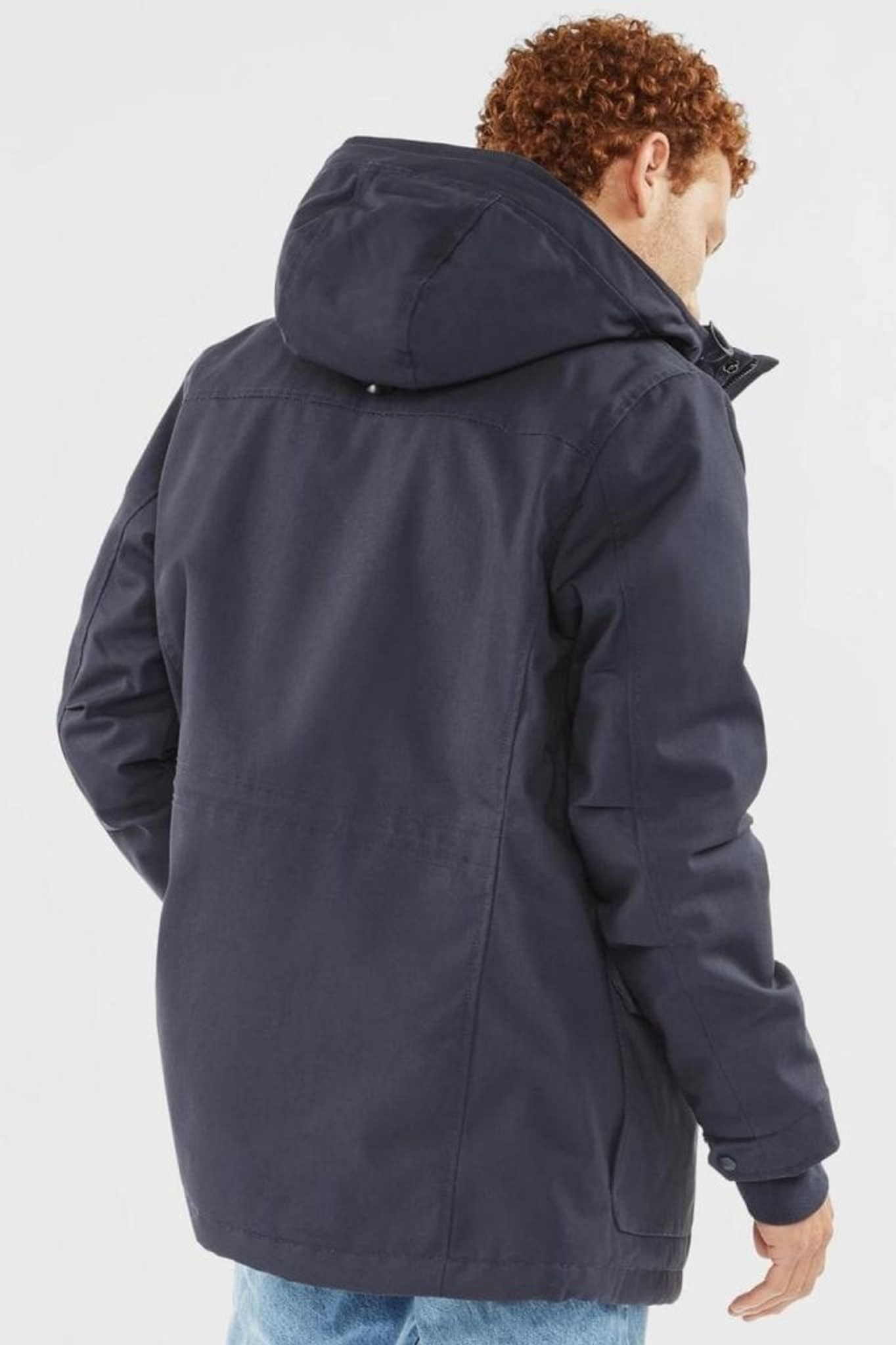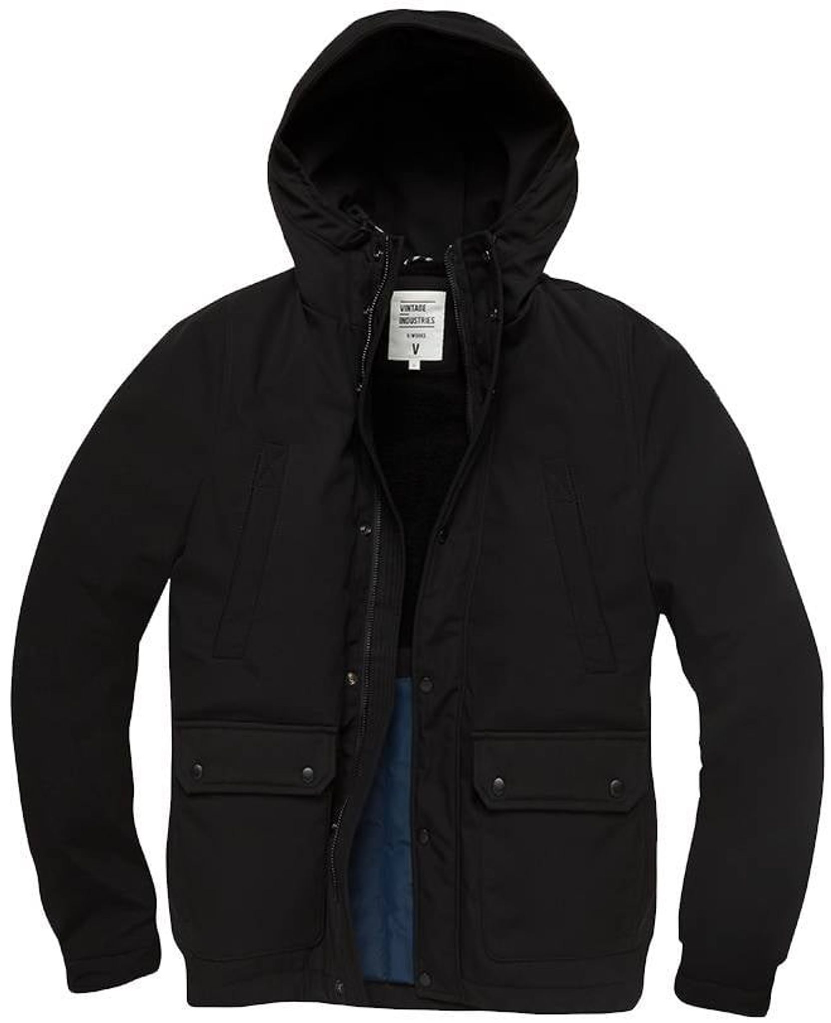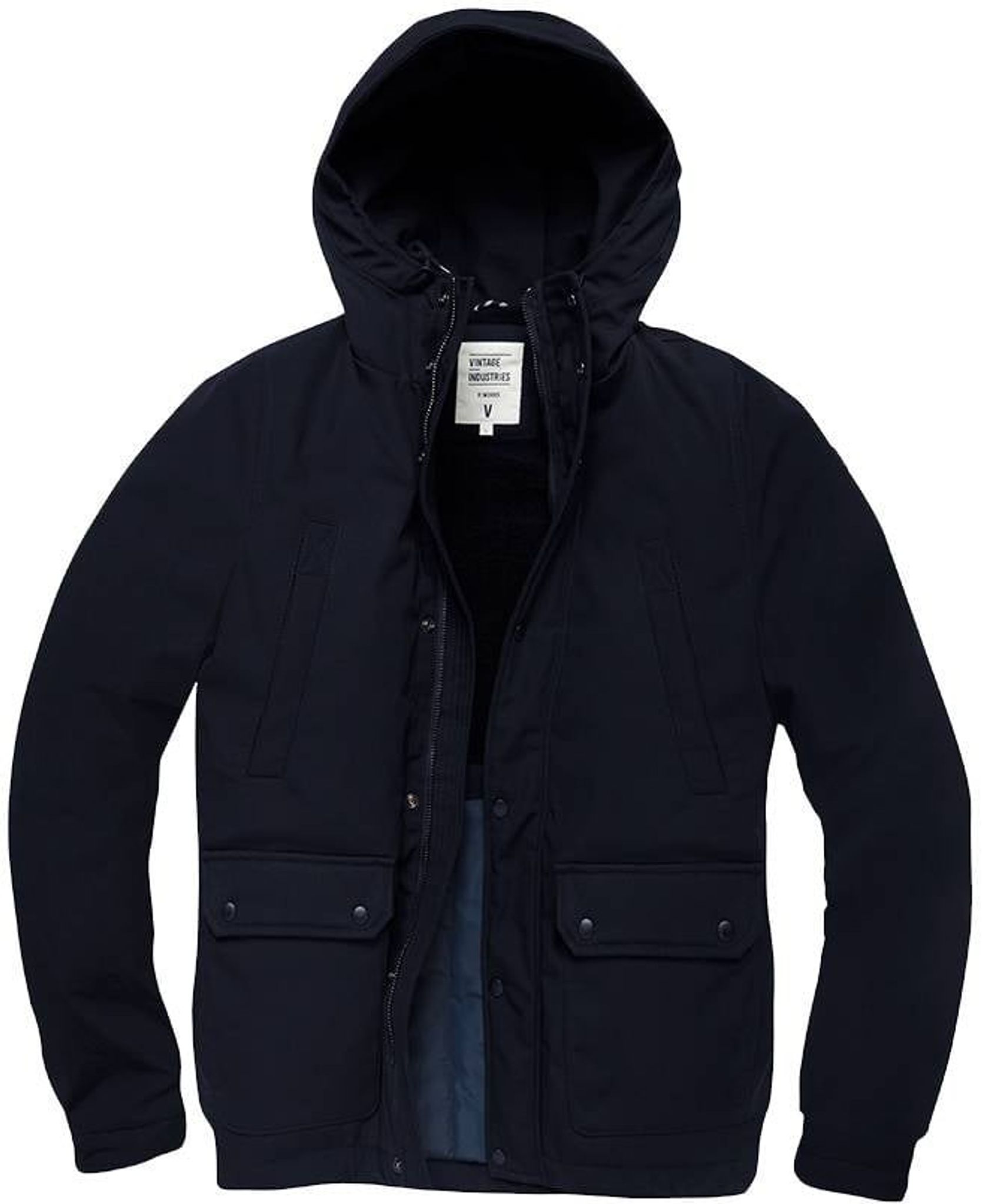 En välsydd herrjacka med huva. Jackan är klädd med pälstyg över stor del av ryggen, övrig del är polyesterfoder med stoppning.