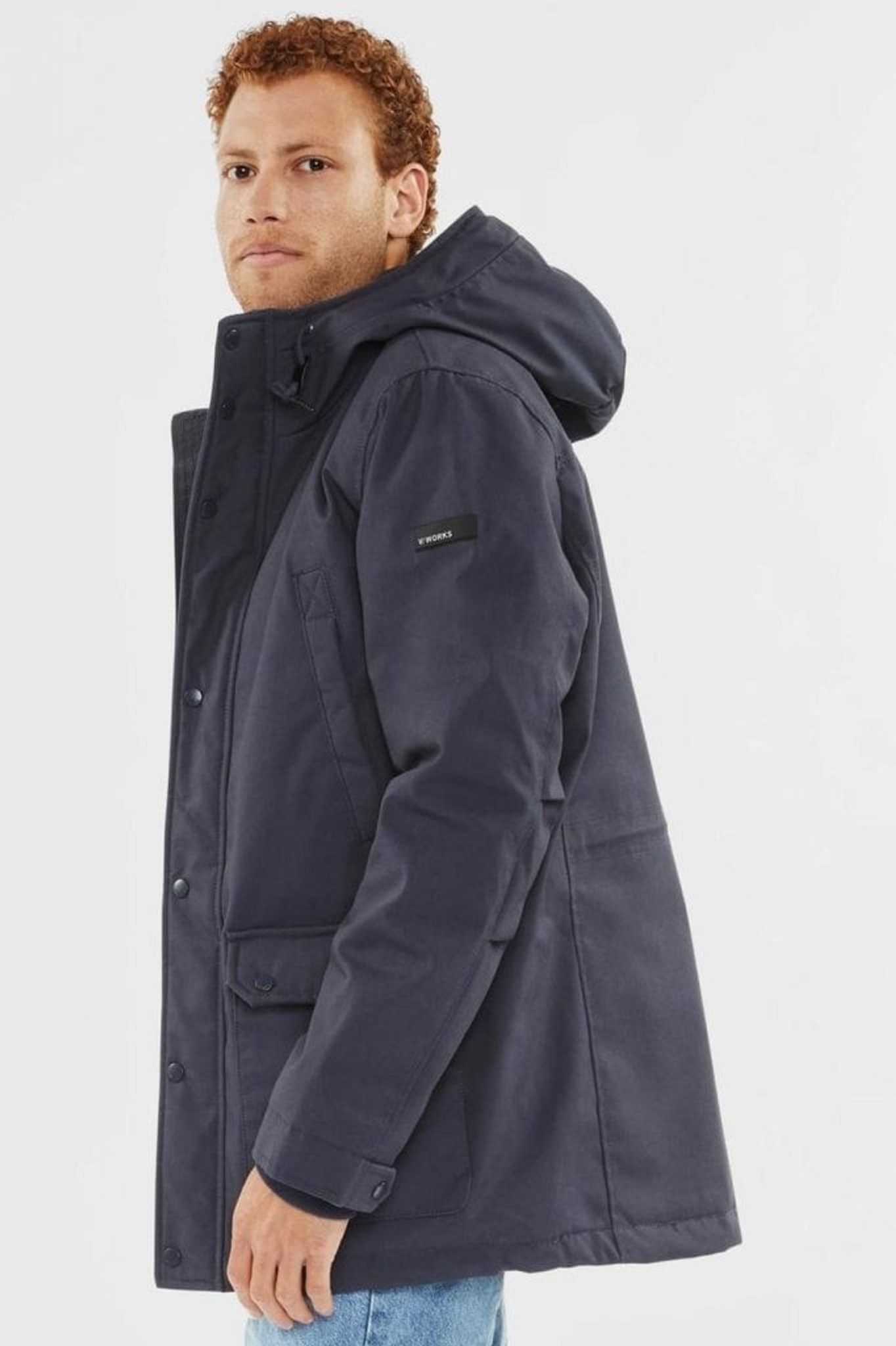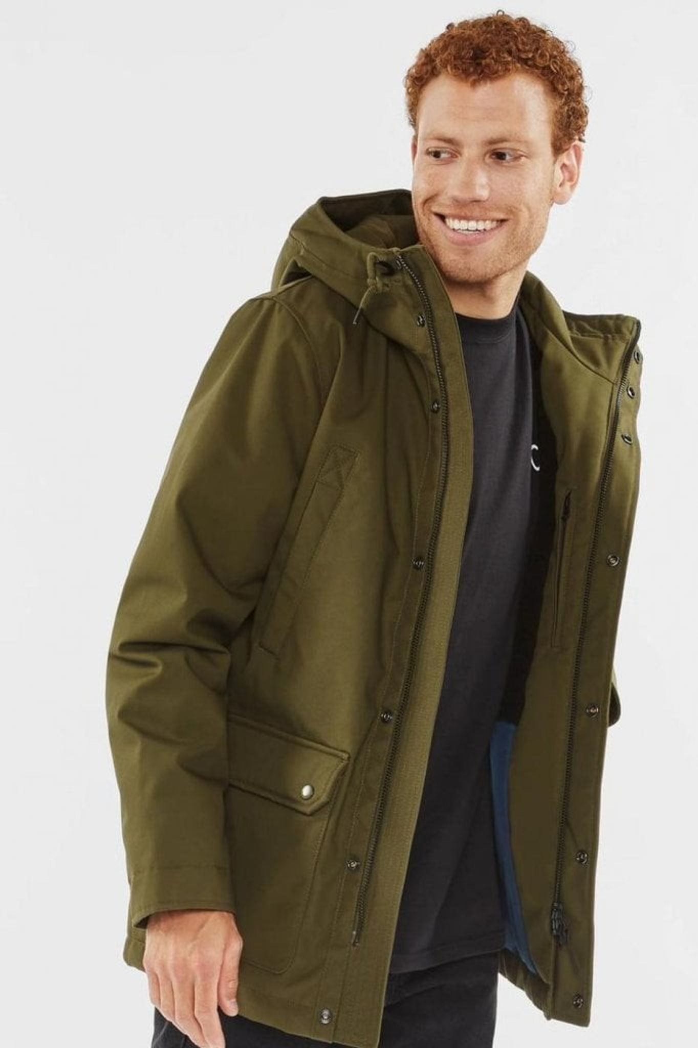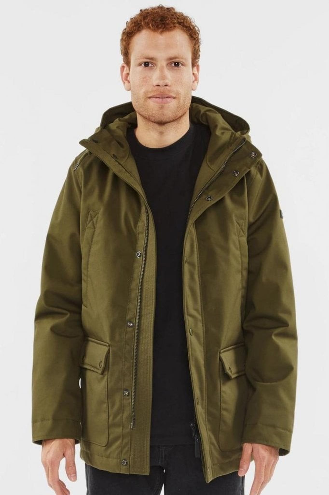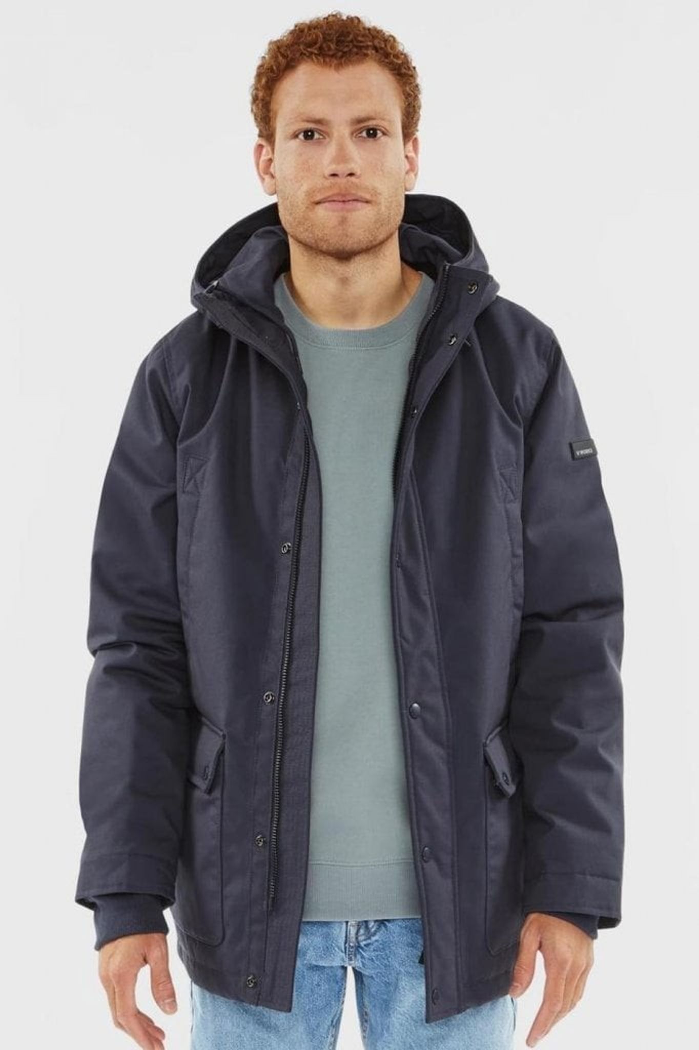 En välsydd herrjacka med huva. Jackan är klädd med pälstyg över stor del av ryggen, övrig del är polyesterfoder med stoppning.