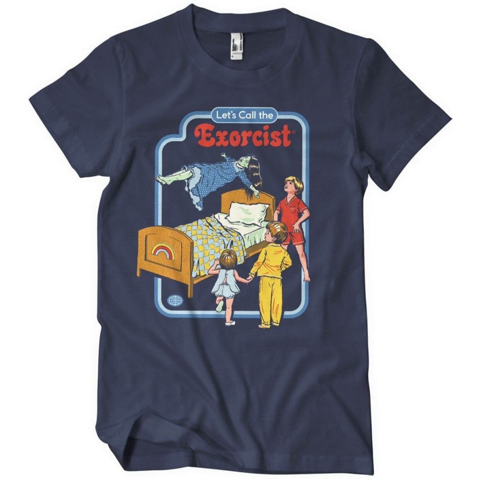 Motivet på T-shirten visar en familj som ser chockade ut när de står bredvid en säng där en figur som liknar en karaktär från en känd skräckfilm ligger utsträckt och verkar sväva ovanför sängen i en övernaturlig position. Texten över bilden säger "Let's Call the Exorcist", en uppenbar referens till filmen "The Exorcist" och den typ av övernaturliga händelser som skildras i den.