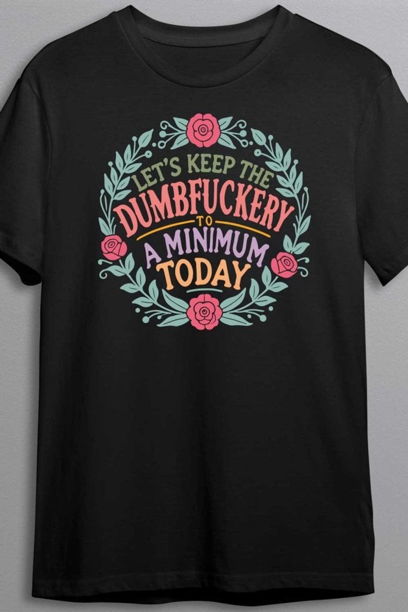Med sitt färgstarka och blomstrande tryck som säger "Let's keep the dumbfuckery to a minimum today" kombinerar den humor med stil på ett sätt som är svårt att slå. Det är en T-shirt med en attityd som både säger "Jag är chill" och "Snälla, gör inget dumt idag." Perfekt för kontoret, familjeträffen eller vilken situation som helst där lite ordning behövs.