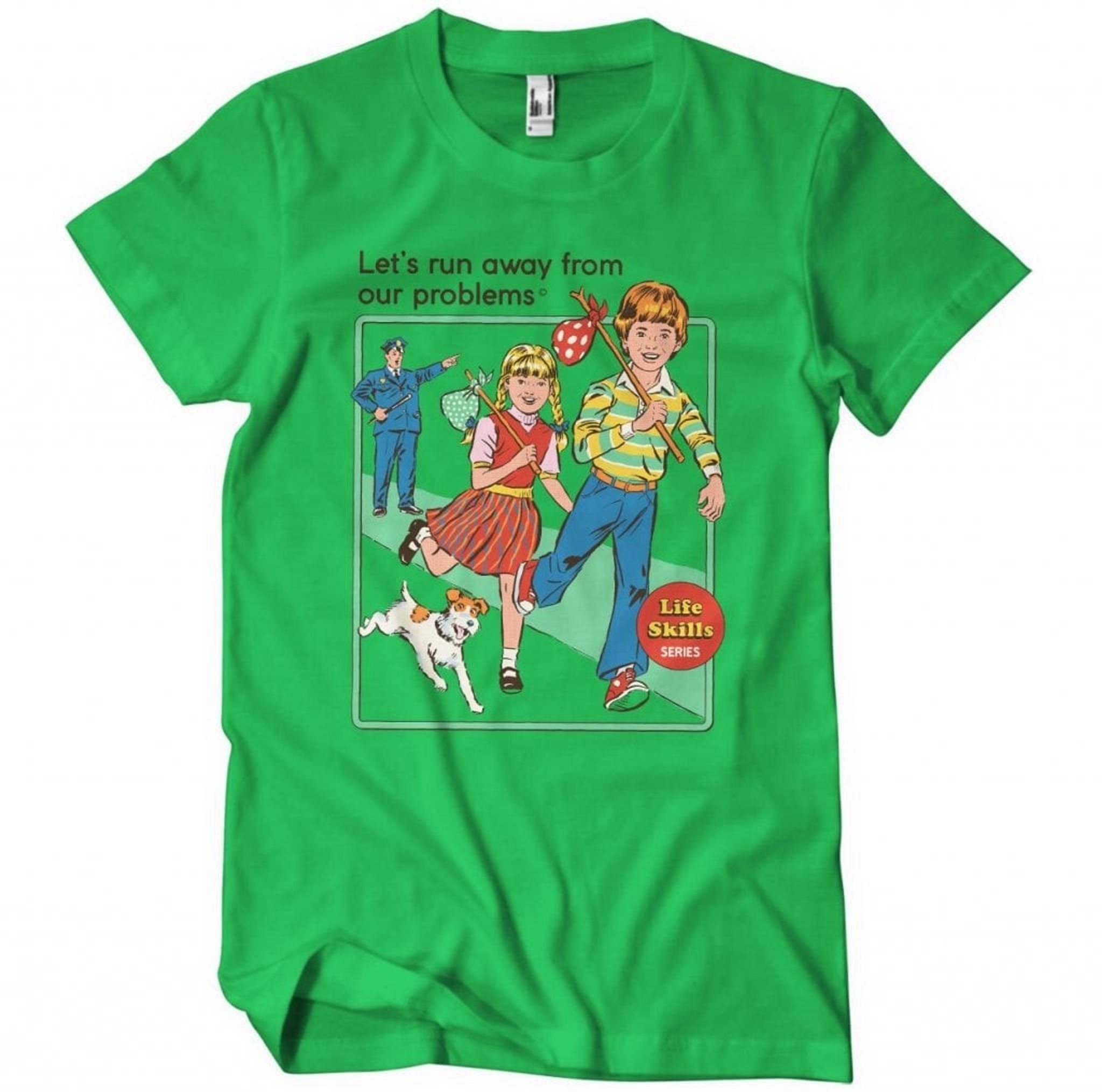 Denna t-shirt med sin lekfulla grafik visar två barn i full fart, med en karikatyr av en polis i hälarna. Motivet är en blinkning till den där barnsliga impulsen att springa så fort benen kan bära en från allt som känns jobbigt. "Let's run away from our problems" står det skrivet, som ett skämtsamt råd vi alla önskat följa någon gång.