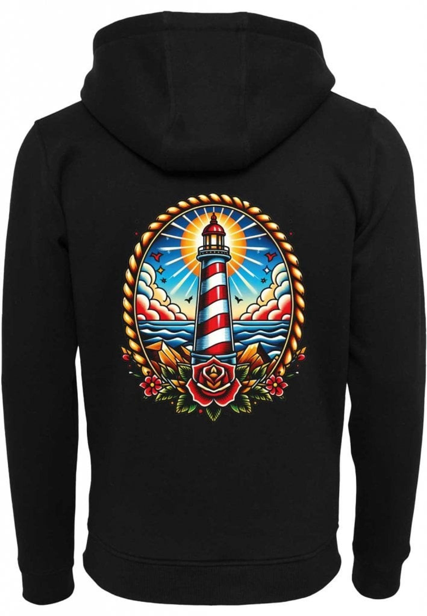 Denna hoodie kombinerar klassisk nautisk estetik med tidlös komfort. På baksidan pryds plagget av ett detaljrikt motiv föreställande en fyr som reser sig ståtligt mot en soluppgång, inramad av rep och blommor som för tankarna till traditionella old school-tatueringar.