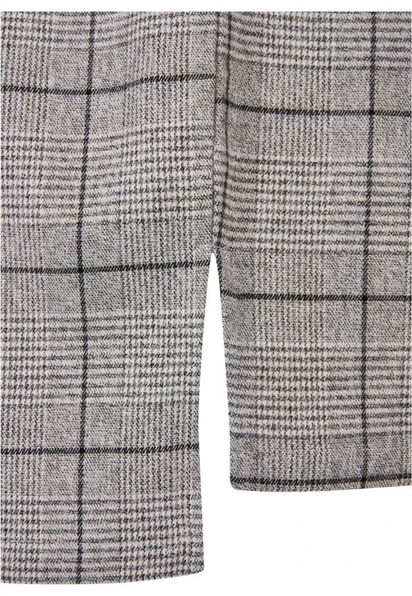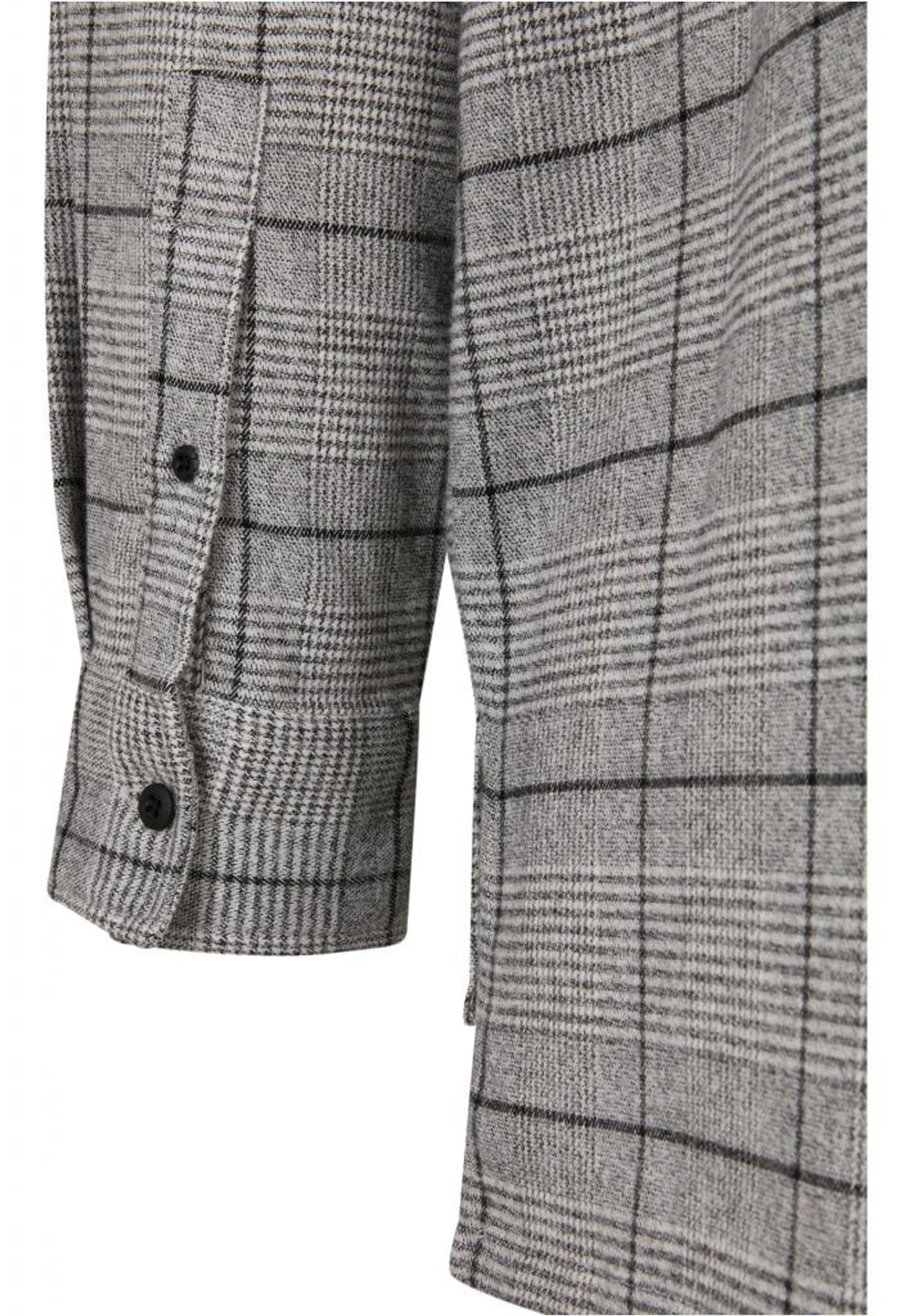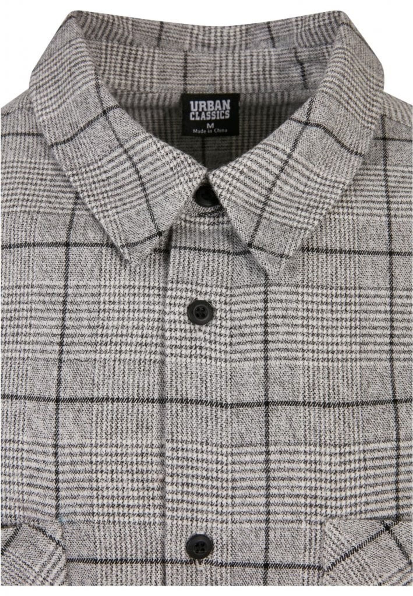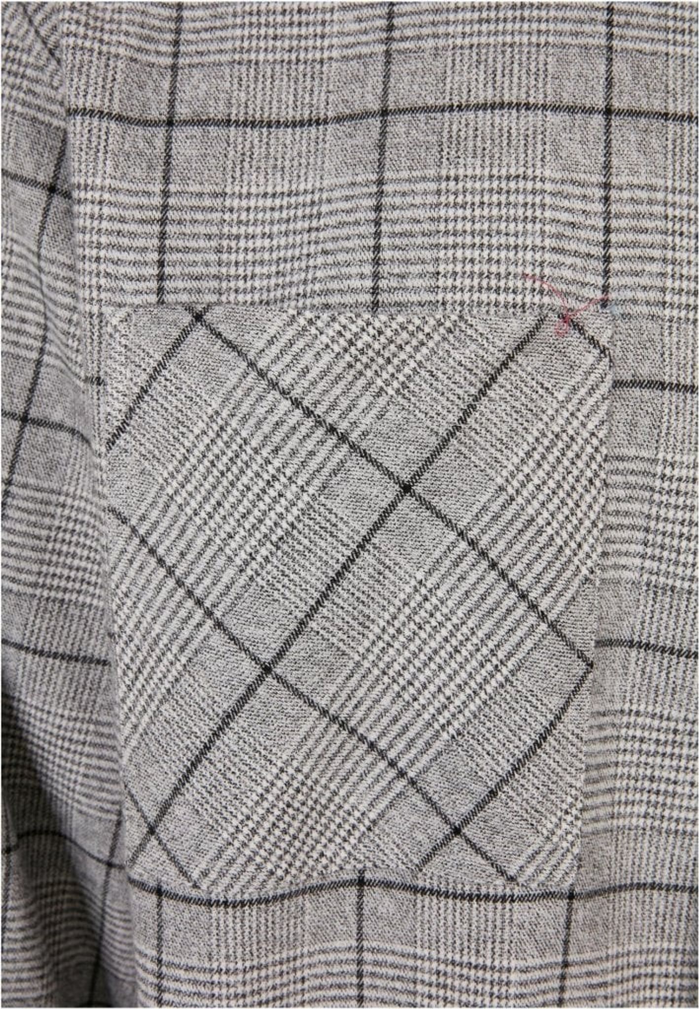 Skjortans tyg är fyllt av rutmönster i grått och svart.