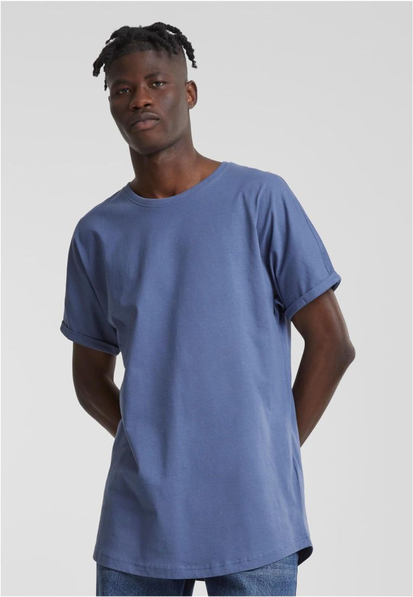Upplev den perfekta kombinationen av stil och komfort med vår Long Shaped Turnup Tee i en elegant vintageblå färg. Tillverkad av 100% bomull i single jersey med en vikt på 200 gsm, erbjuder denna t-shirt en mjuk och slitstark struktur.