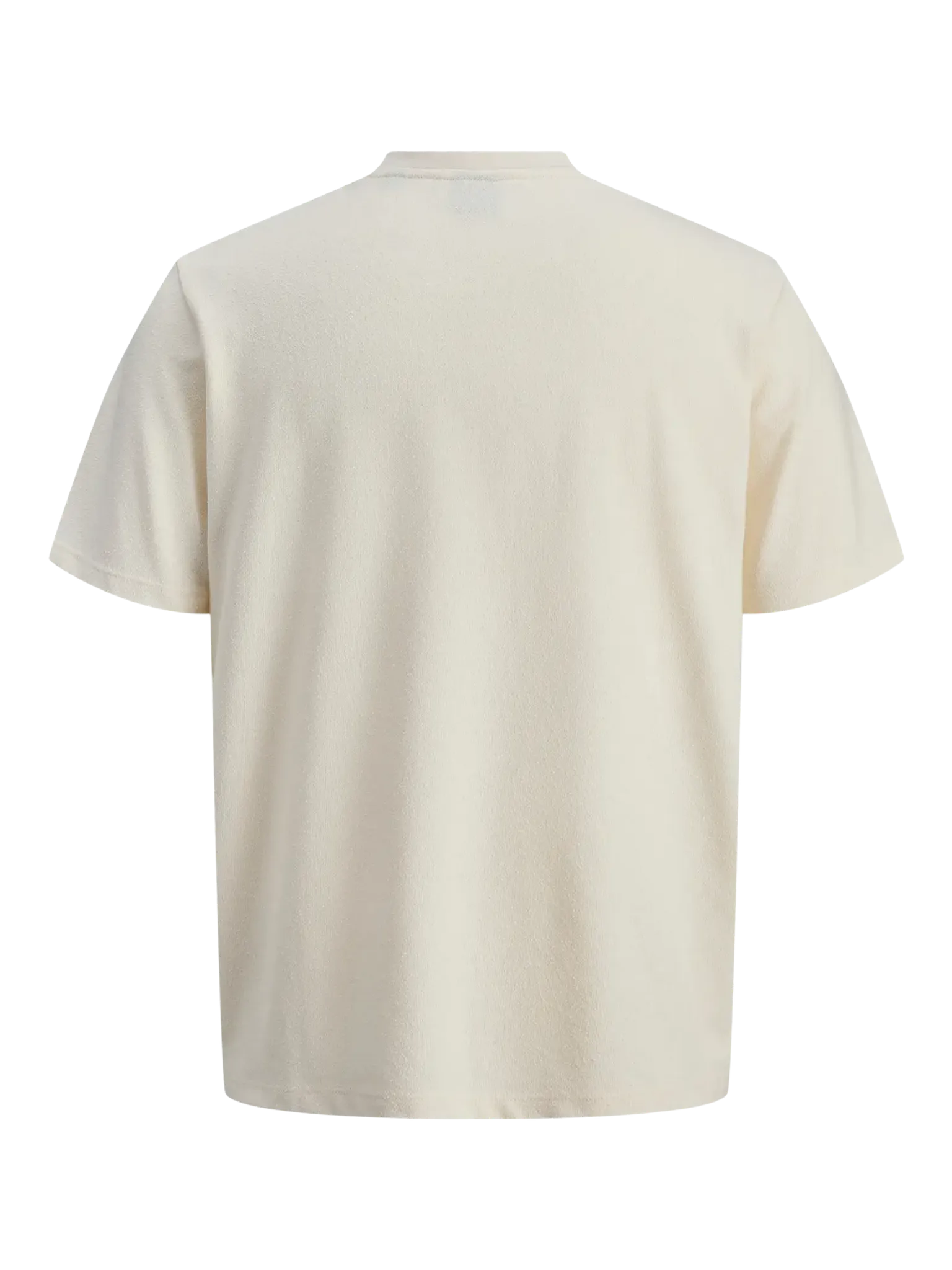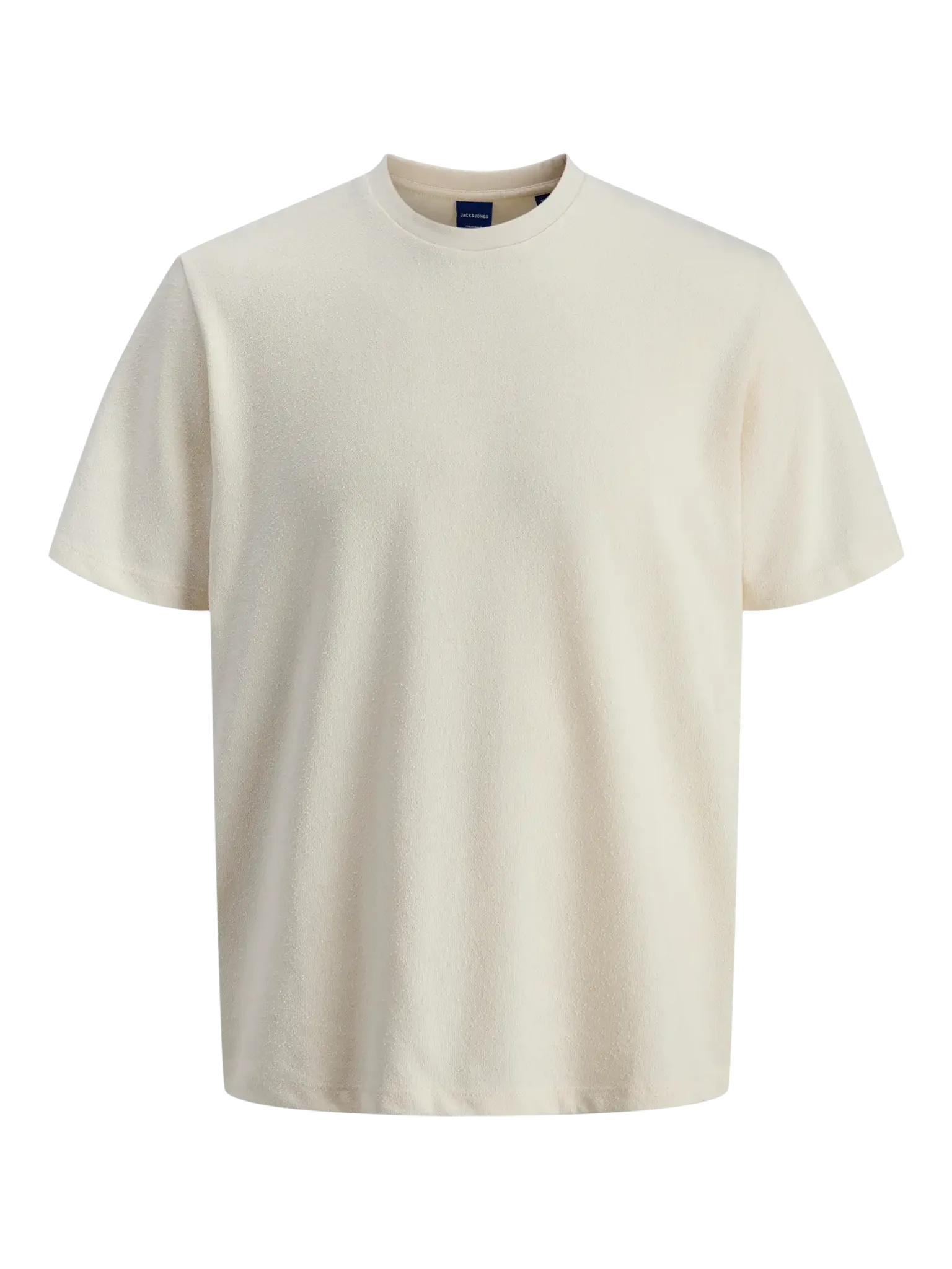 T-shirten har en lös passform som hänger fritt från kroppen utan att strama åt, vilket ger ett avslappnat uttryck och en svalkande effekt under varma dagar. Kragen är rundad (crew neck) och sitter mjukt mot halsen, medan de korta ärmarna faller naturligt mot överarmarna.