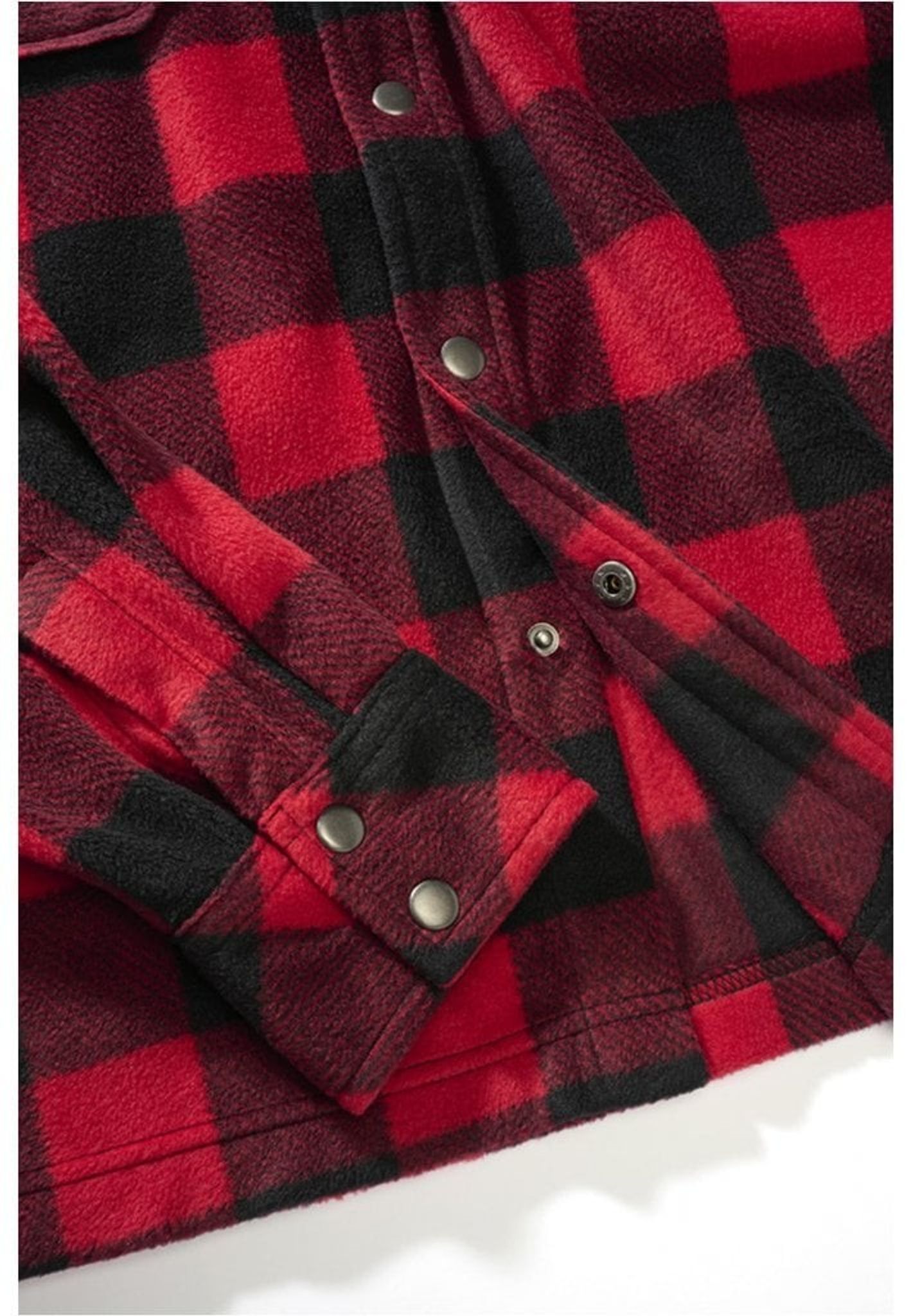 På skjortjackan finns två stora bröstfickor med lock. Skjortjackans tyg har stora rutor, som hämtade från den klassiska flanellskjortan.
