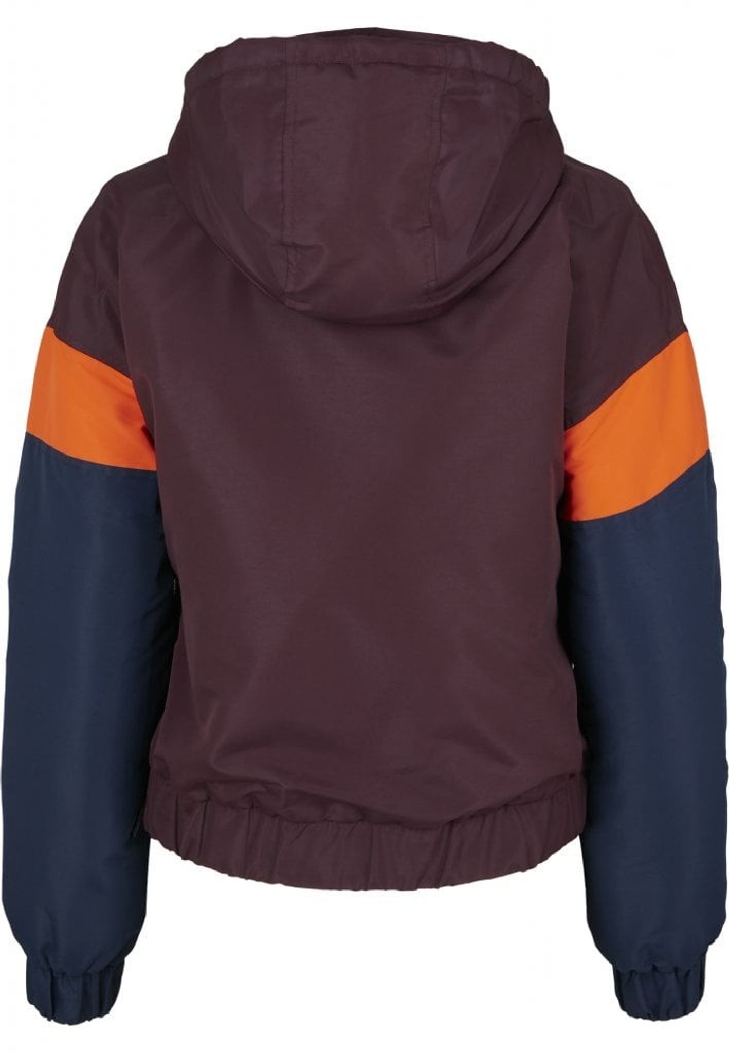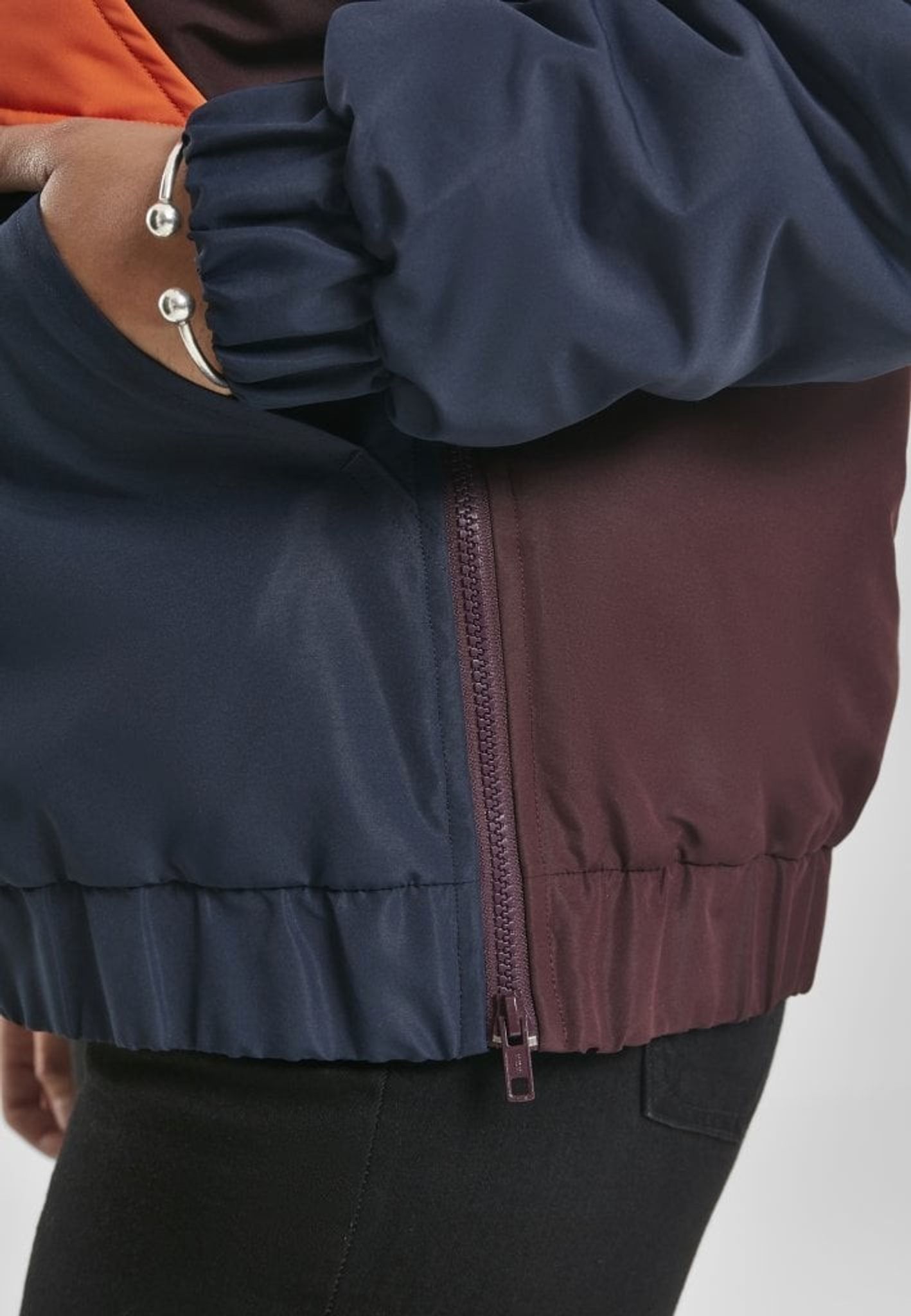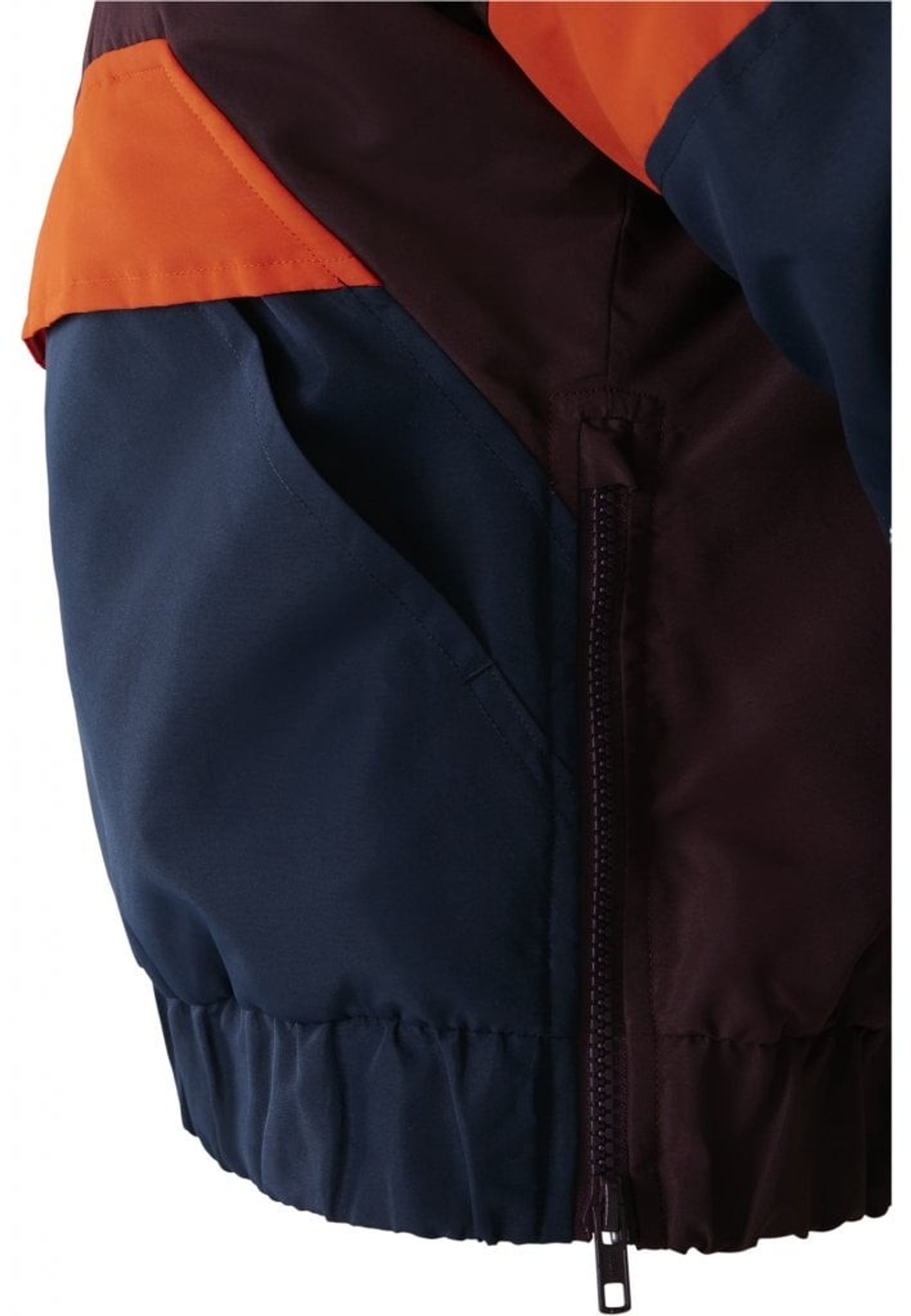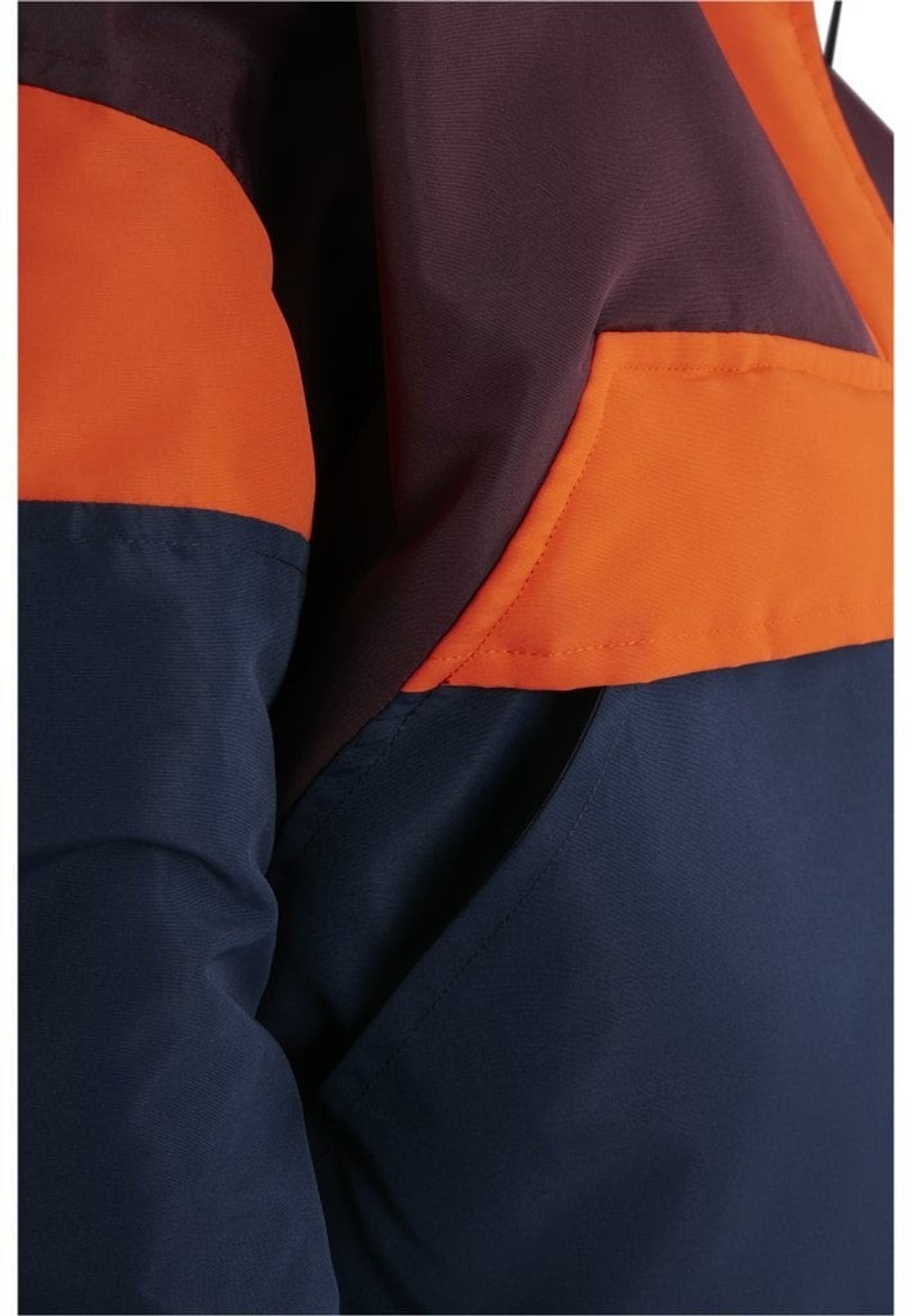 - Mönster: färgerna bildar ett mönster på jackan. Ovandelen av jackan är vinröd och nederdelen är blå och mitt på är det oranga breda ränder