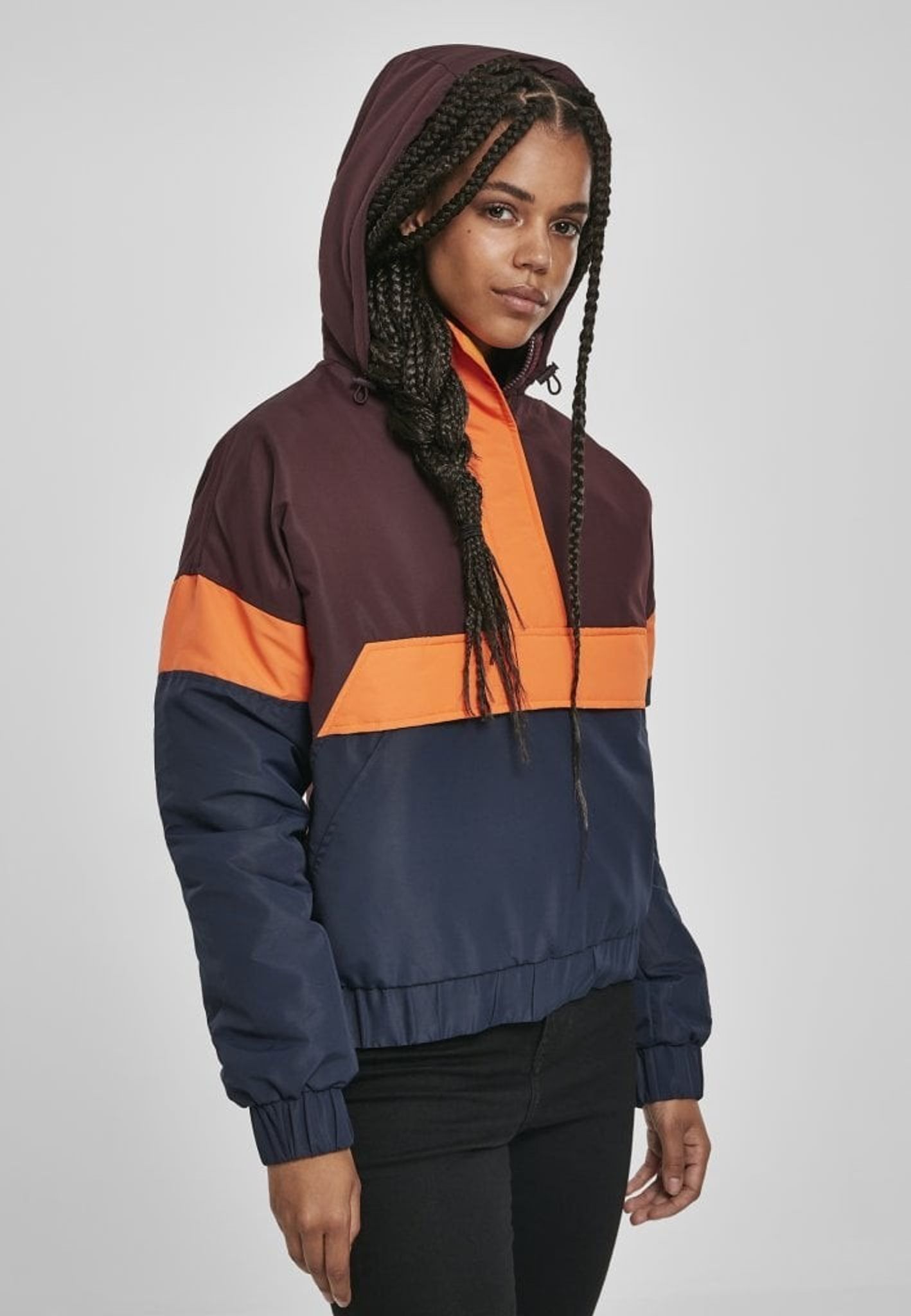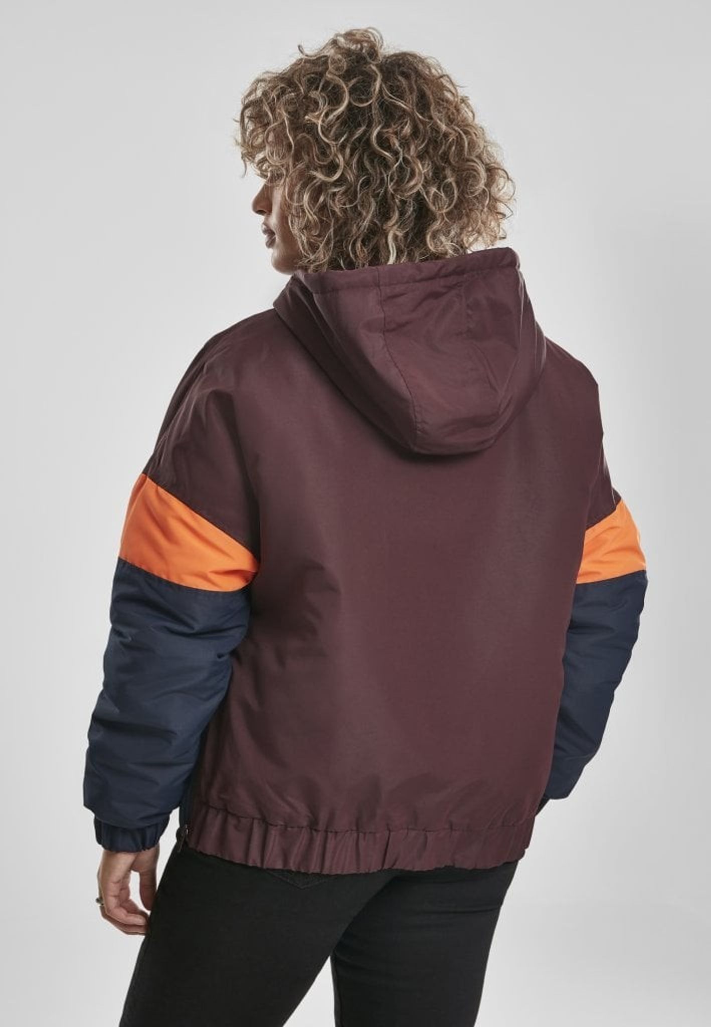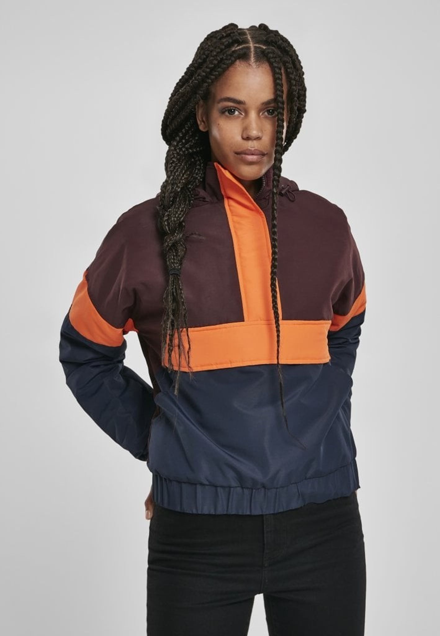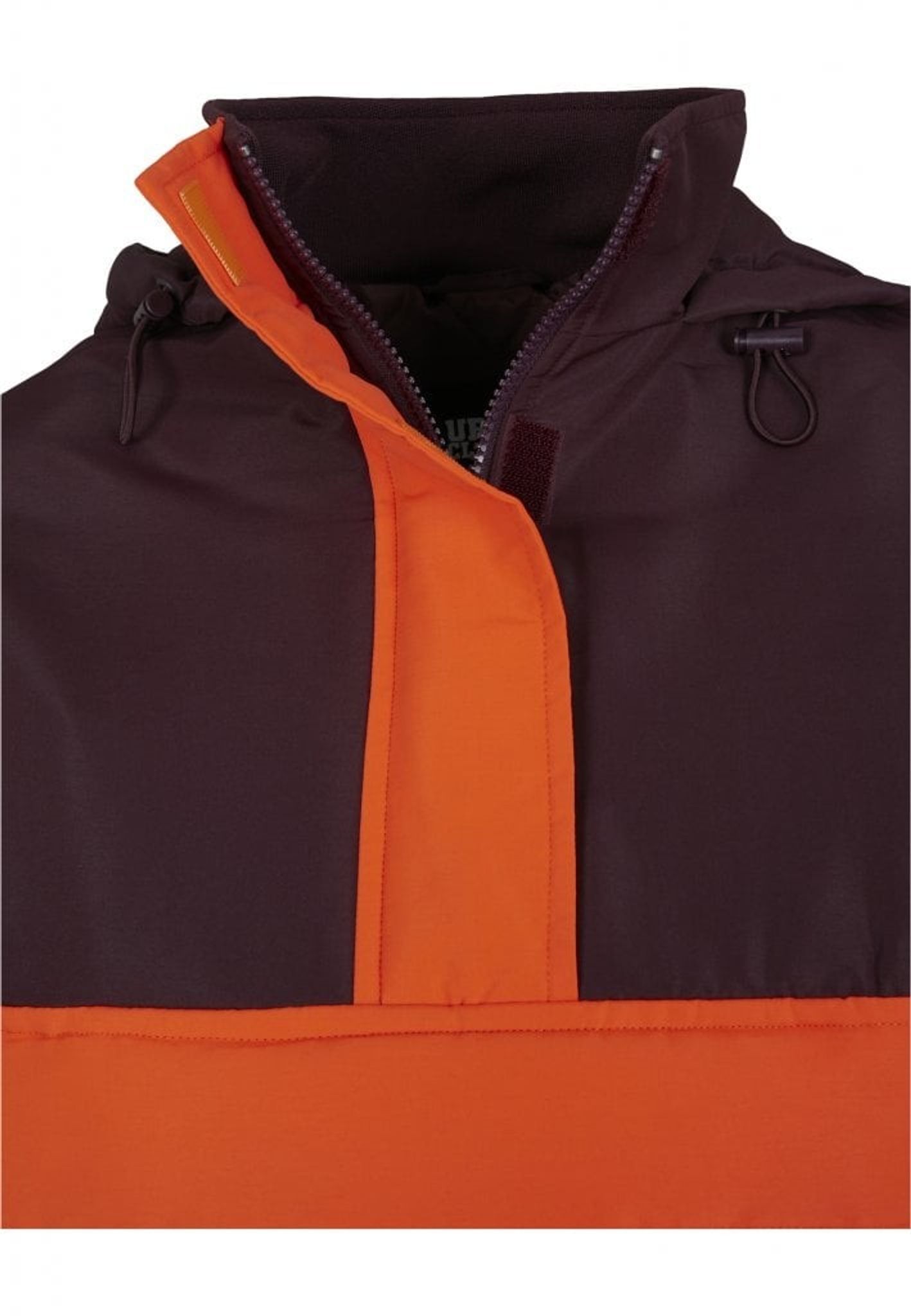 - Mönster: färgerna bildar ett mönster på jackan. Ovandelen av jackan är vinröd och nederdelen är blå och mitt på är det oranga breda ränder
