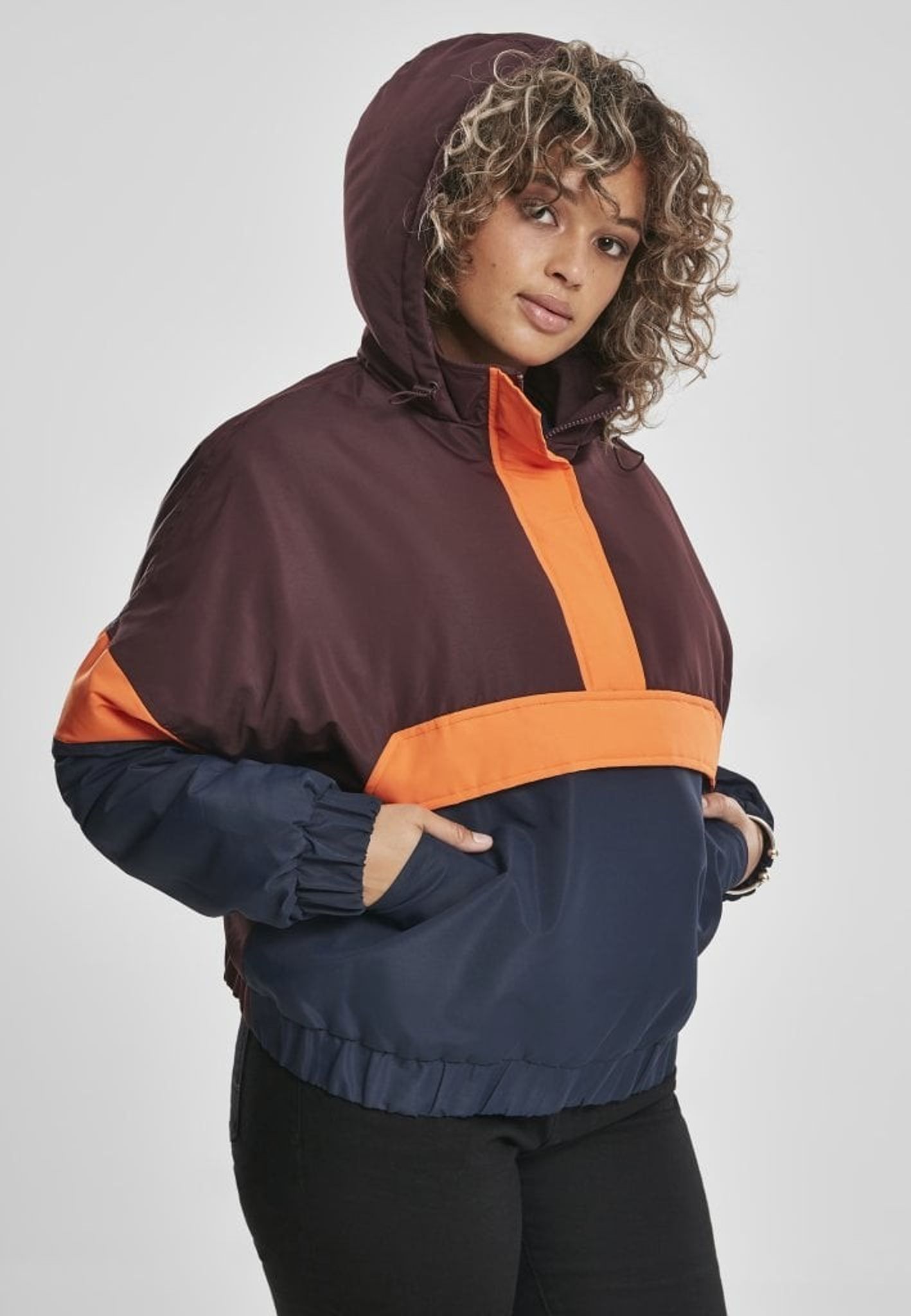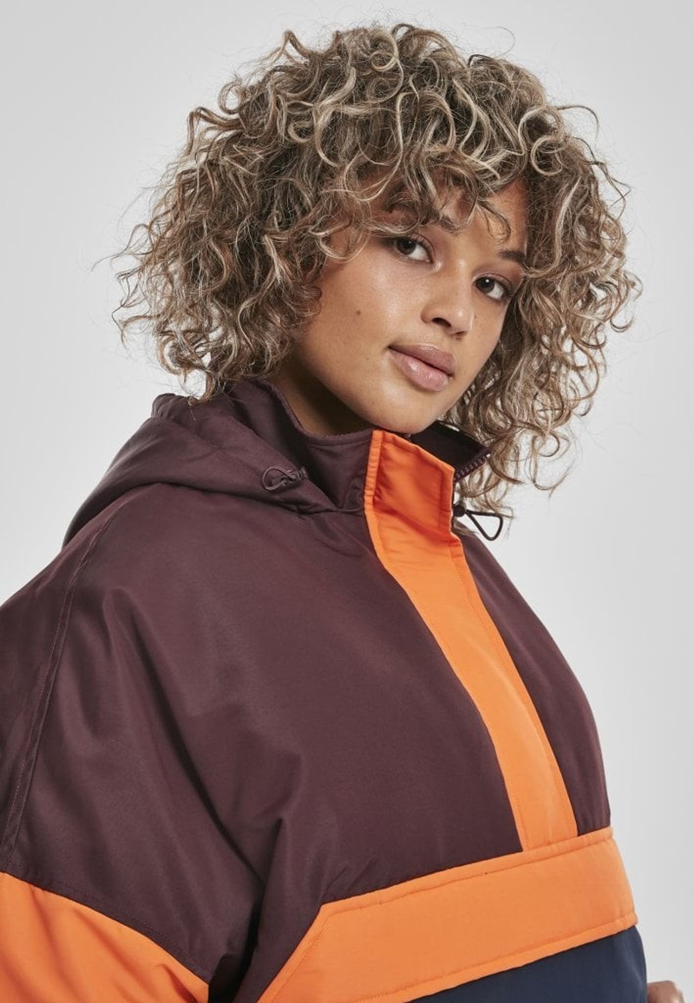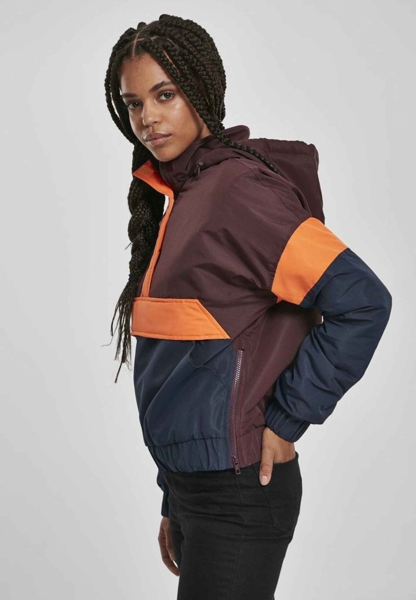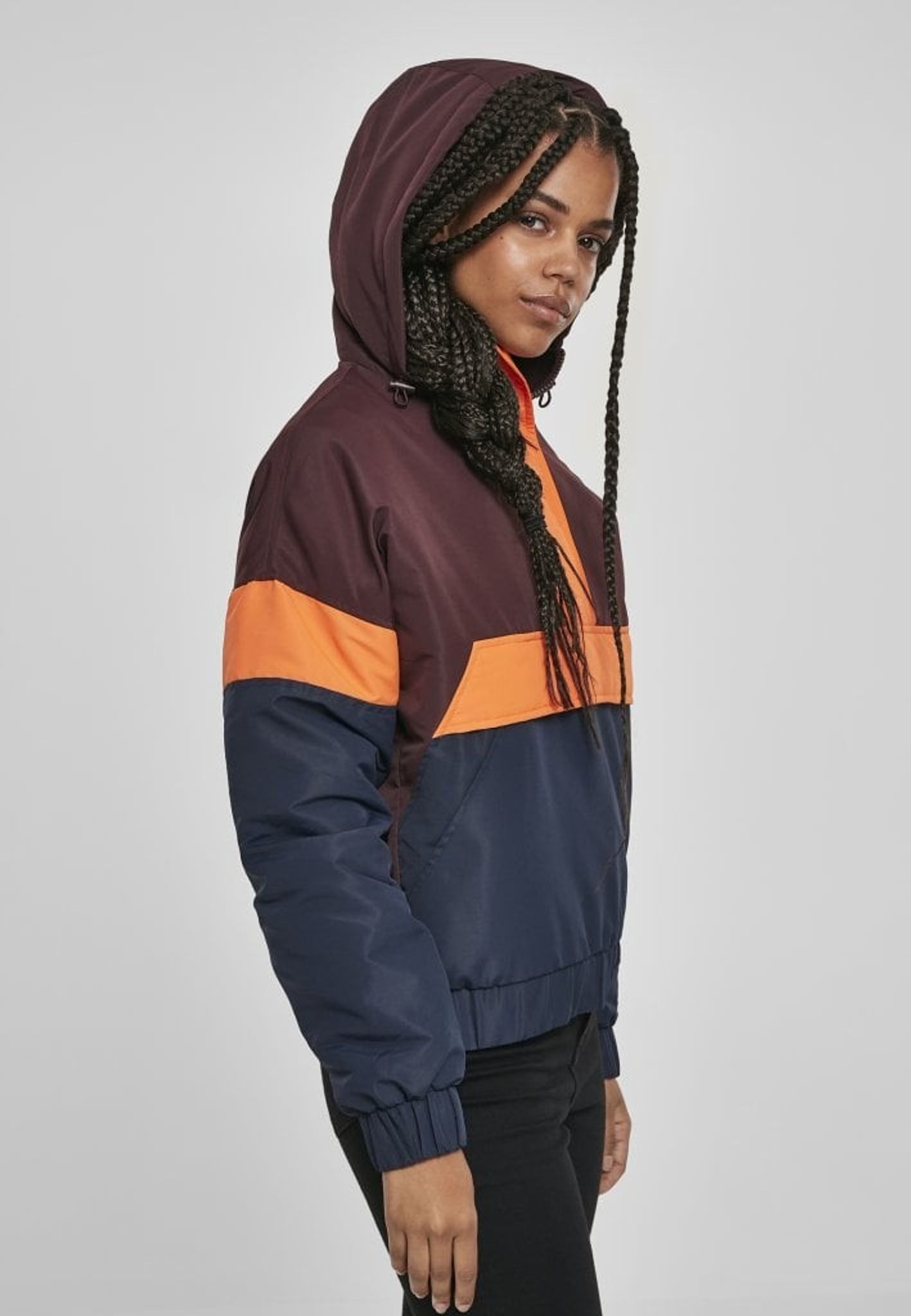 - Mönster: färgerna bildar ett mönster på jackan. Ovandelen av jackan är vinröd och nederdelen är blå och mitt på är det oranga breda ränder