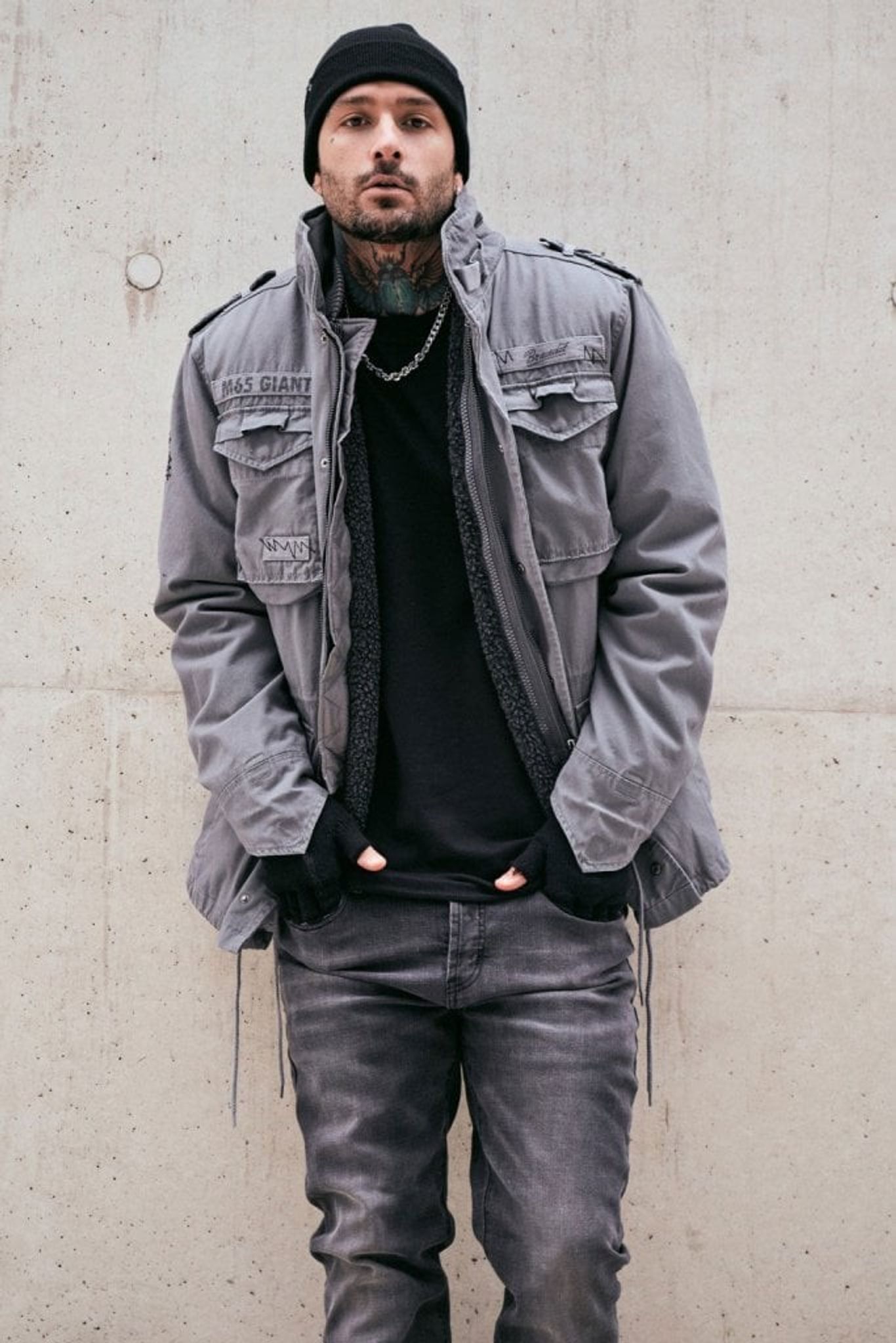 På jackans tyg finns dessutom två fastsydda patches där det på höger bröst står "M65 Giant" och på vänster bröst syns märket Brandits logotyp.