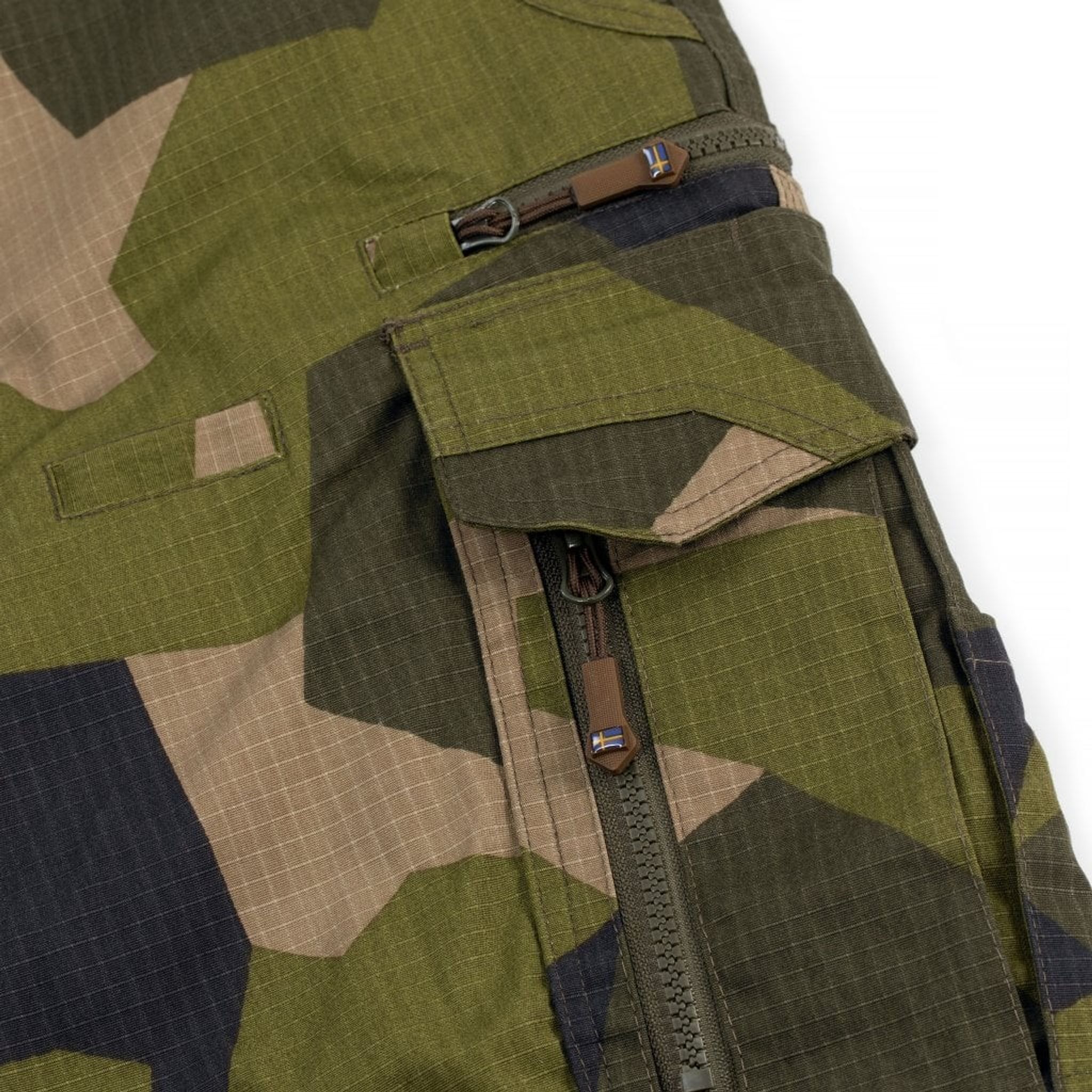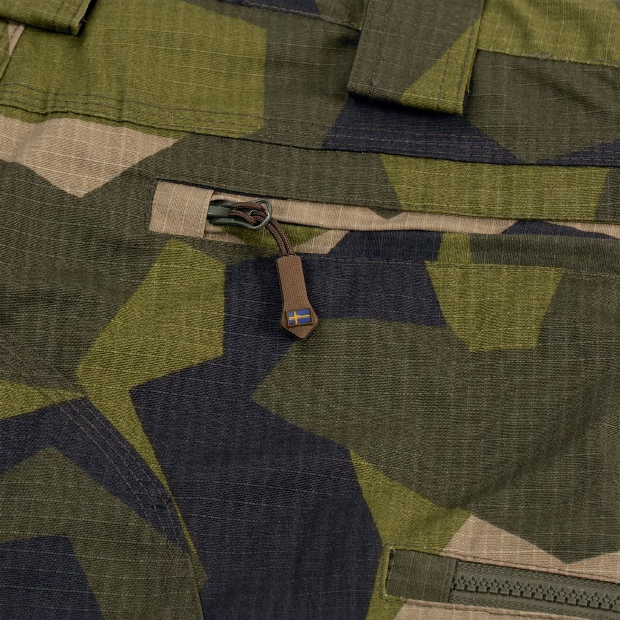 En kanske inte så funktionell men ock så snygg detalj är att löparna på dragkedjorna är smyckade med den svenska flaggan. Mer passande löpare går inte att hitta till dessa fältbyxor i svenska M90-kamouflaget.