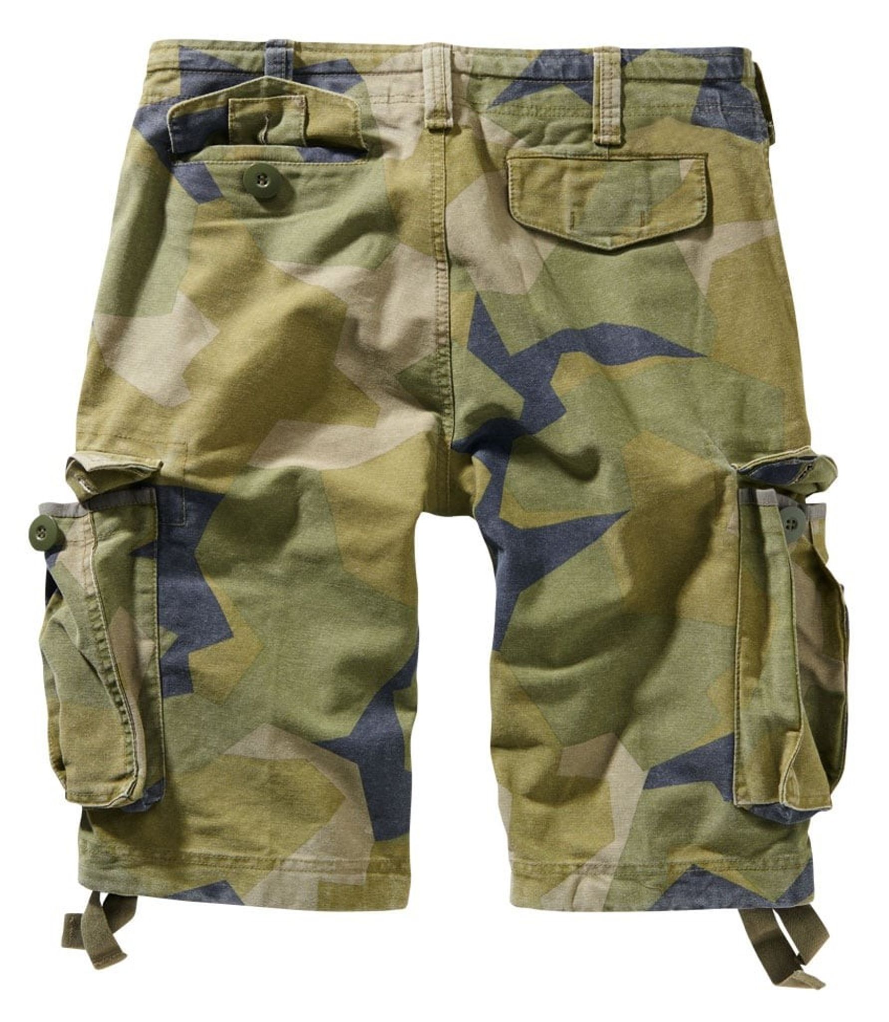 Cargo shorts i M90-camo och tjockt tvättat bomullstyg. Shortsen har två stora rymliga benfickor, två sidofickor samt två bakfickor.