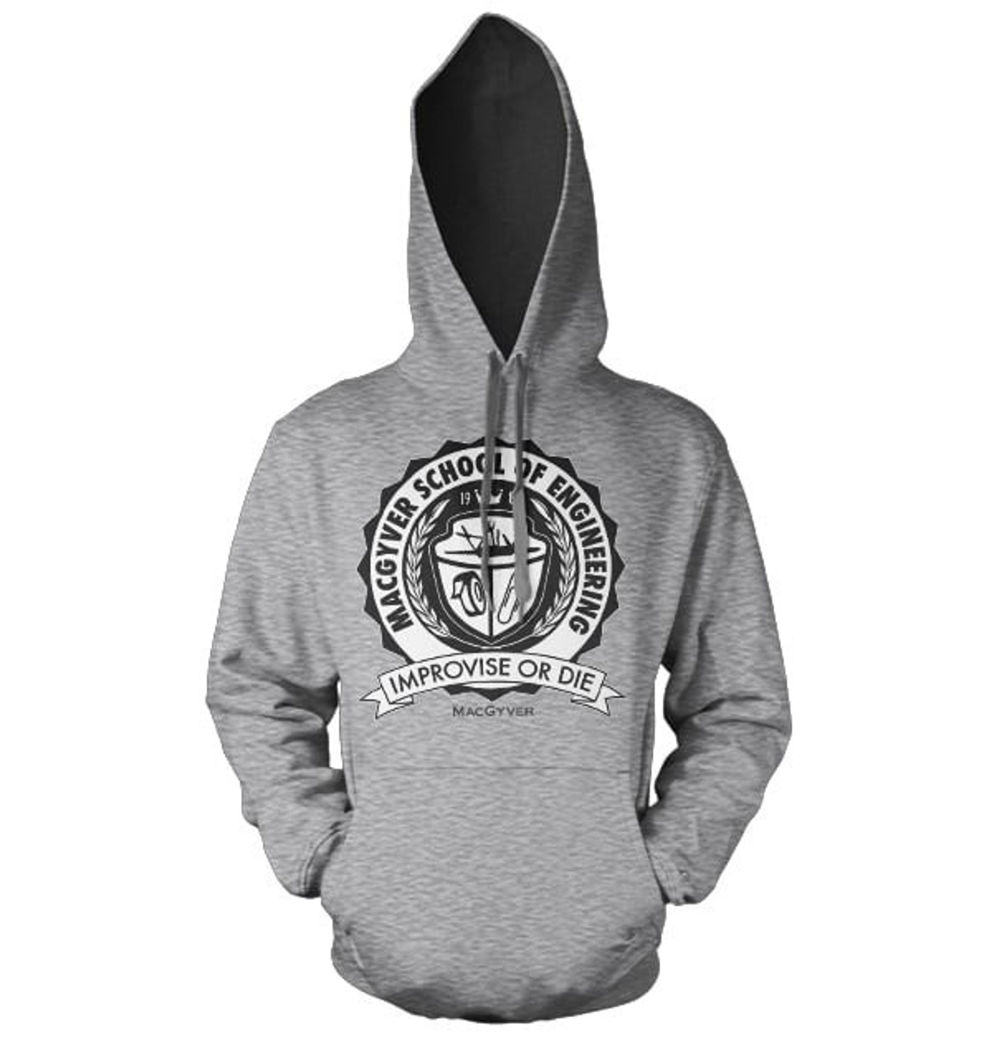 Den här hoodien för herrar är det perfekta plagget för alla MacGyver-fans där ute! Med motivet "MacGyver School of Engineering" tar den en lekfull twist på den klassiska TV-serien. Skölden på plagget är uppdelad i tre sektioner, var och en med en ikon som representerar MacGyvers färdigheter: överlevnadsspetsen, skiftnyckeln och pennan. Ett riktigt kreativt och praktiskt ingenjörskunnande!