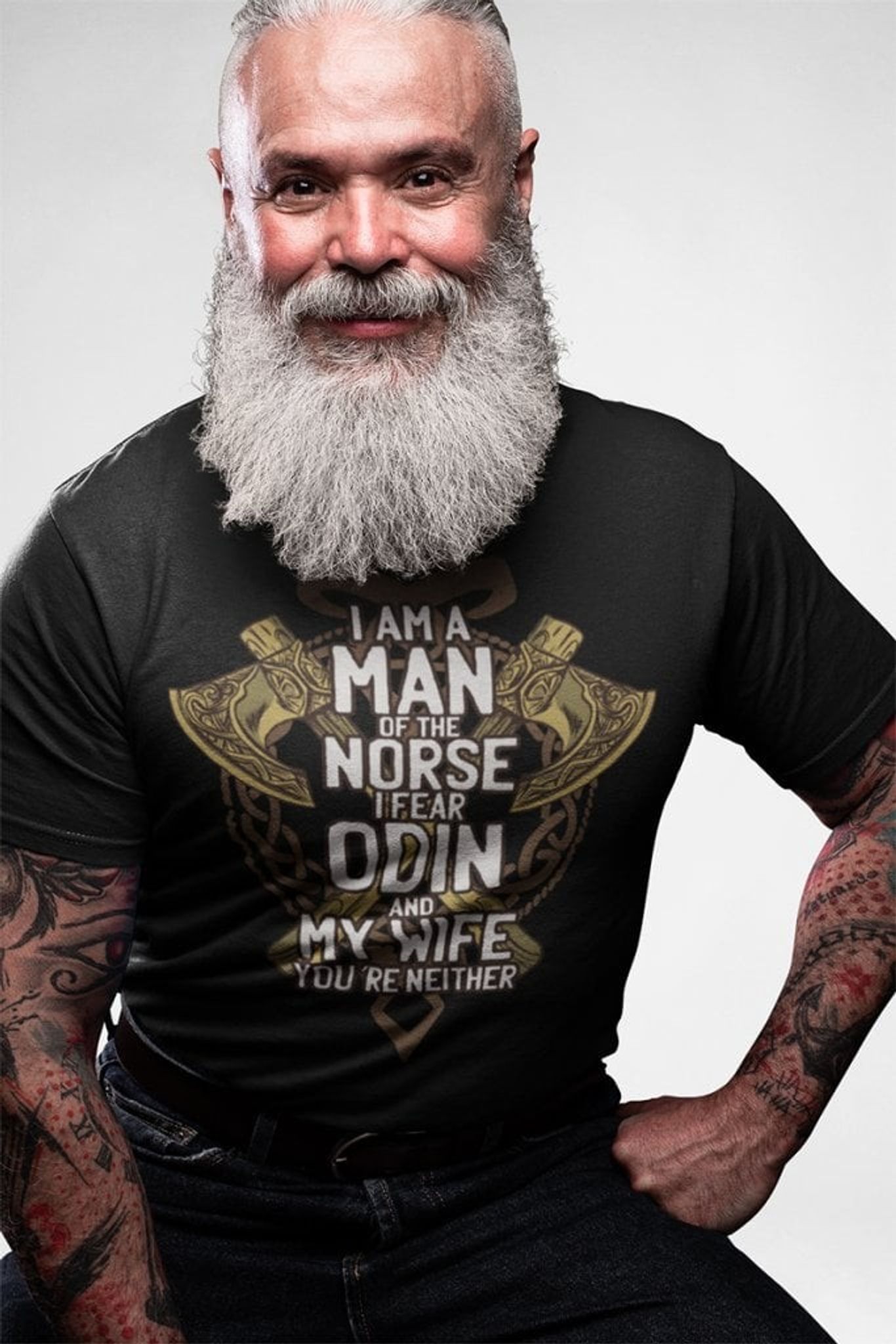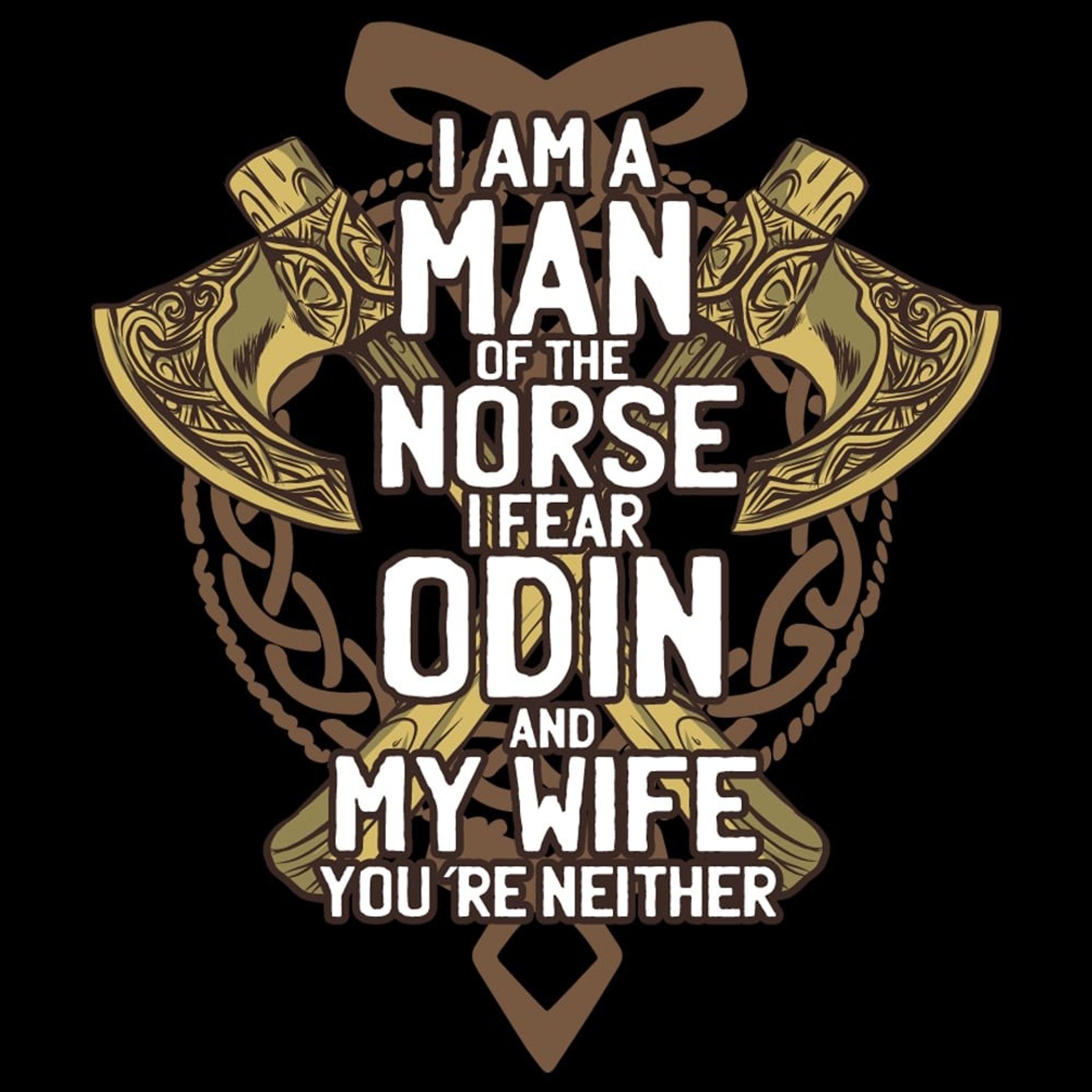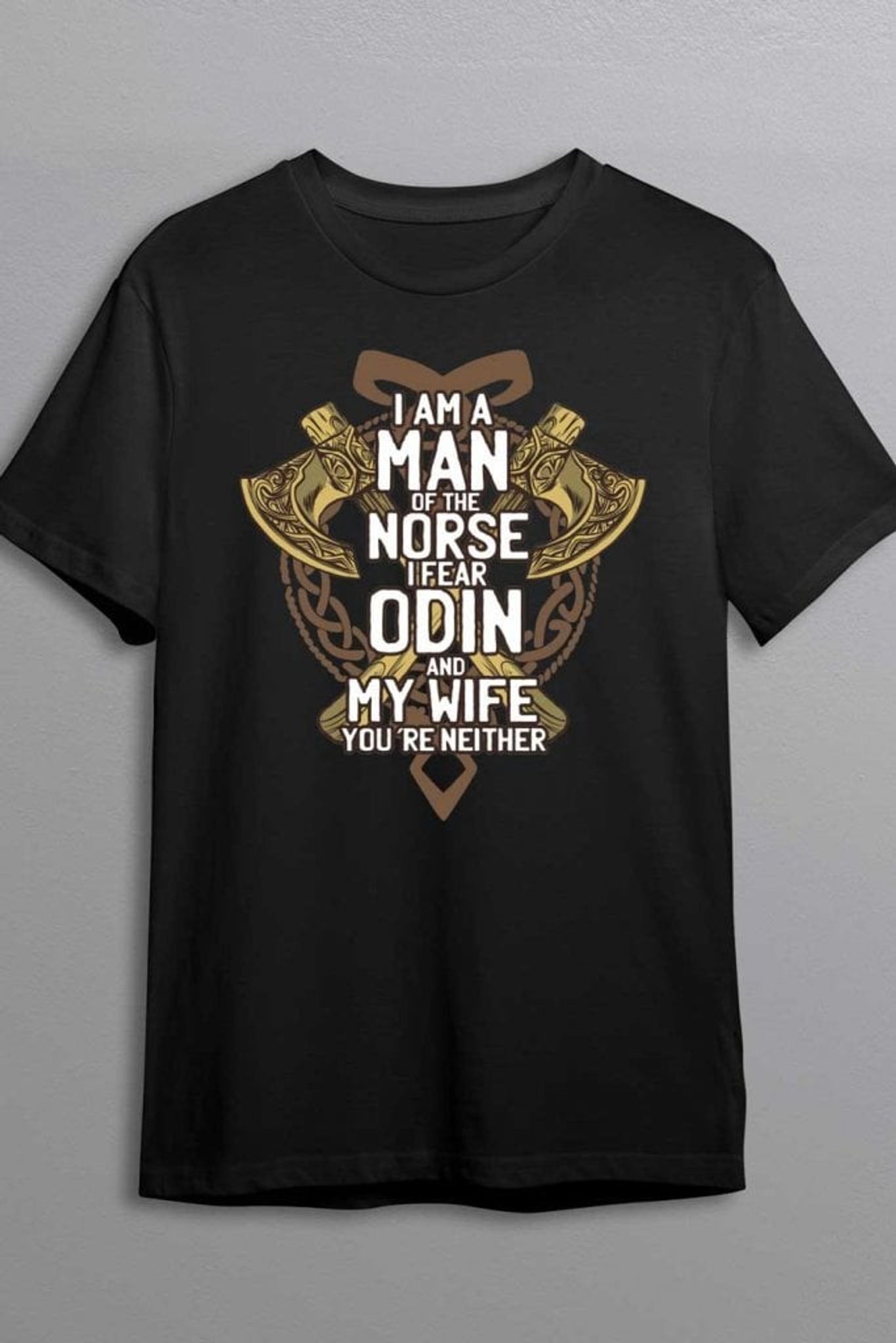 Denna T-shirt är för den stoltaste av vikingasjälarna som inte bara hyser respekt för de gamla gudarna utan också för sin partner. Det är en humoristisk hyllning till starka partnerskap och ännu starkare karaktärer, perfekt för den som gärna bär sin hjälteimage på bröstet, men vet vem som verkligen styr skeppet hemma.