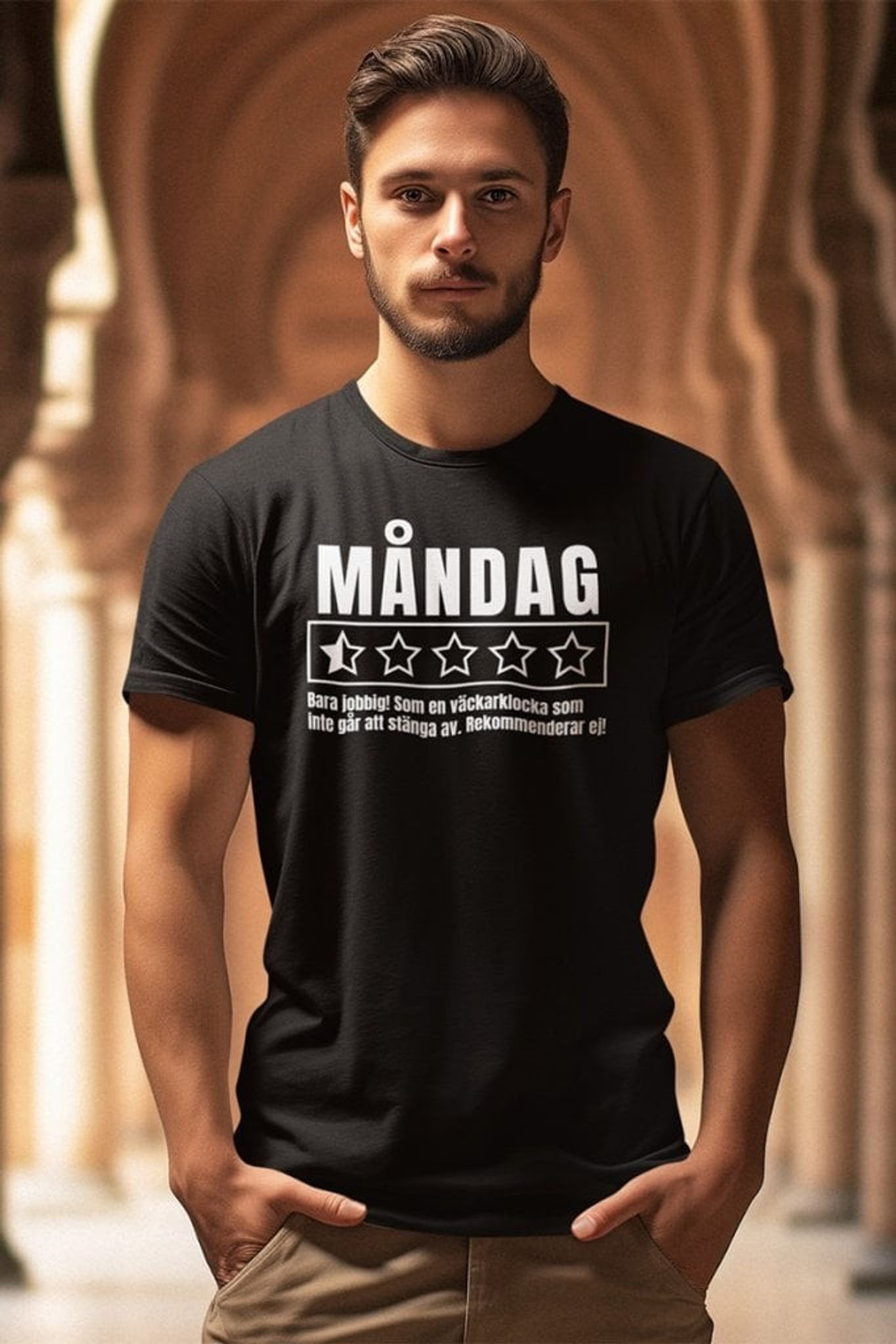 Säg hej till din nya måndagsuniform! Denna eleganta svarta t-shirt är inte bara en modesymbol utan också en uttrycksfull protest mot veckans mest ökända dag. Fronten av tröjan sportar en kaxig text: "Måndagar som en väckarklocka som inte går att stänga av", en träffsäker beskrivning som fångar måndagens outsläckliga anda på ett lekfullt sätt.