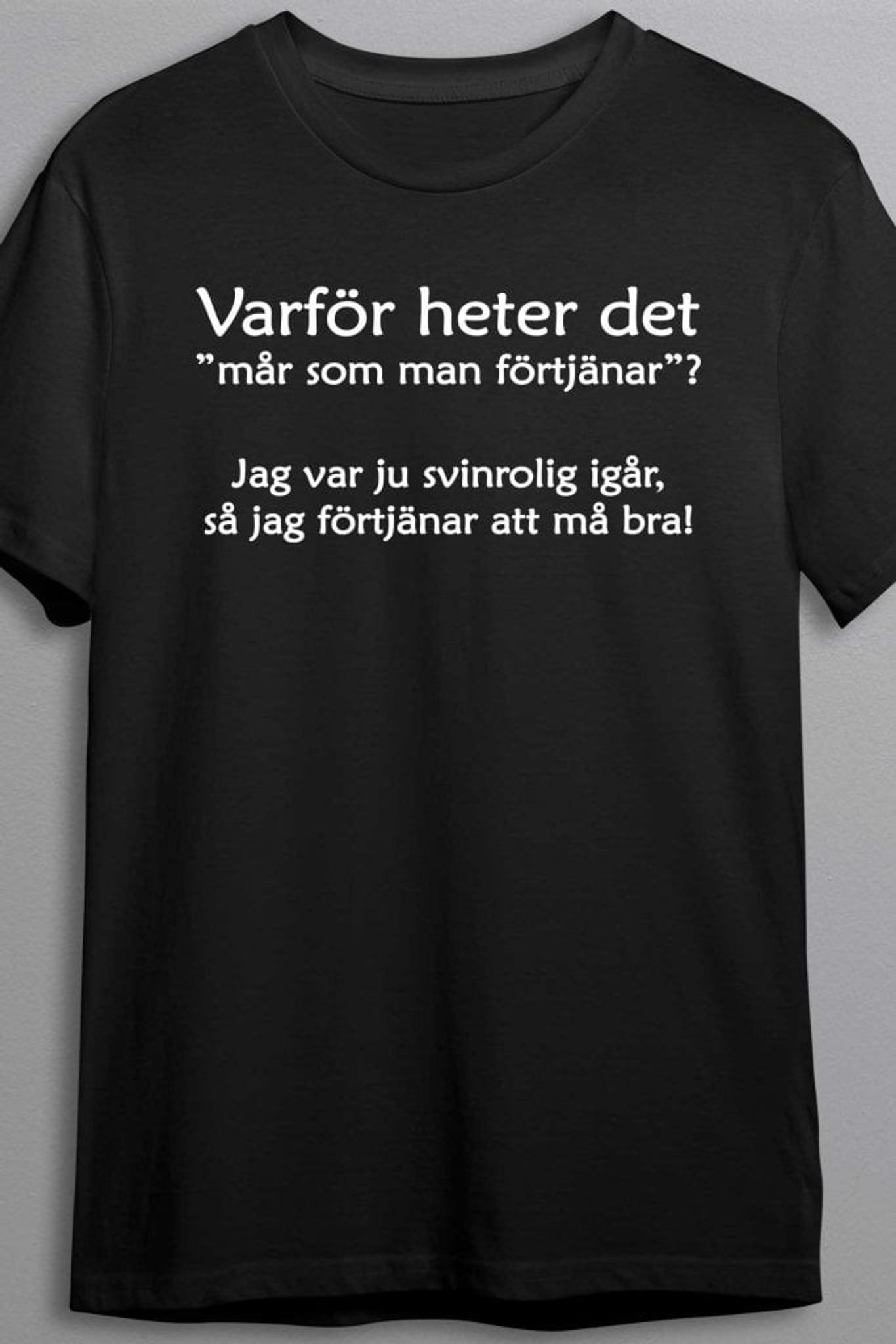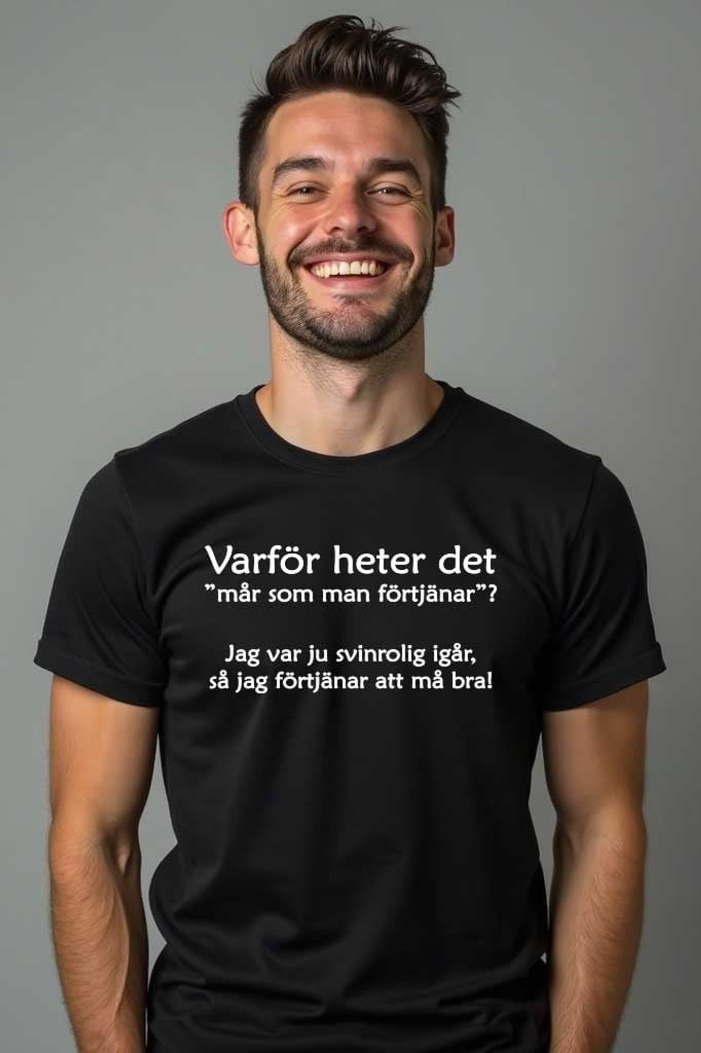 Denna svarta T-shirt är för den som vet att ett gott skratt förlänger livet och att en sund själ i en sund kropp ibland innebär att man förtjänar att må bra, även efter en mindre smickrande dag. Med texten "Varför heter det 'mår som man förtjänar'? Jag var ju svinrolig igår, så jag förtjänar att må bra!" erbjuder den en kvick och självironisk take på det klassiska ordspråket.