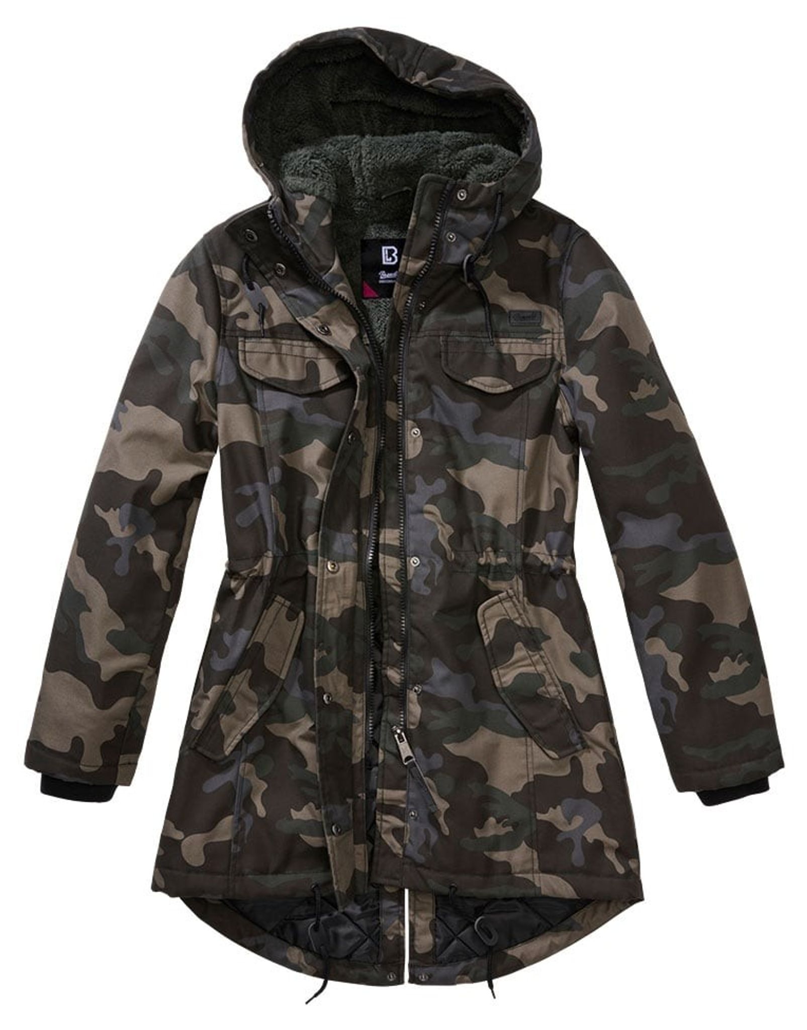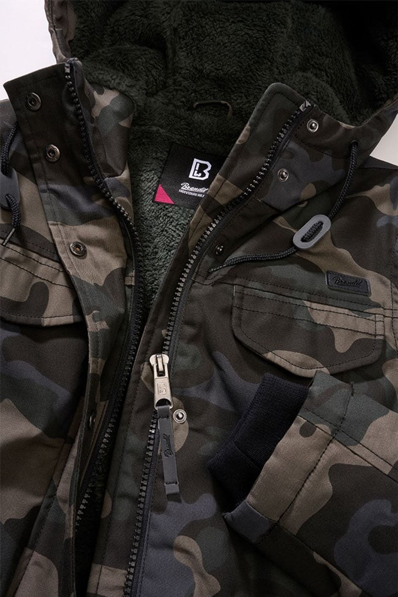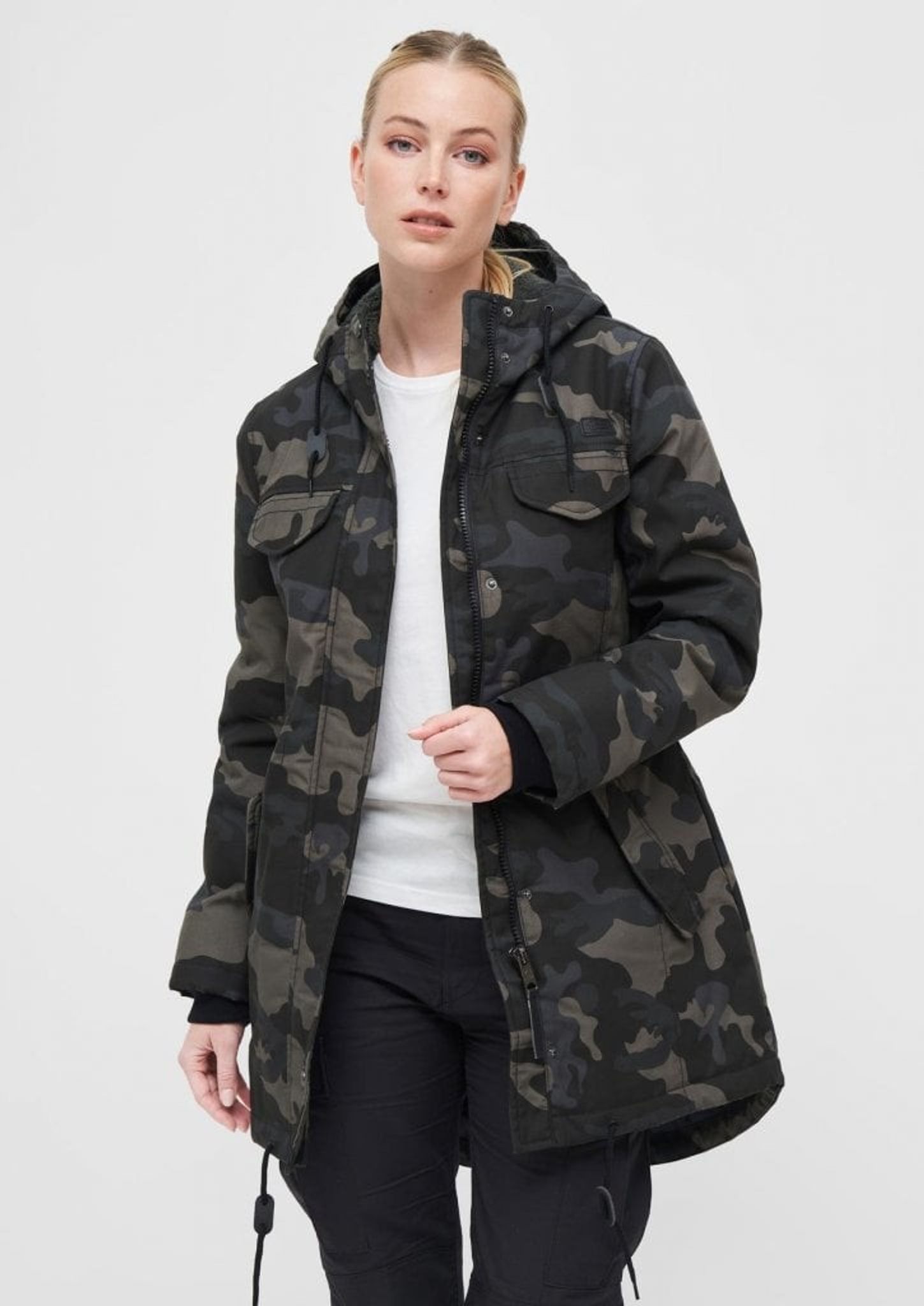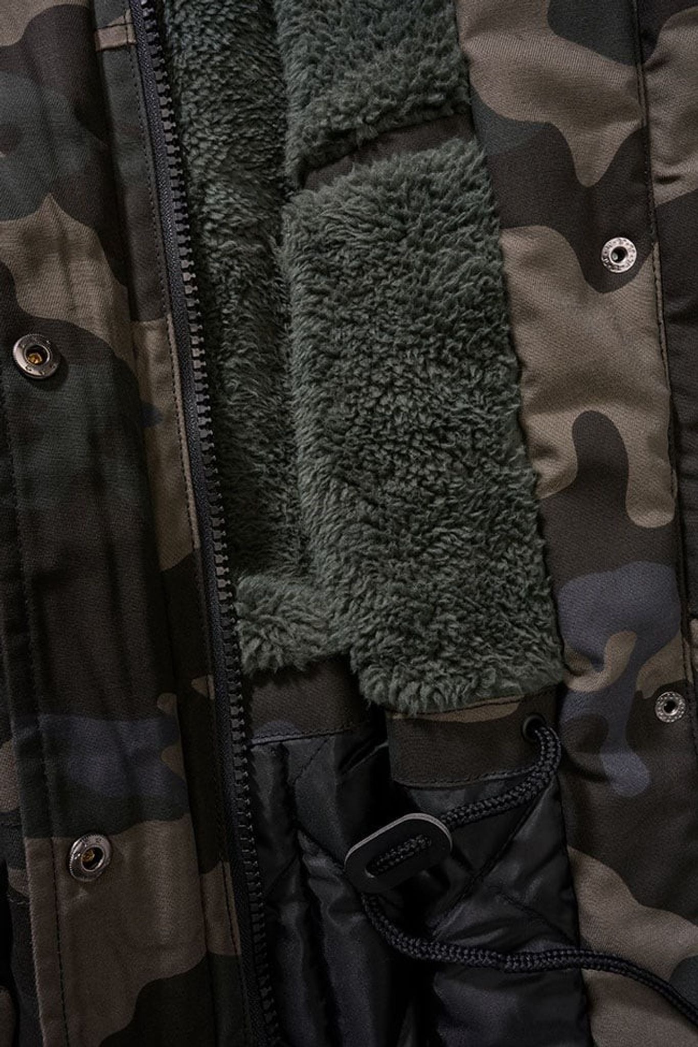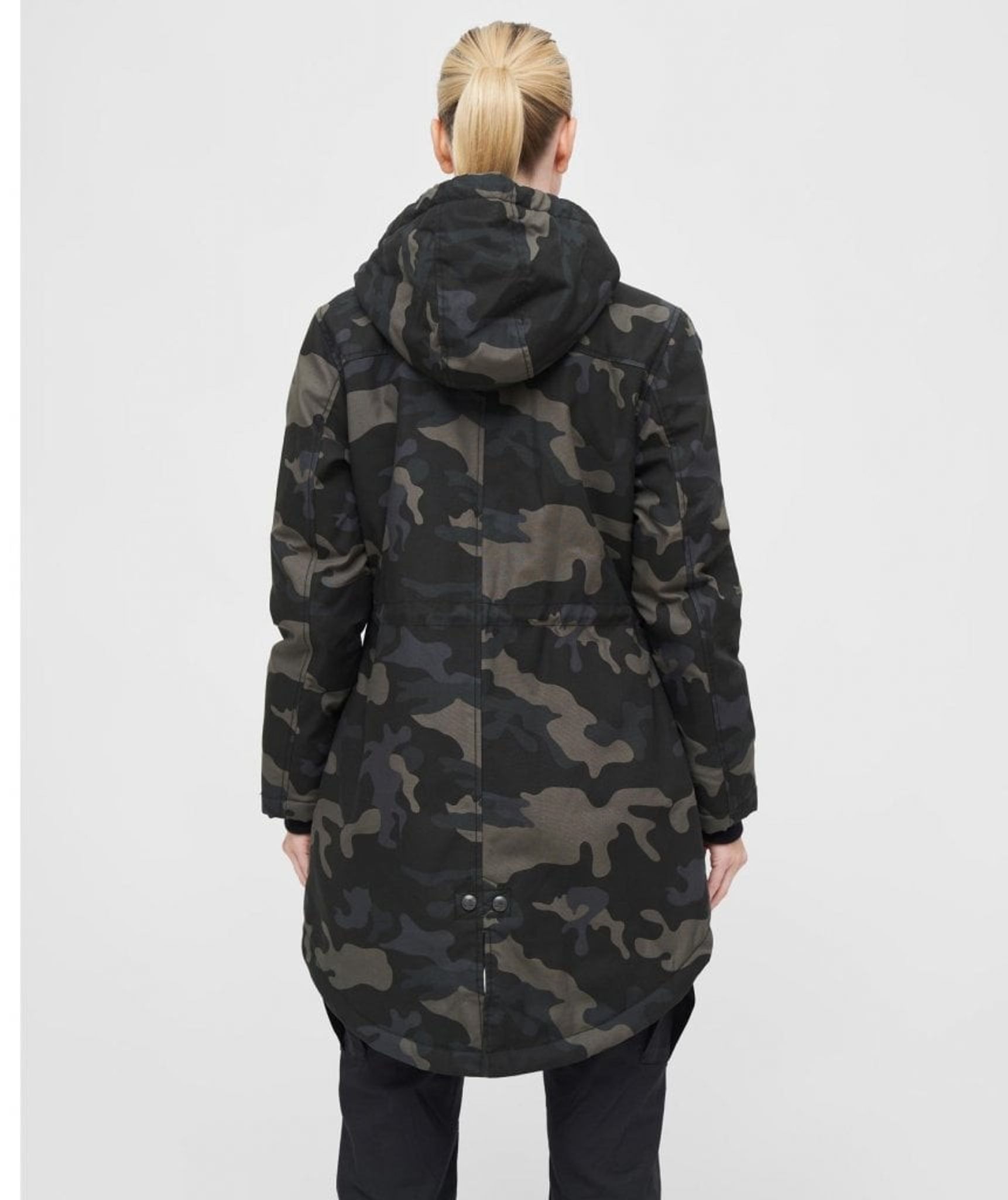 En riktigt snygg och skön parka i det diskreta kamouflaget - darkcamo. Insidan av jackan är klädd i ett quiltfoder med stoppning samt ett mjukt teddyfoder i grått.